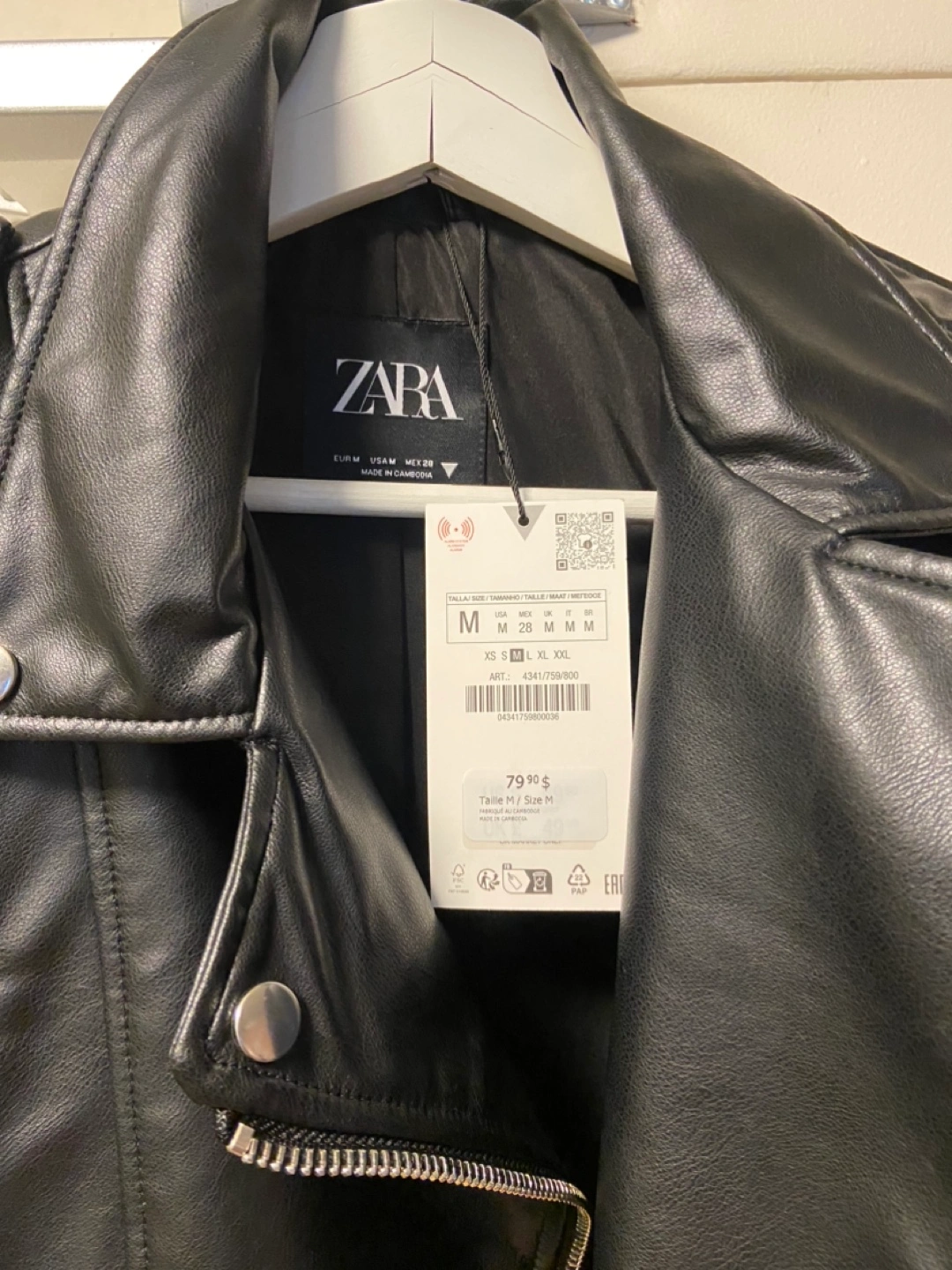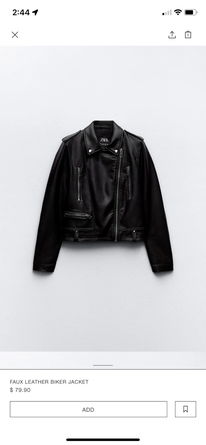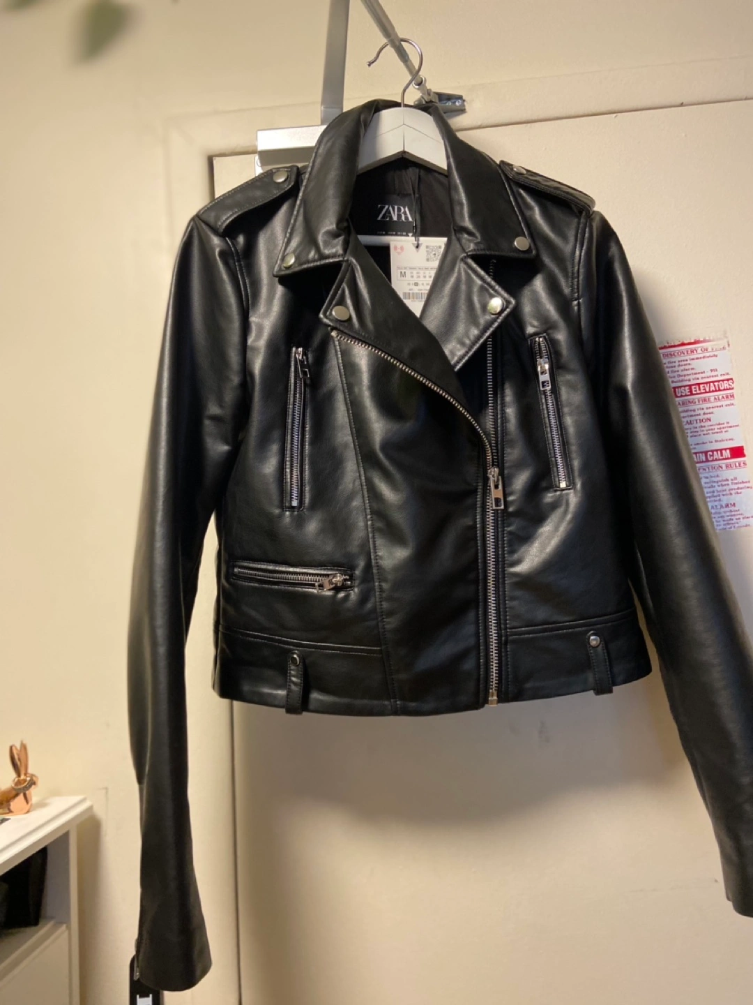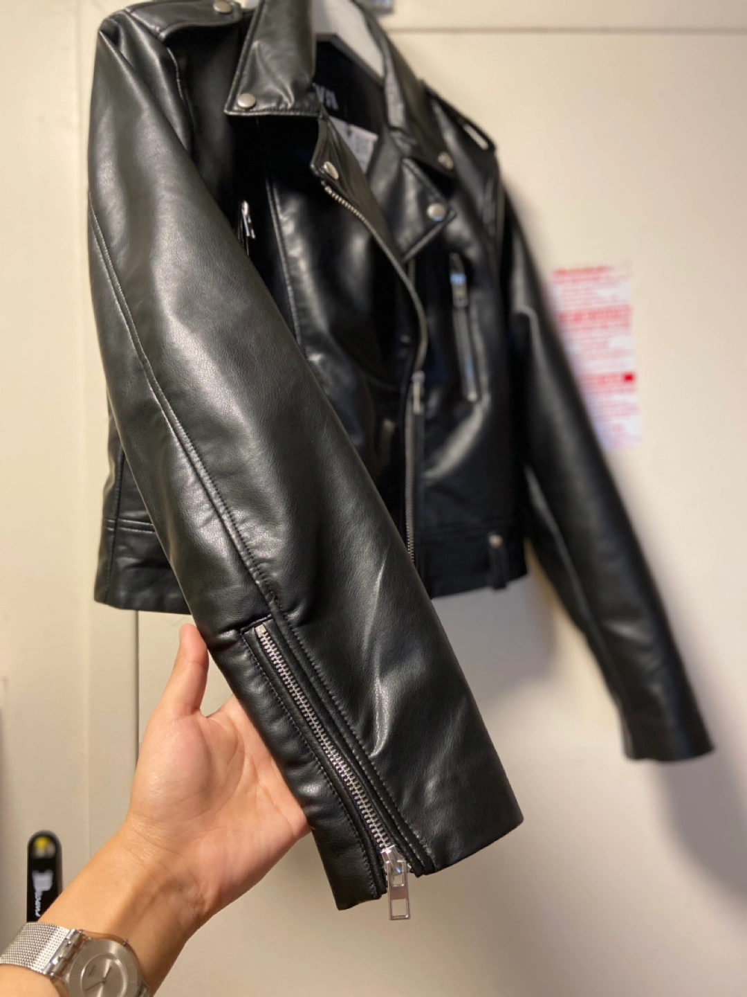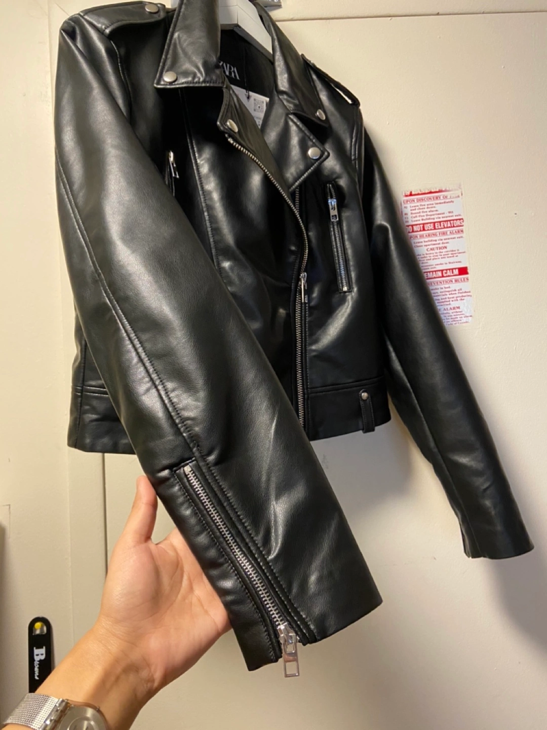26Black faux leather biker jacket. Zipper closure. Multiple pockets. Size runs small.
