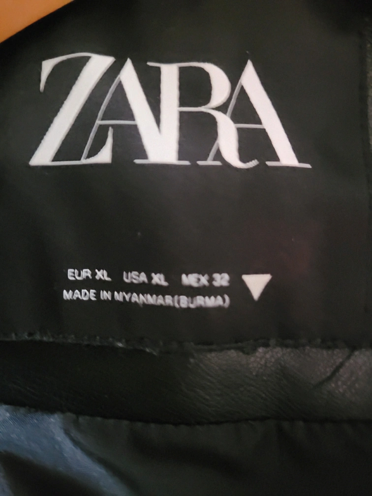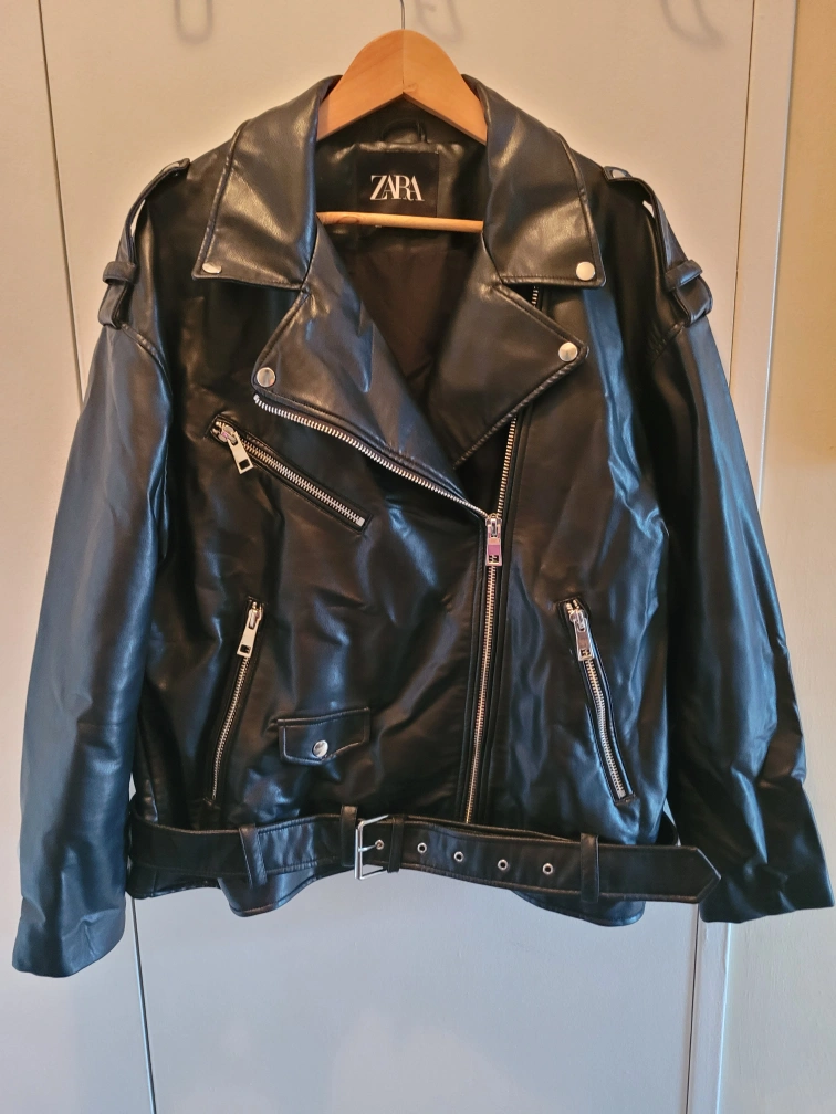 Zara black faux leather biker jacket in size XL. This stylish jacket is in great condition and perfect for adding an edgy touch to any outfit! Features include a belted waist and multiple zipper details.