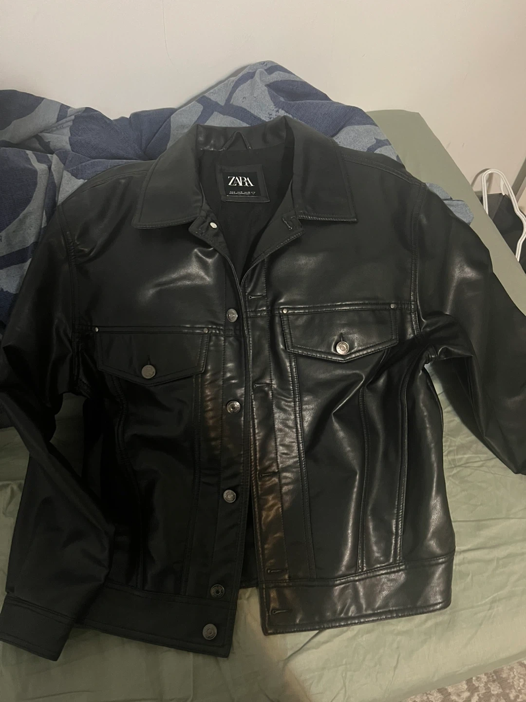 10Selling a stylish black faux leather jacket from Zara! Like new condition The jacket features a classic design with button closures and pockets. A versatile piece for your wardrobe!