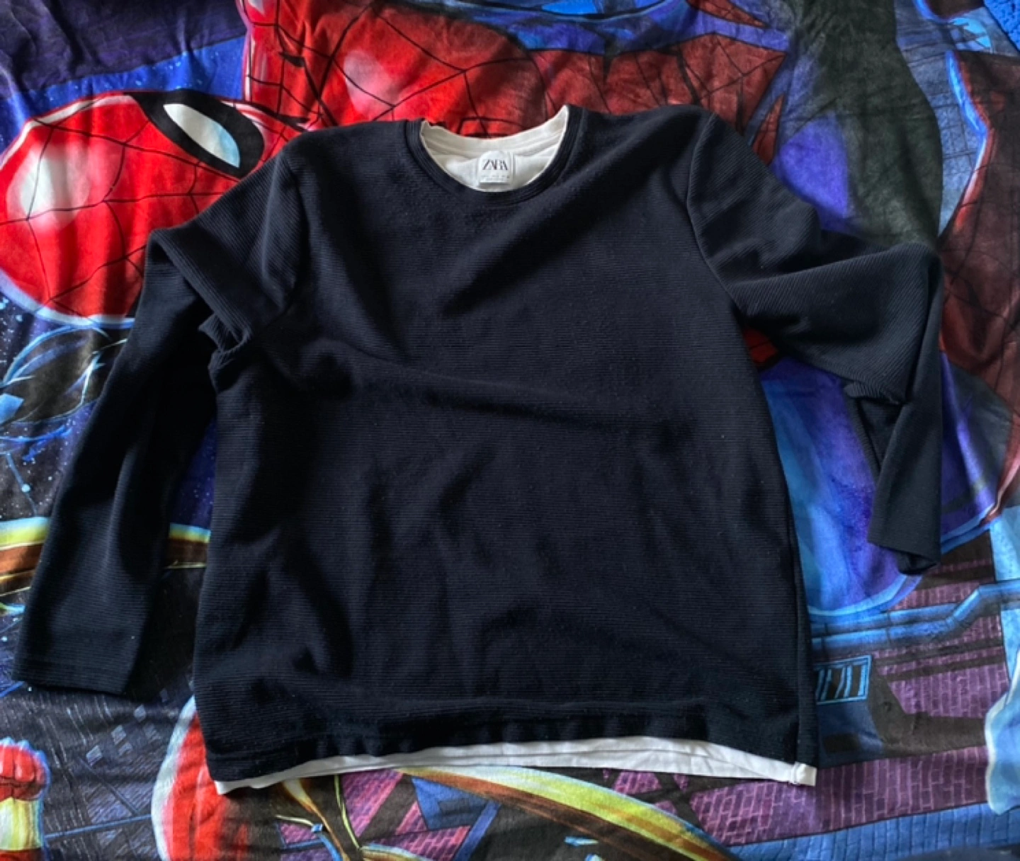 Long-sleeve black shirt. Ribbed texture. Size large. Made in Turkey. Features a white undershirt.