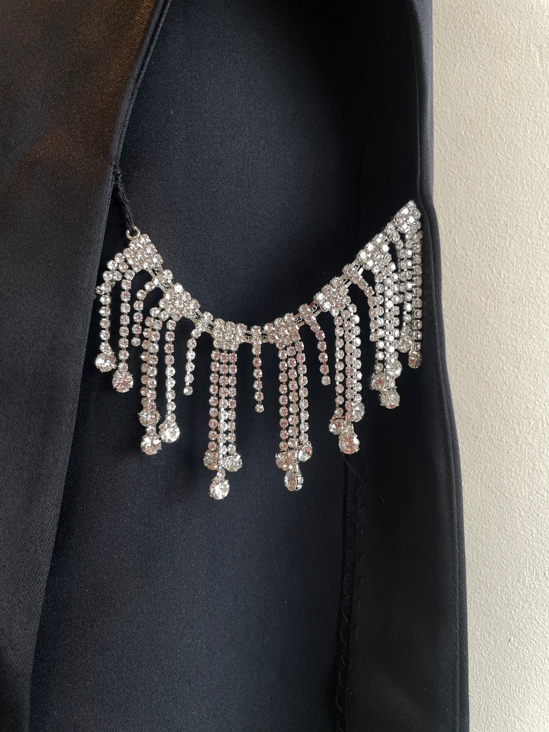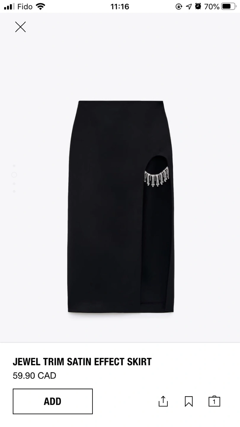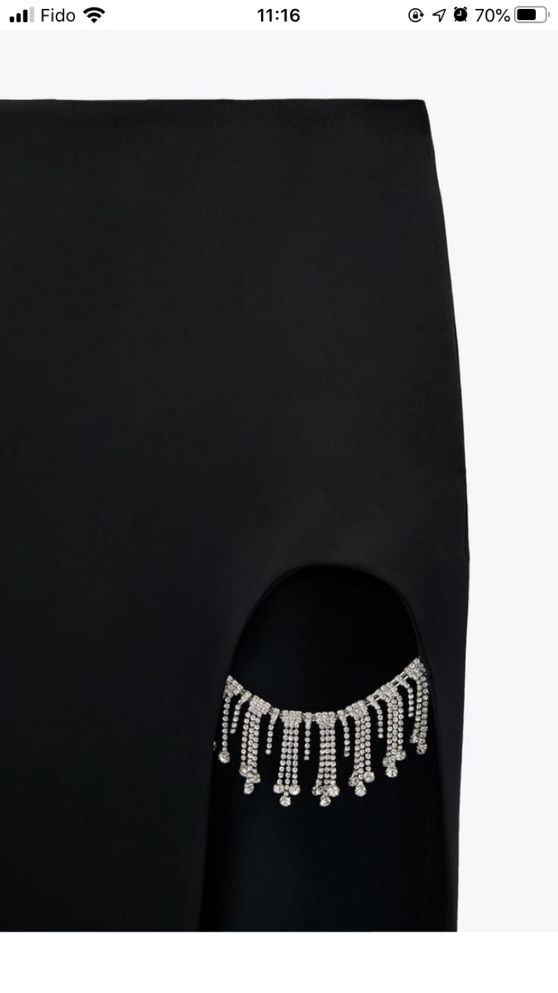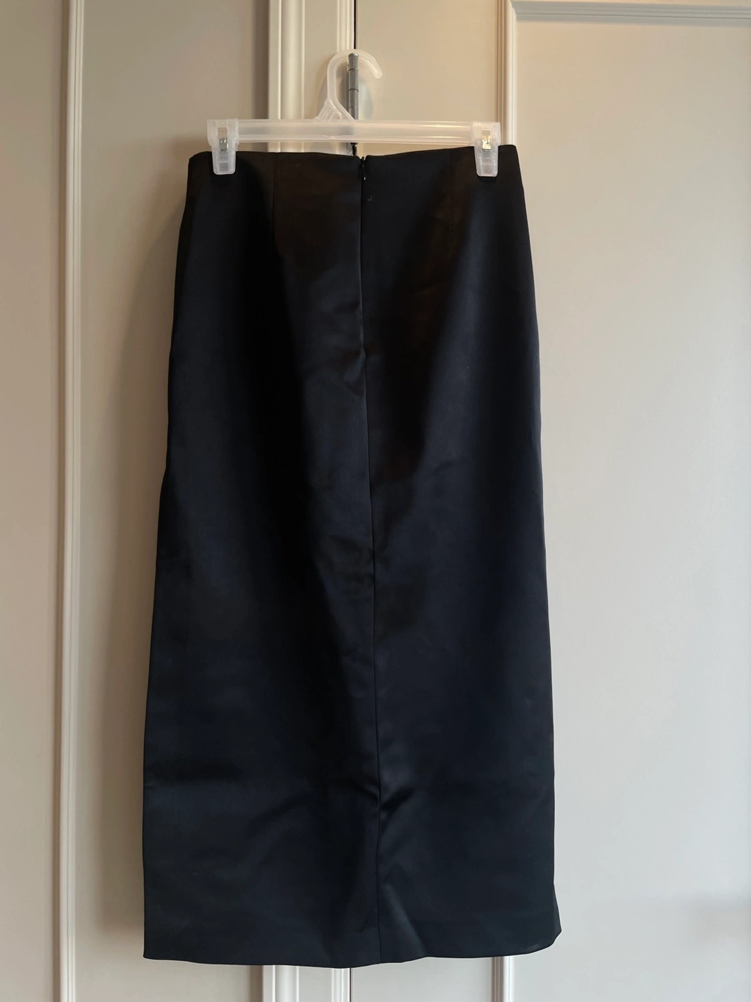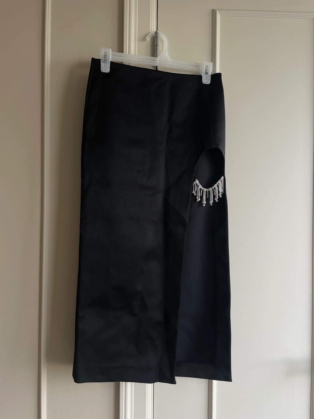 25Stunning black midi skirt. Features a thigh-high slit adorned with a rhinestone embellishment. Size small. Excellent condition.