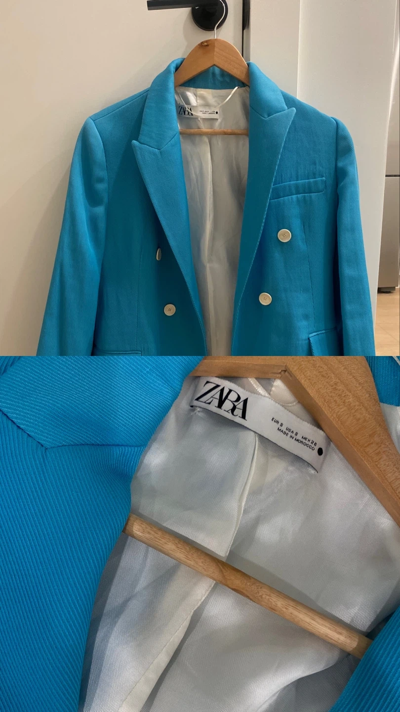 15Selling a Zara blazer in a vibrant blue corduroy! It's a size small and in great condition. Perfect for adding a pop of colour to your wardrobe!