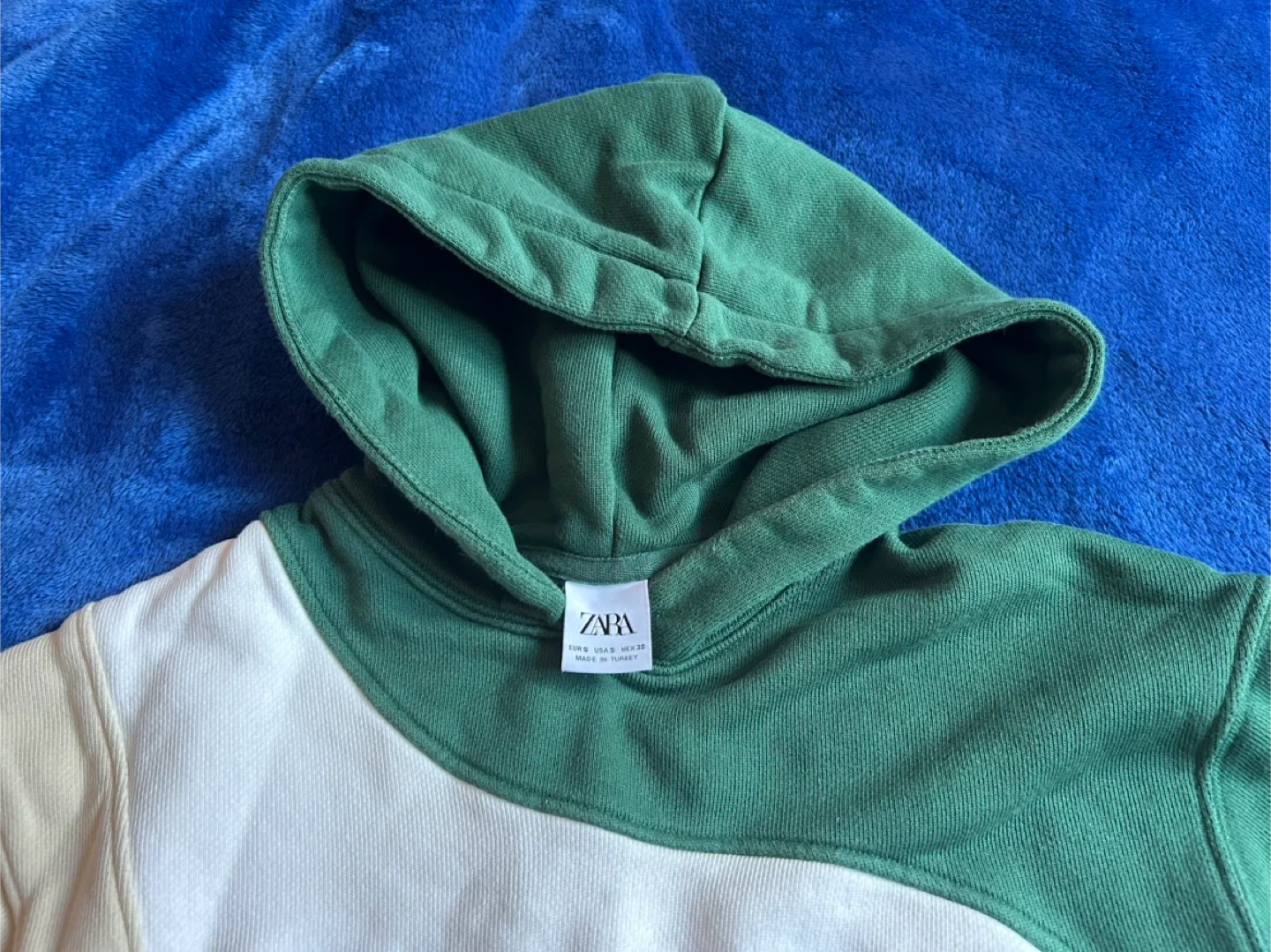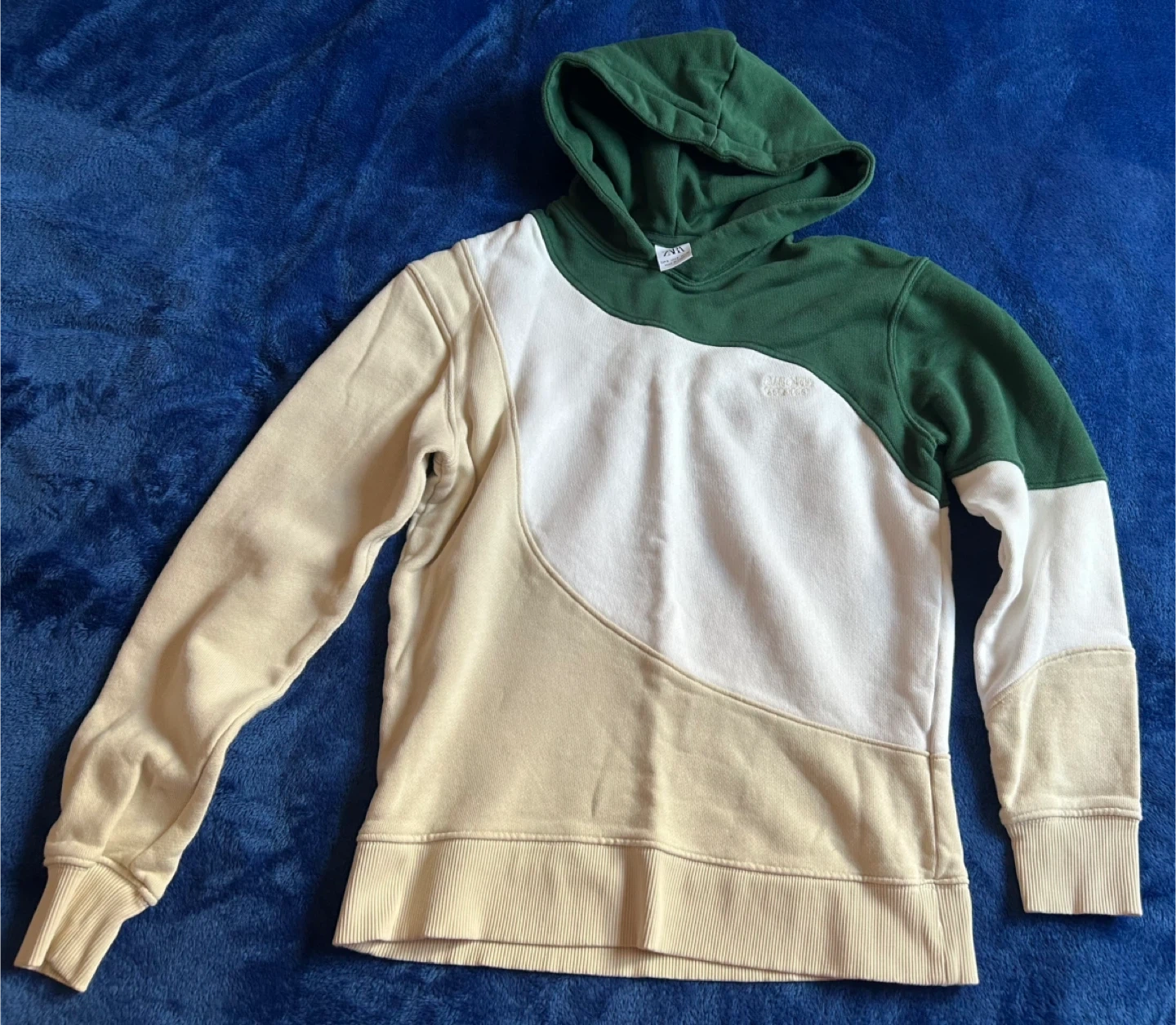 75Selling a Zara colour block hoodie in size small! The colours are a nice mix of green, white, and beige. It's in great condition and ready for a new home