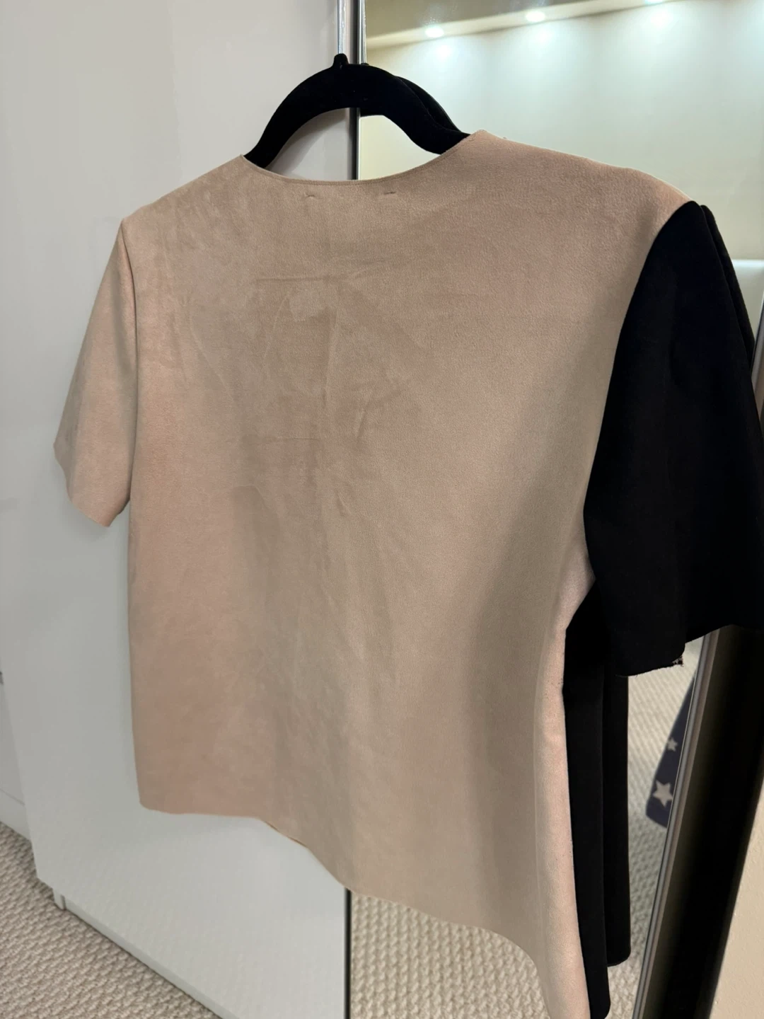 1000+Selling a Zara colour block top in size small. It features a unique design with black, beige, and mustard yellow panels. The material has a soft, suede-like texture. Perfect for adding a stylish touch to your wardrobe!