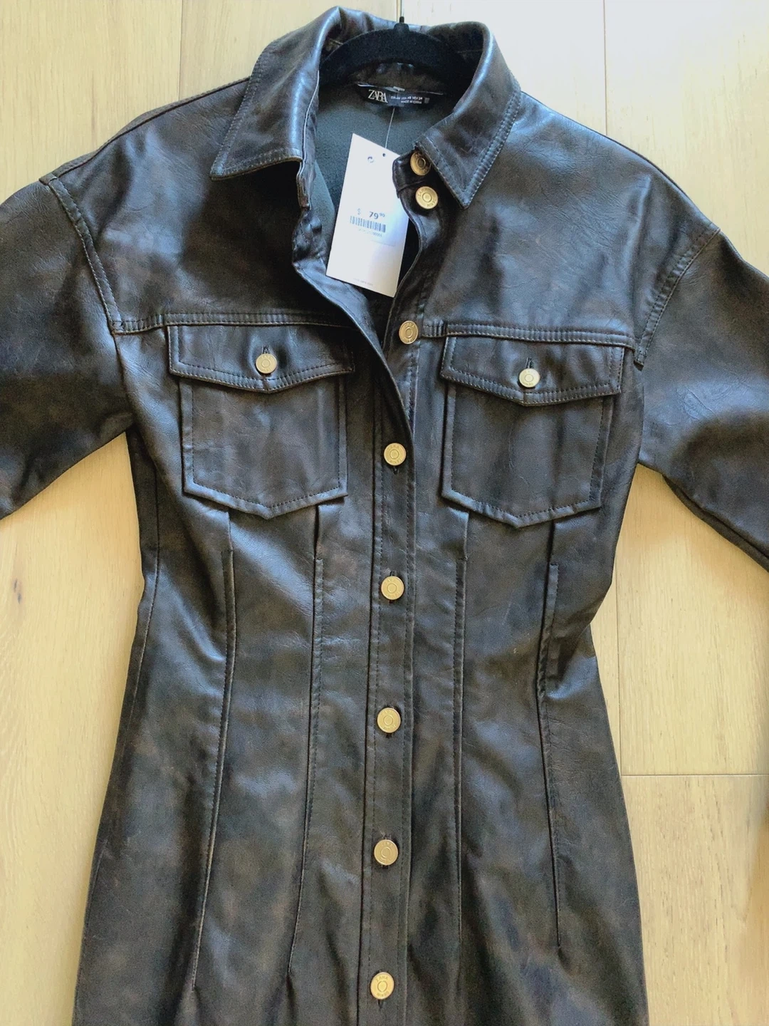 31Zara faux leather shirt dress in a size XS. The dress features a button-down front and two chest pockets. The material has a nice texture and a stylish look. Originally bought for $79.90 Brand new with tag Length 90cm Chest 74cm
