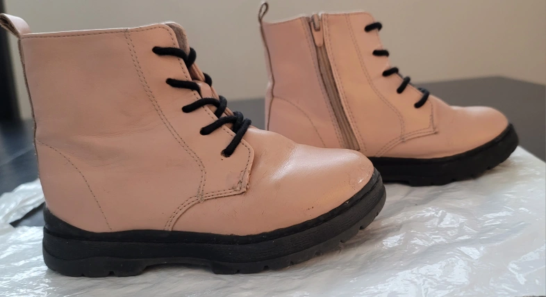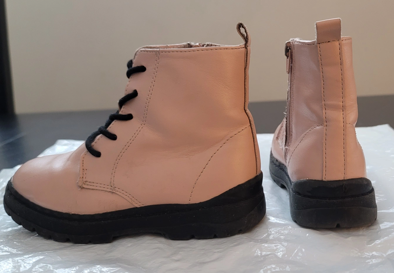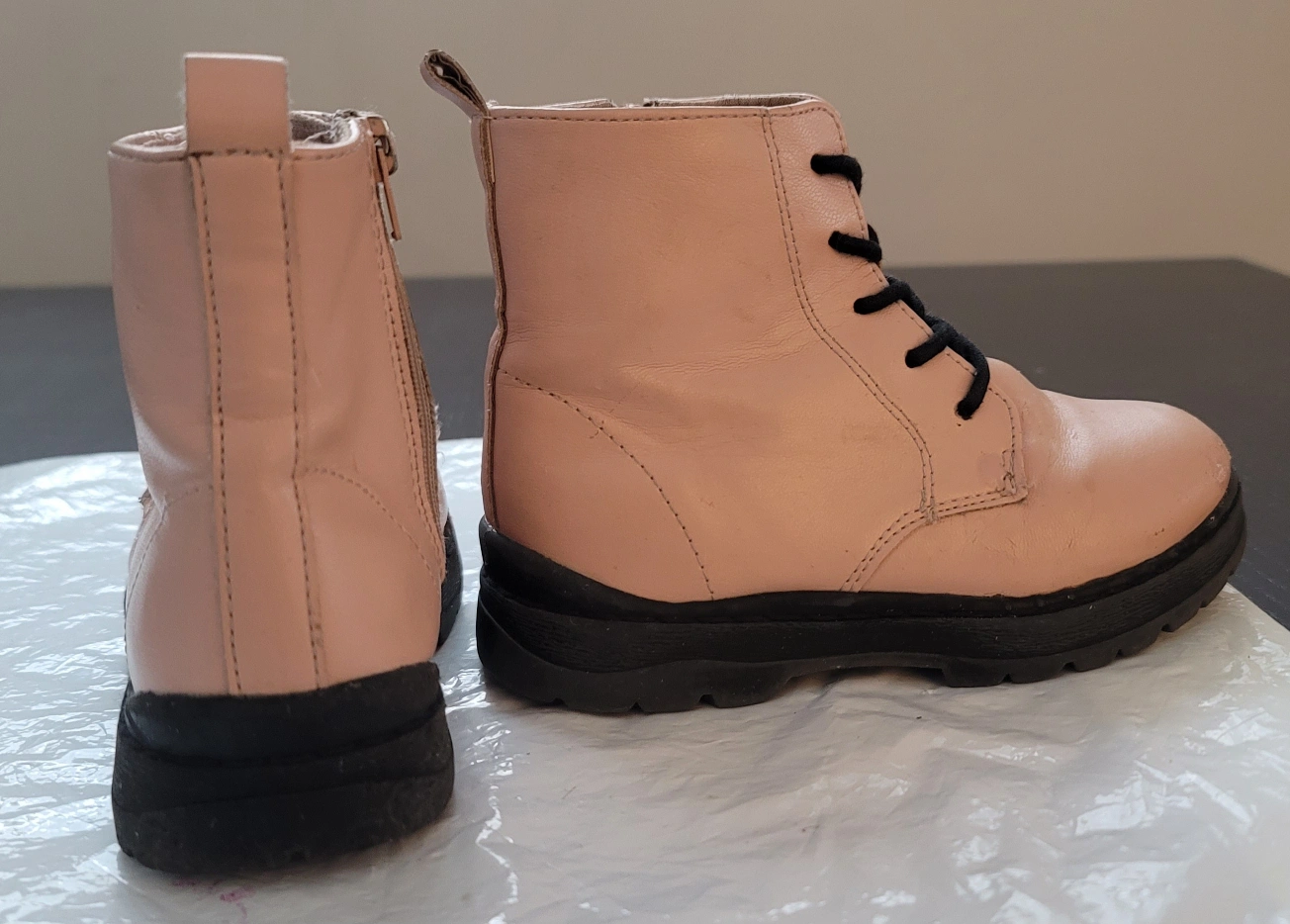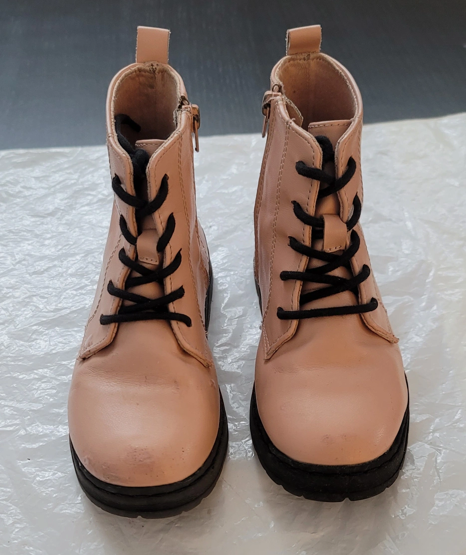 Pair of cute, blush pink leather boots. Lace-up style with side zipper. Chunky black sole. Good for fall or winter.
