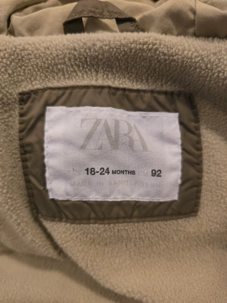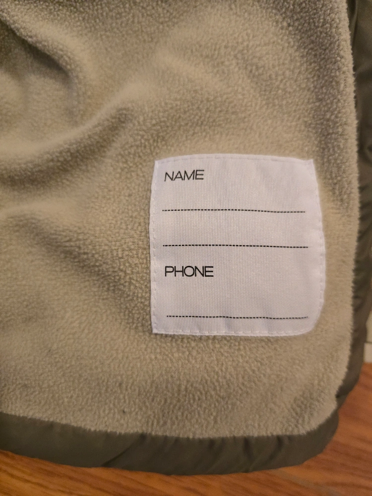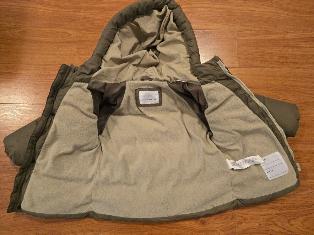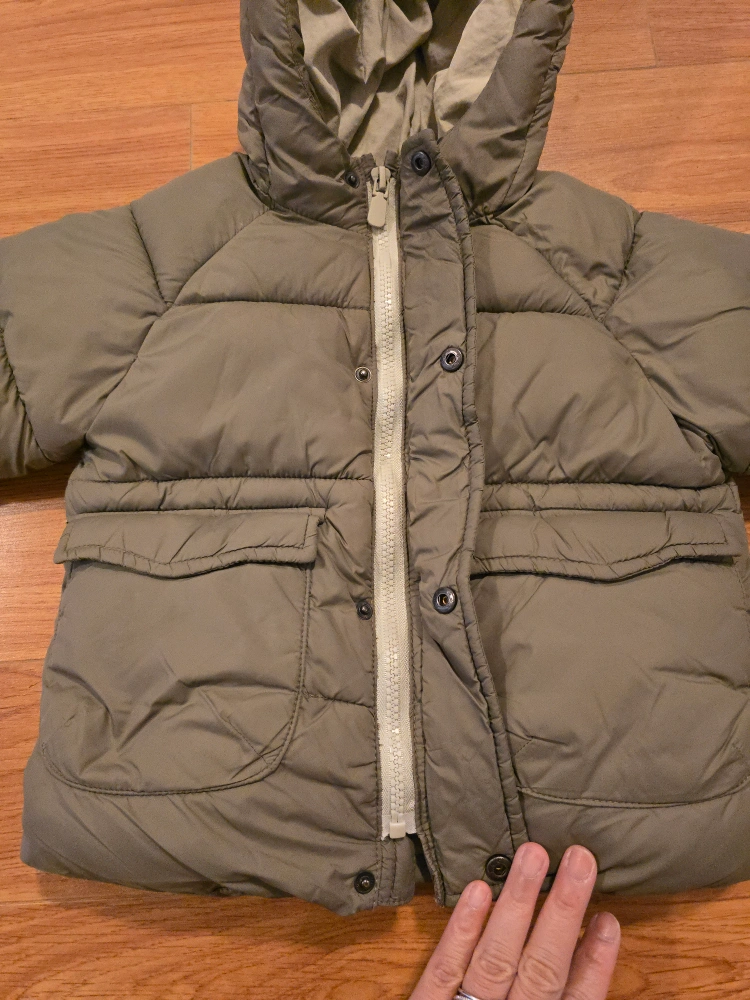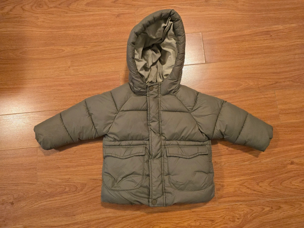 5Green puffer jacket with a hood and a zipper closure. It has two pockets and a fleece lining.
