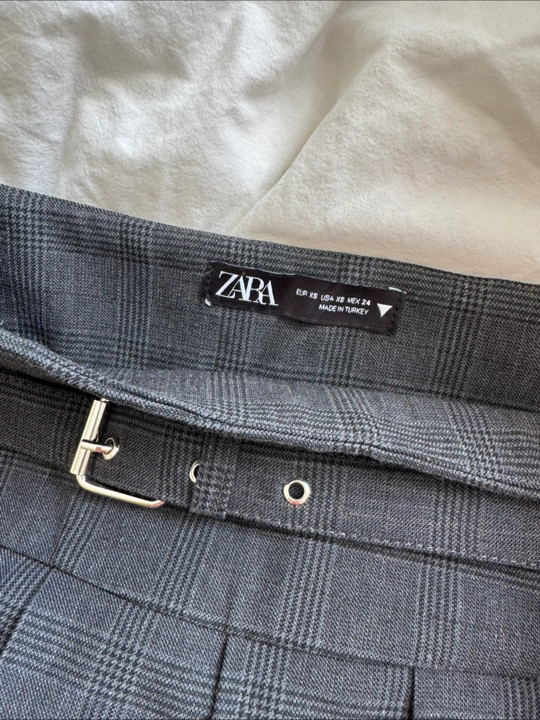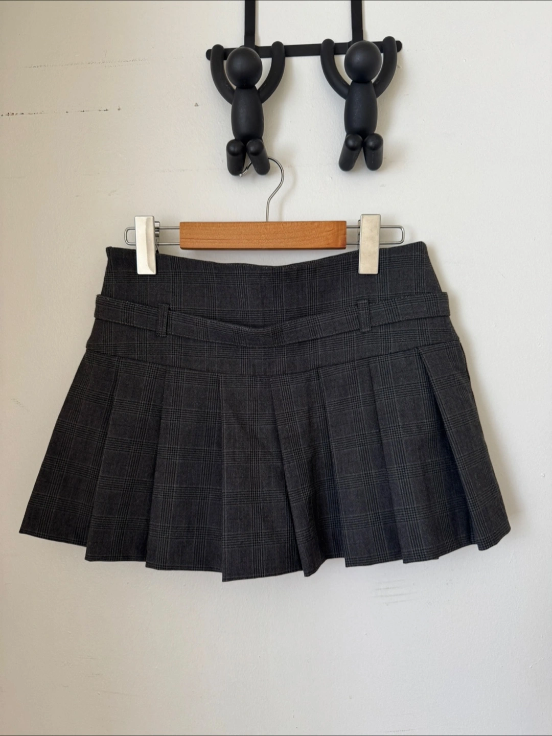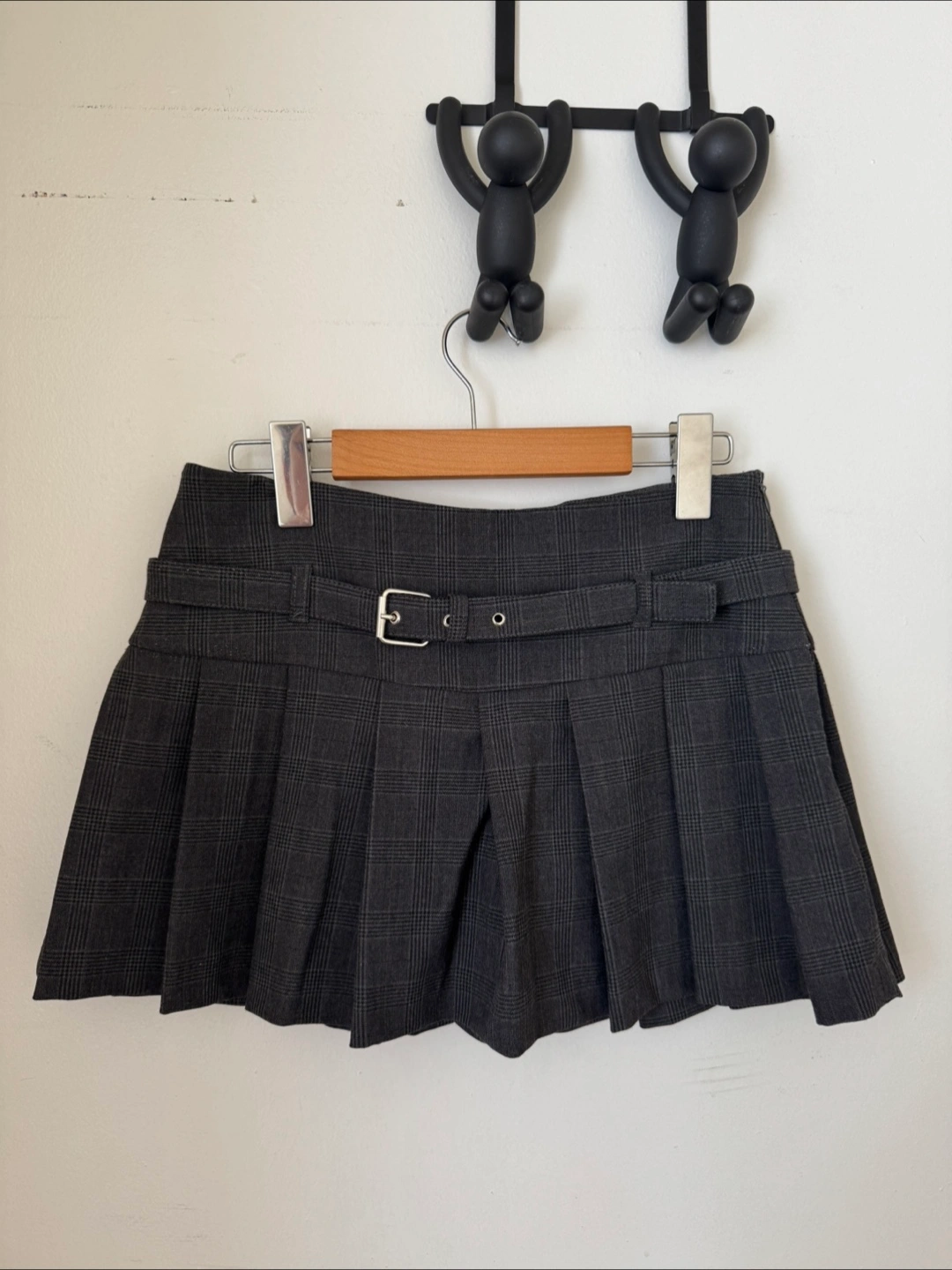 A dark grey skirt featuring a plaid pattern. The skirt has a pleated design, a belt with a buckle. It's a wonderful piece for adding some ease to your daily wardrobe.
