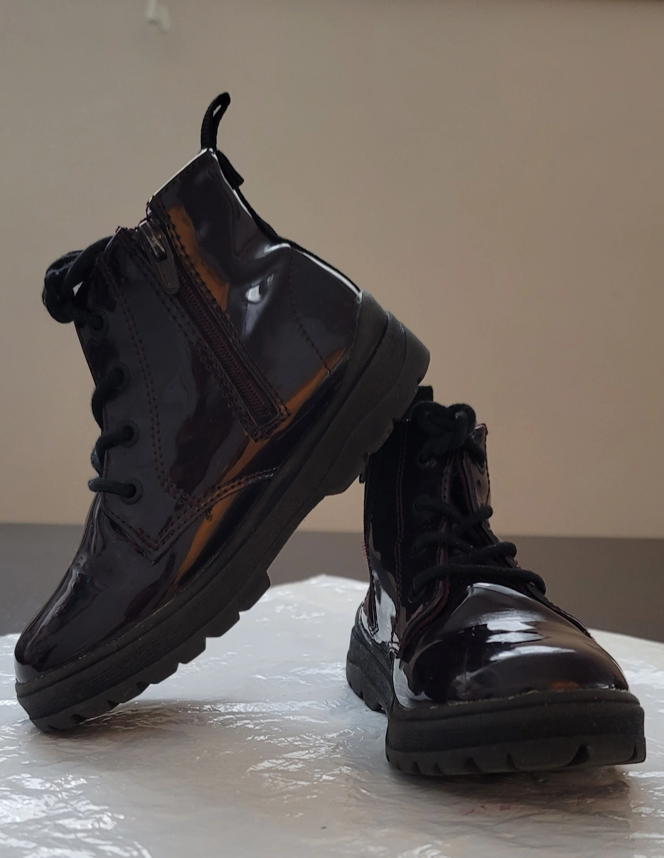 Adorable burgundy patent leather boots. Lace-up style with side zipper. Size 26. Great for fall and winter.