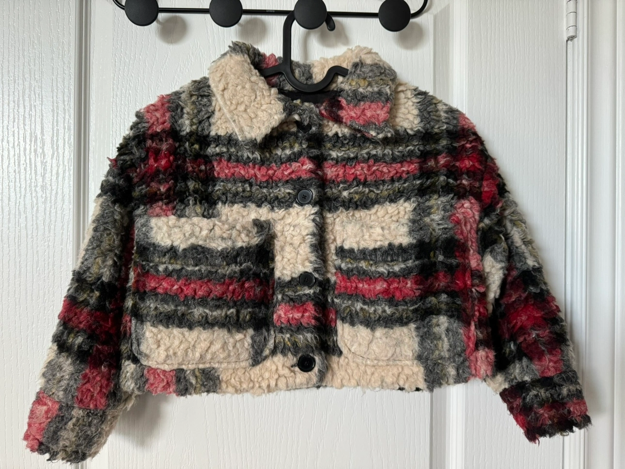 140Pick up at 4476 16th Ave, Markham Zara Kids Girls Crop Jacket. A warm and cozy plaid sherpa jacket. This jacket has a button closure and two pockets. It is a great option for keeping warm on chilly days. ***Low ball offer will be ignored ***Cash only