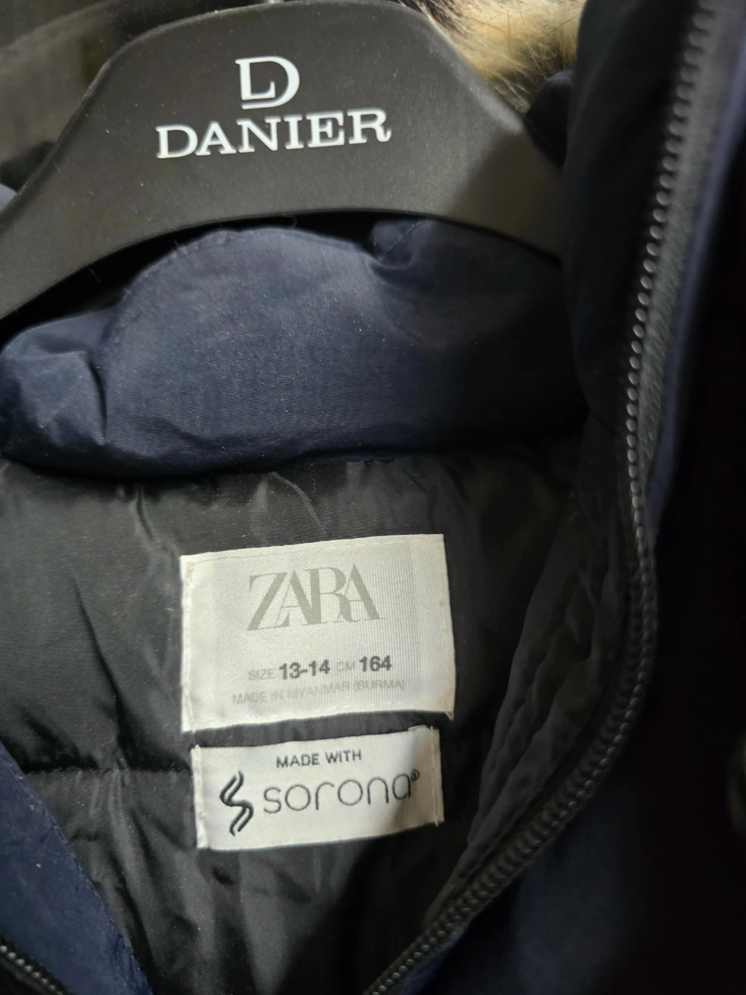 121This Zara Kids winter parka is in great condition and ready for the cold weather! It's a size 13-14 (CM 164) and comes in a stylish navy blue colour. The hood has a faux fur trim, and the jacket is made with Sorona material, making it nice and warm Steeles and yonge