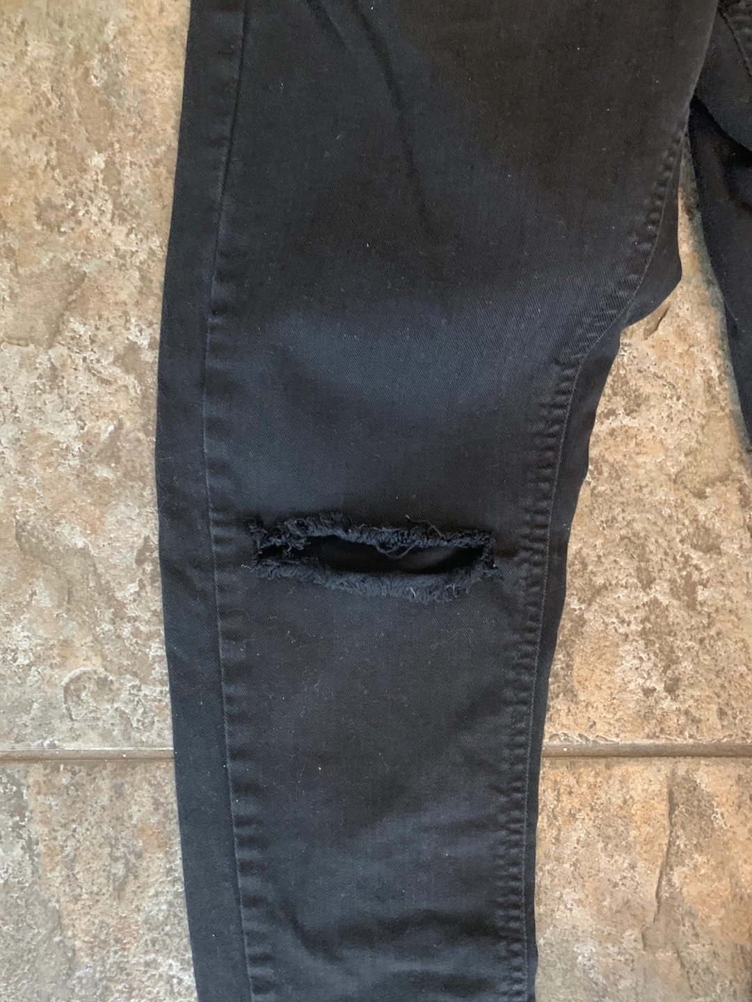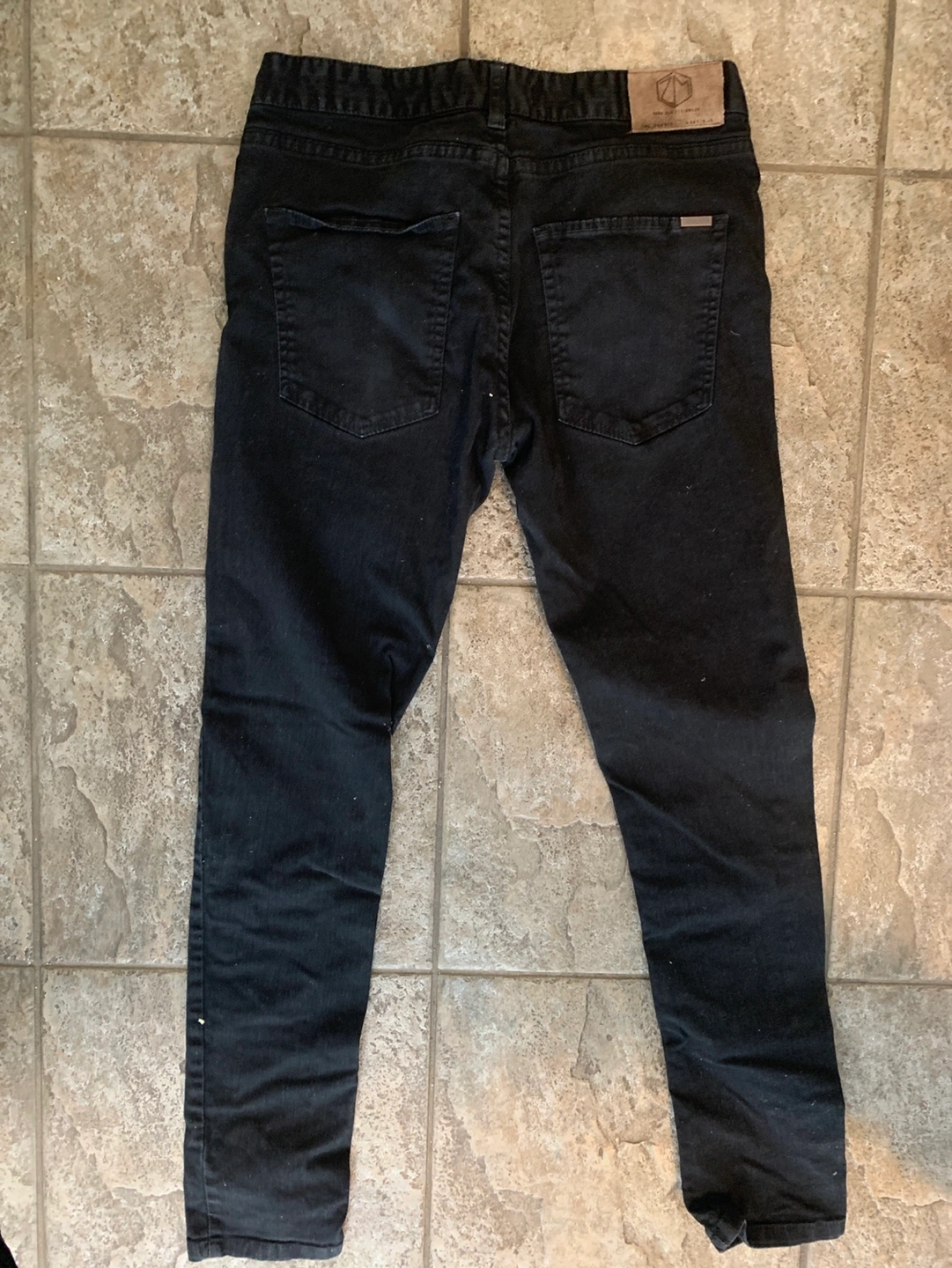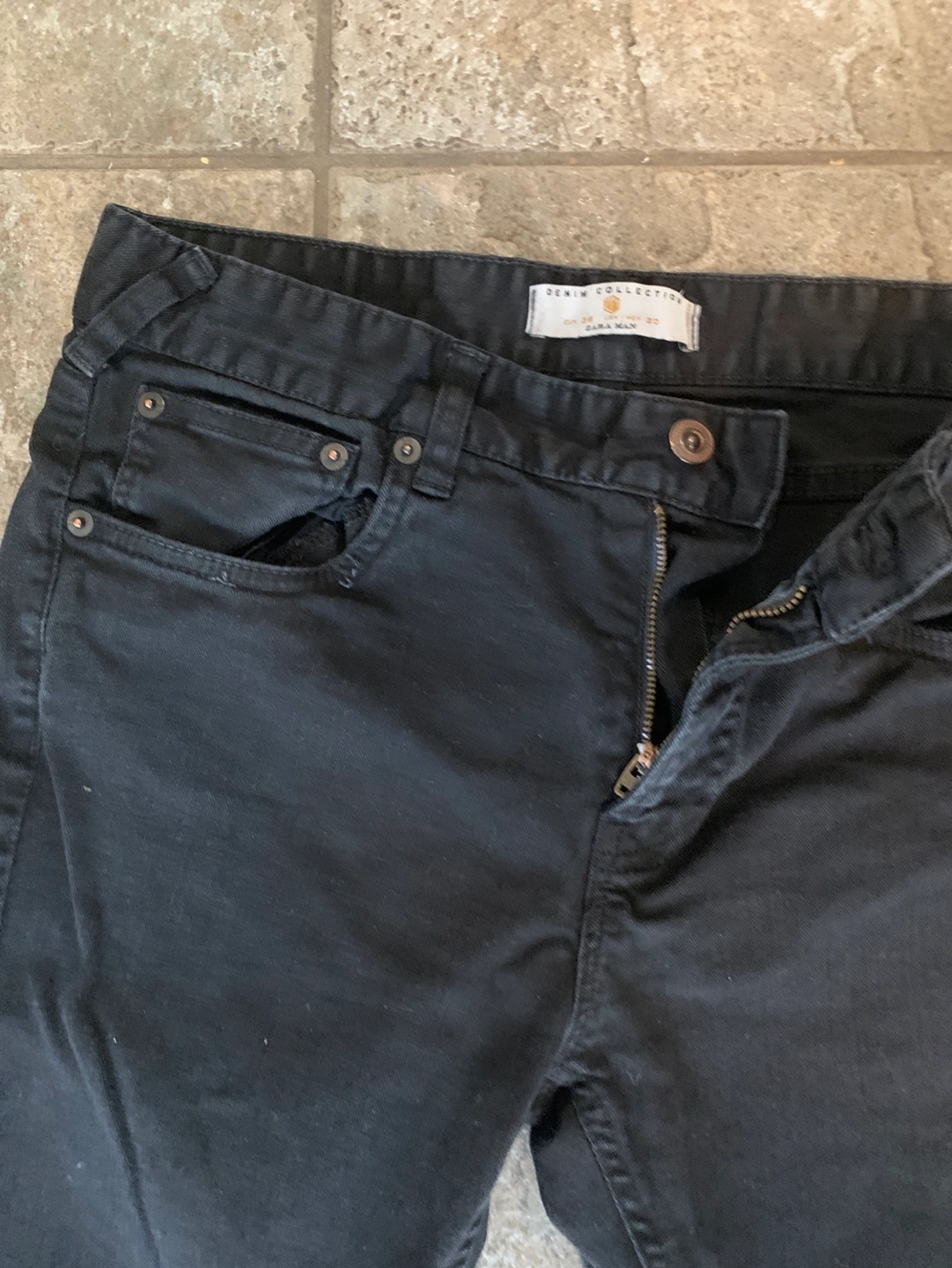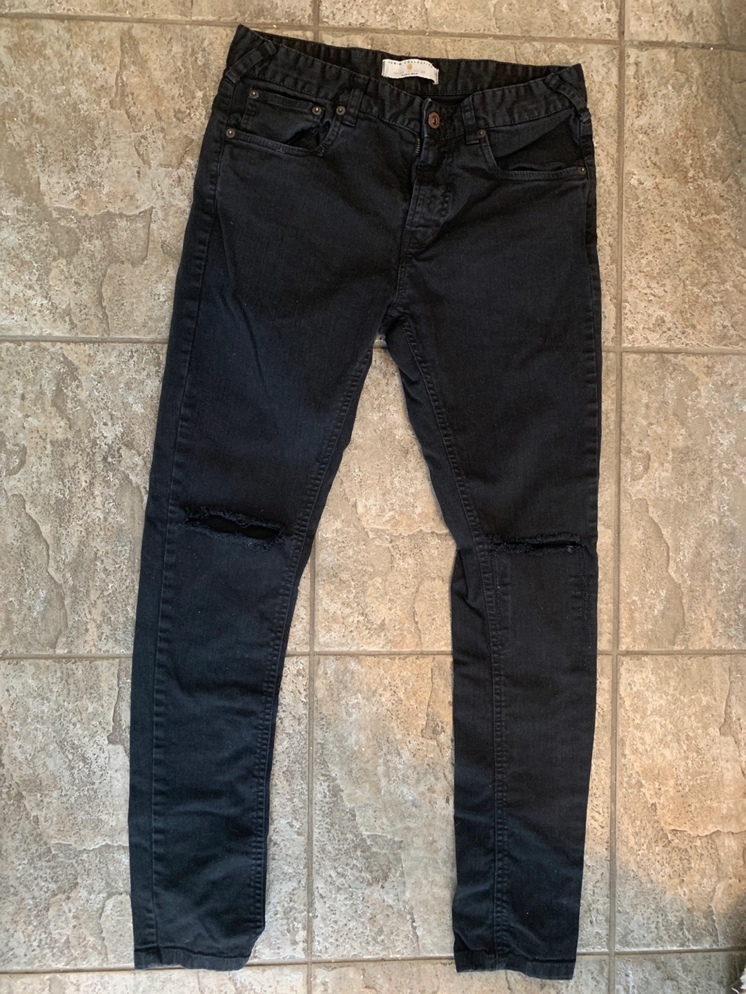 Men's black denim jeans. Size 30. Distressed knees. Slim fit. Zipper fly. Pockets in back and front.
