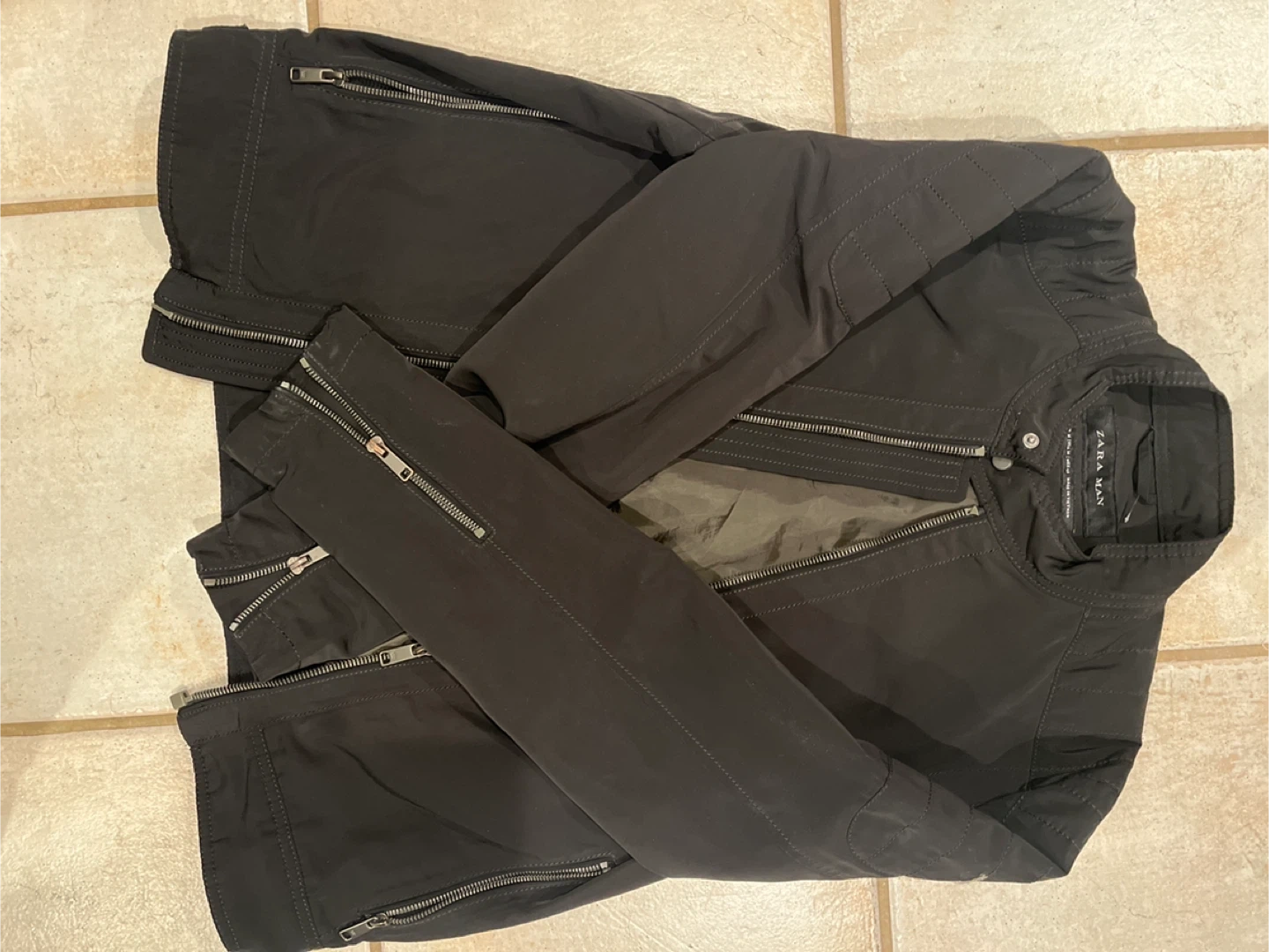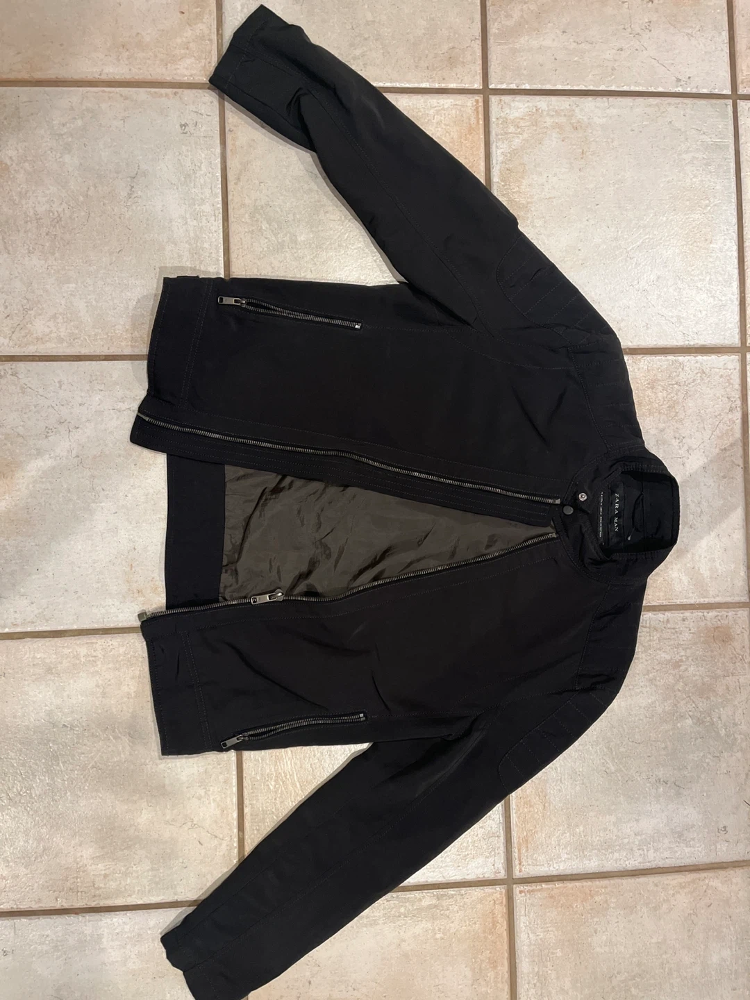 Zara Man black jacket in size medium. It's in great condition and perfect for layering! Features a stylish design with zippers and buckle details on the back. A versatile piece for any wardrobe