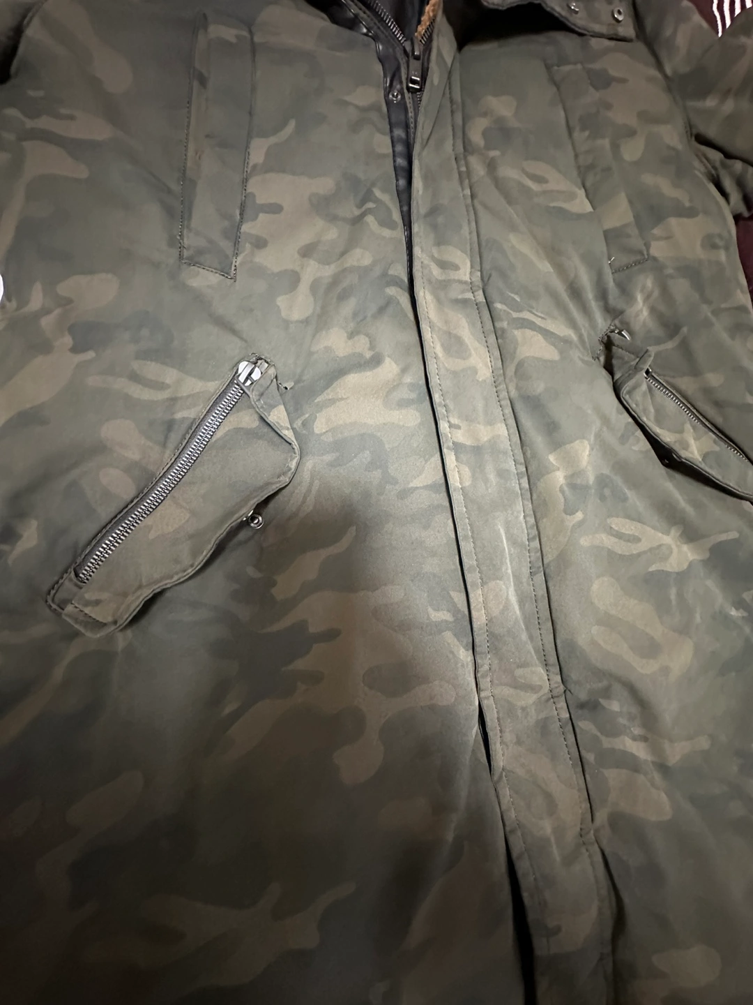 Men's camouflage parka. Features a sherpa-lined hood and multiple pockets. Long length, zipper closure.Work once.