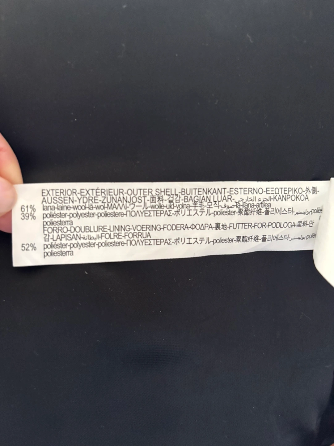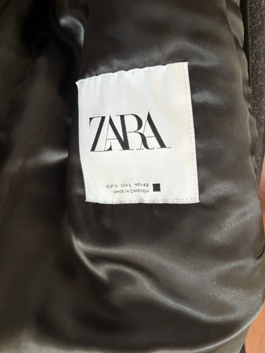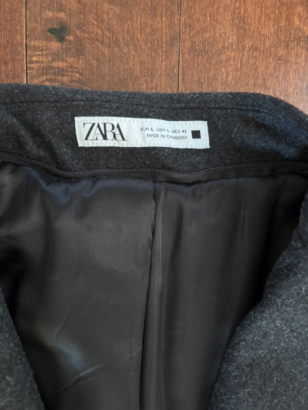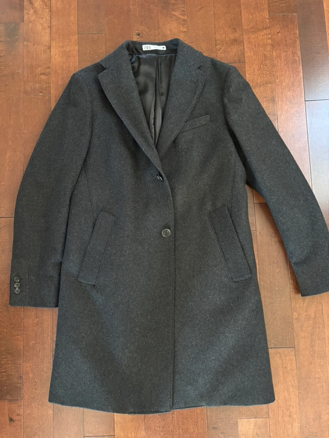 Long charcoal grey wool blend overcoat, two pockets. Size Large. Made in Cambodia. Good for winter and fall size large like new smoke free house
