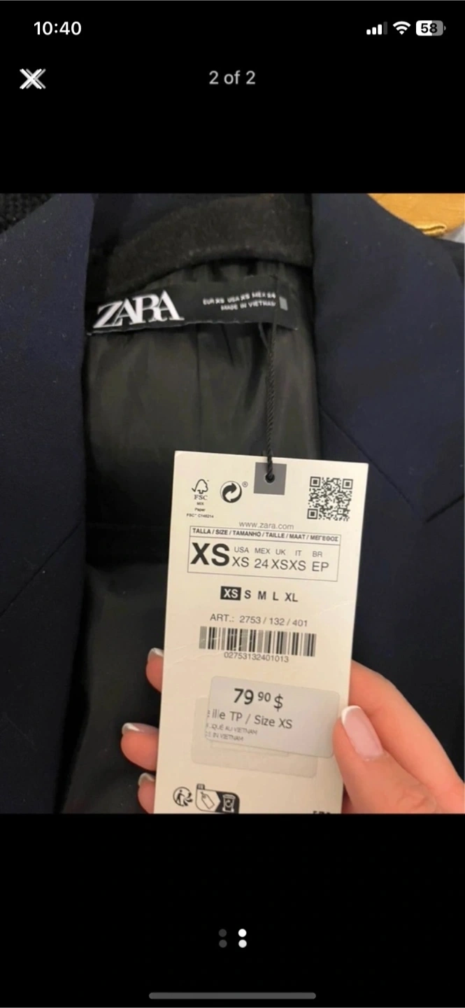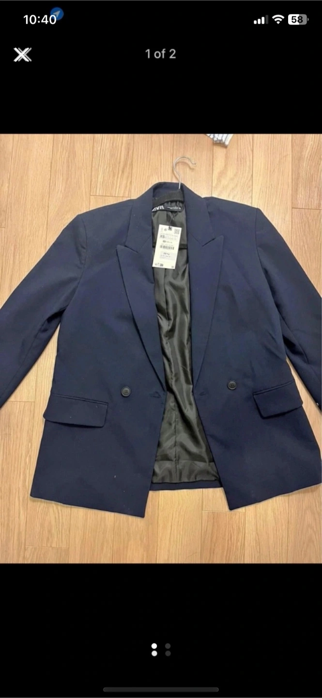 Beautiful navy blazer. Features a classic double-breasted design. Includes a tag. A perfect wardrobe staple for a polished look.