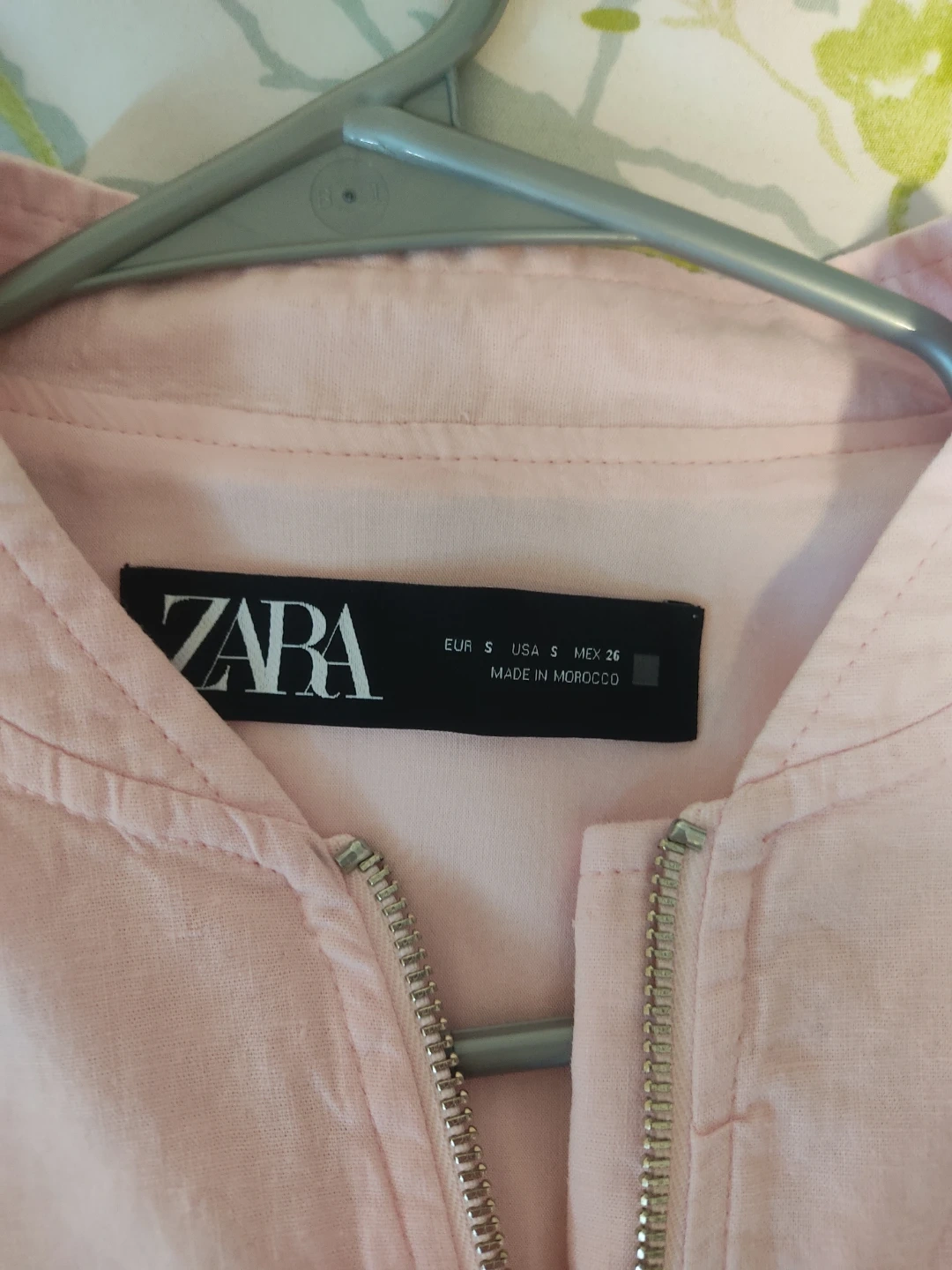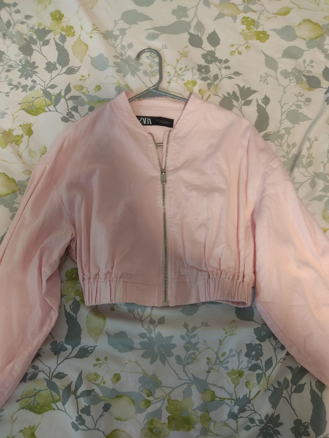 Selling a cute Zara cropped bomber jacket in a lovely light pink colour! It's a size small and made in Morocco. Perfect for layering or adding a pop of colour to your outfit!