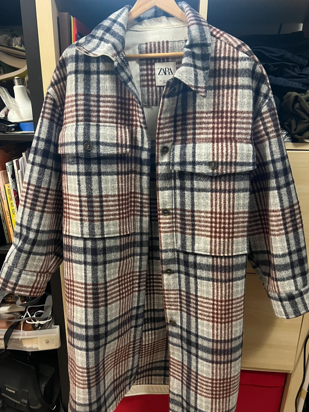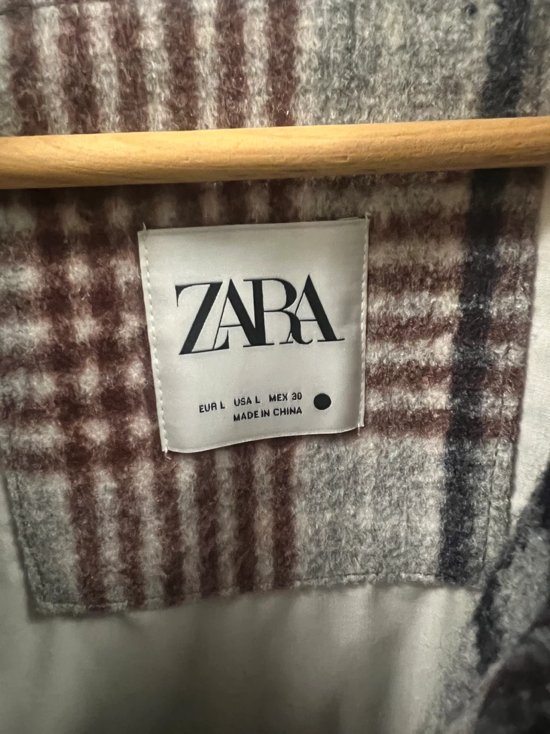 Selling a Zara plaid wool blend overshirt in size L. It's in great condition and perfect for layering during the cooler months. The material is a cozy wool blend, and the plaid pattern is super stylish! This overshirt features a classic design with button-up closure and chest pockets. It's a versatile piece that can be dressed up or down