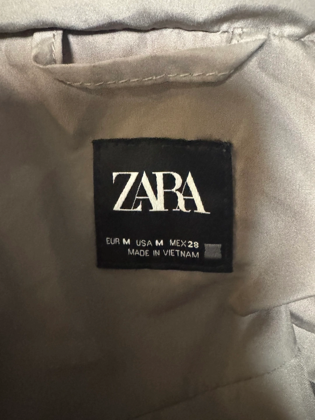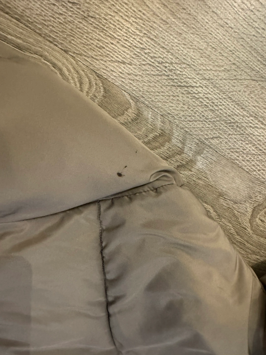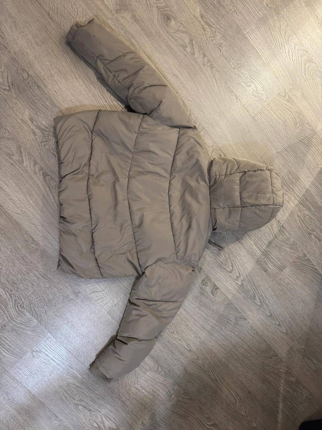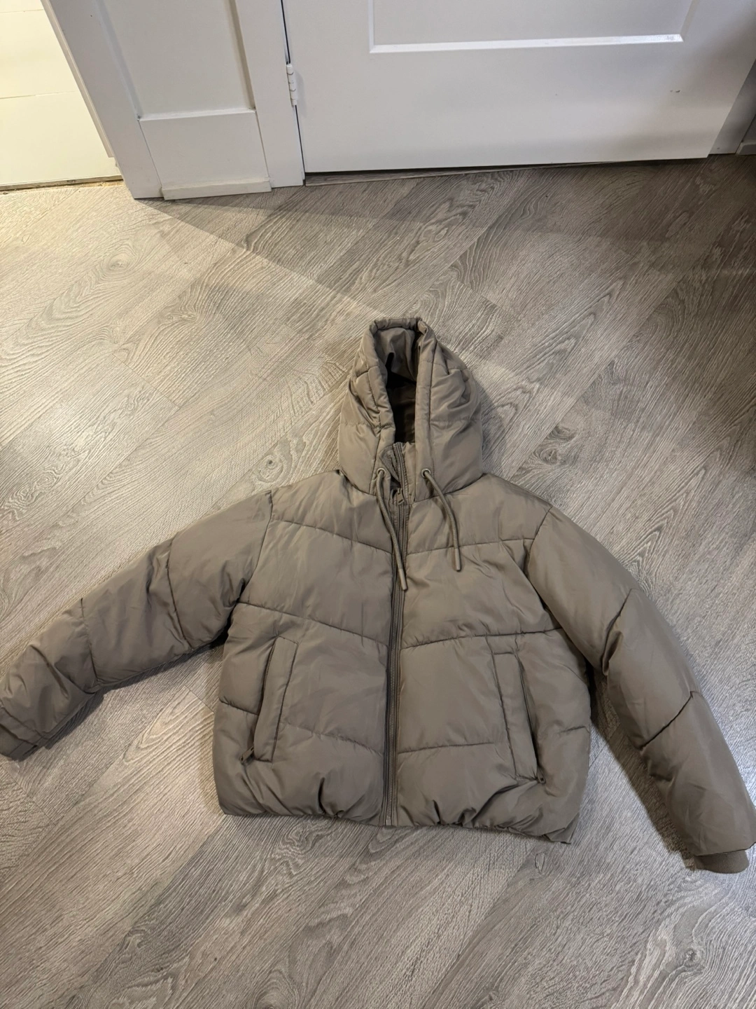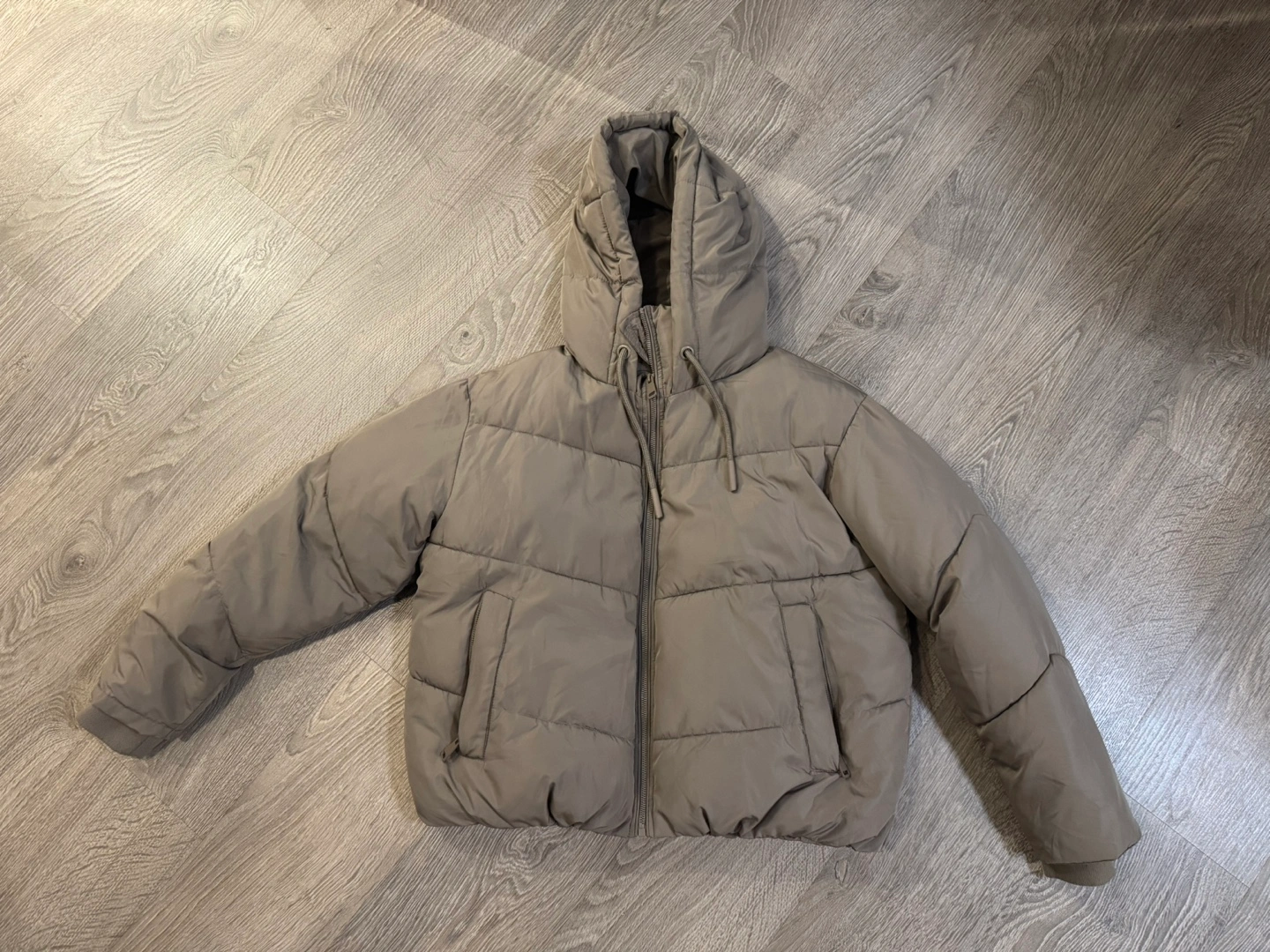 Women's taupe puffer jacket. Features a hood and zip closure. Size Medium. Small mark (as seen in pic)