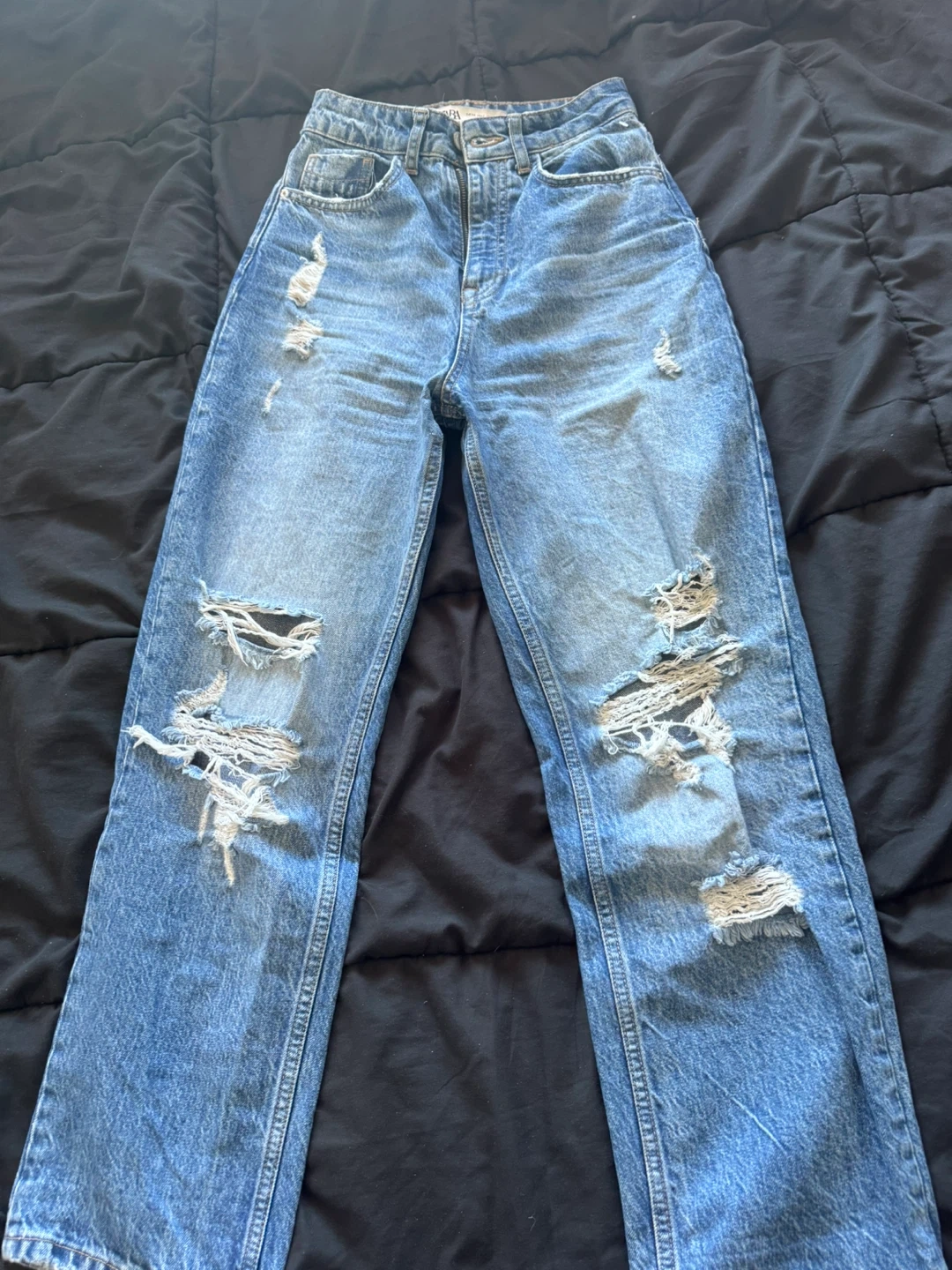 76Selling a pair of Zara ripped jeans in a size 2. They are in good condition and have a stylish, distressed look. Perfect for a casual outfit! Willing to trade similar style but bigger size