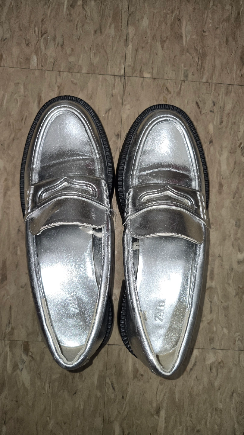 733Selling a pair of Zara silver loafers in size 7. They're in great condition and ready for a new home! The colour is a shiny silver with a black sole.