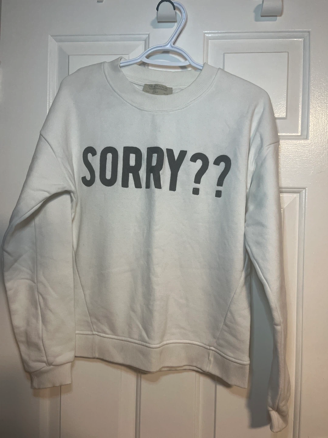 49Cozy Zara Trafaluc sweatshirt in a crisp white colour! It features the text 'Sorry??' on the front. Size small and in great condition.