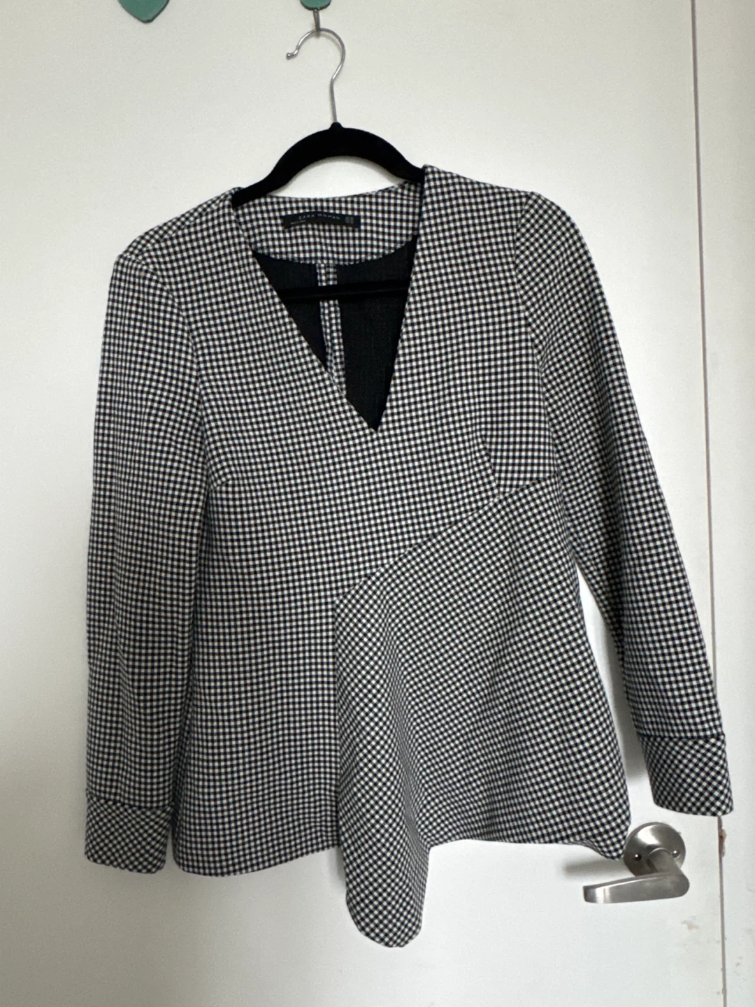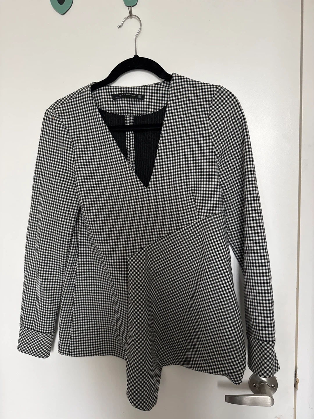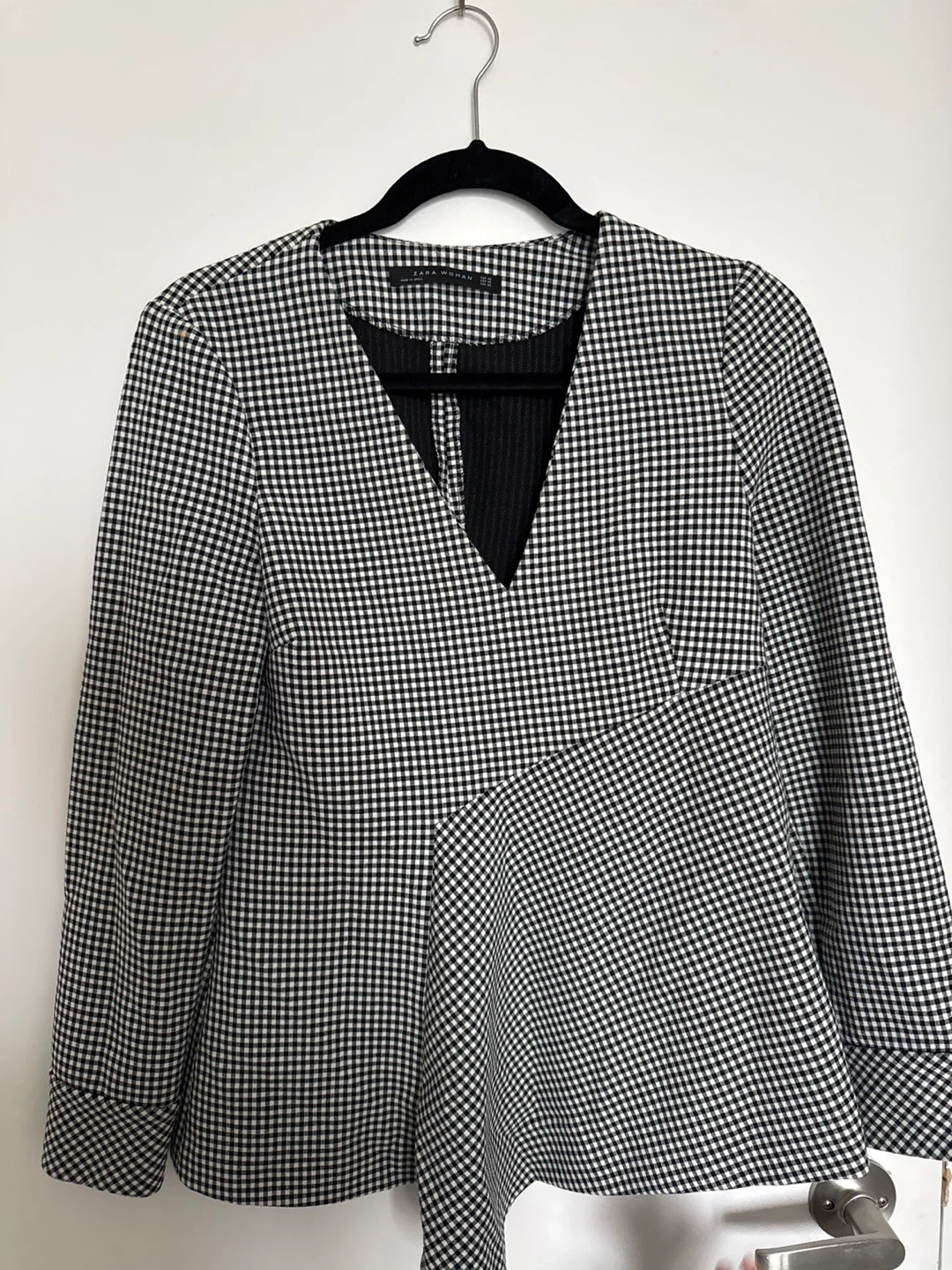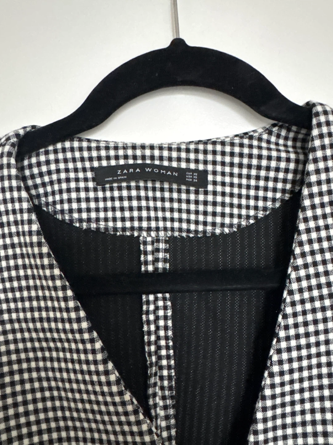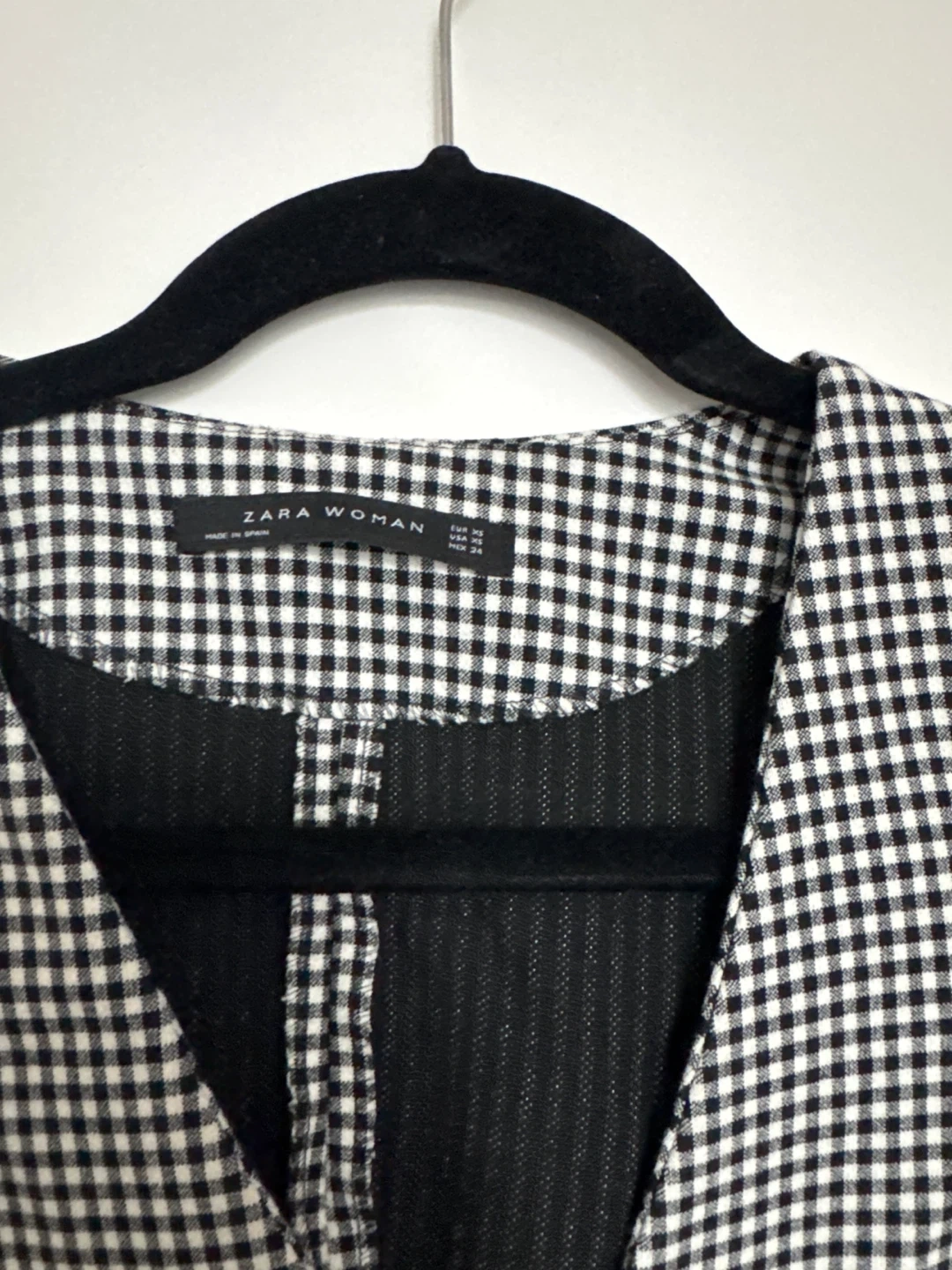 105Cute Zara Woman blouse with a black and white gingham pattern! It's a size medium and in great condition. Perfect for adding a touch of style to your wardrobe!