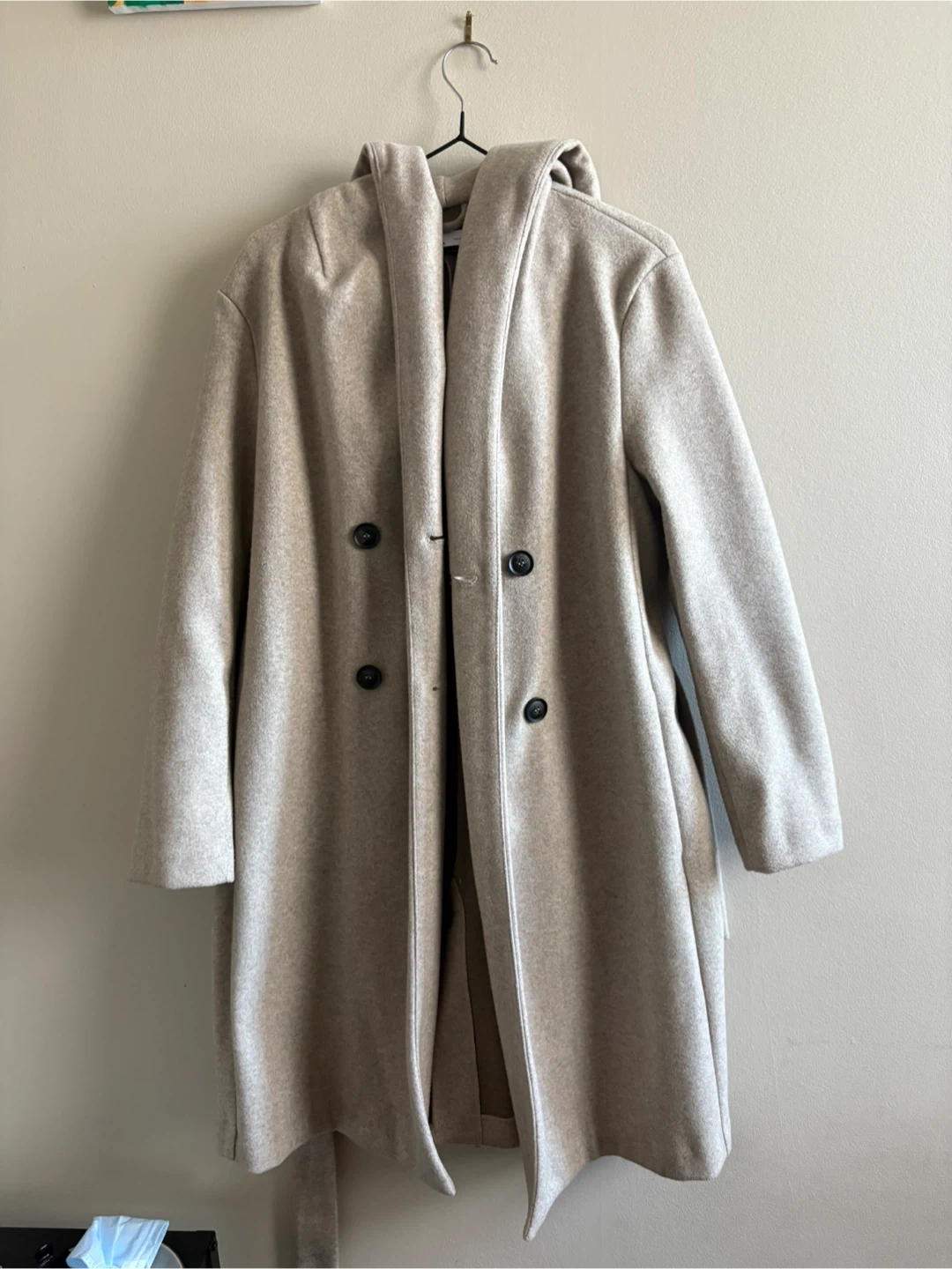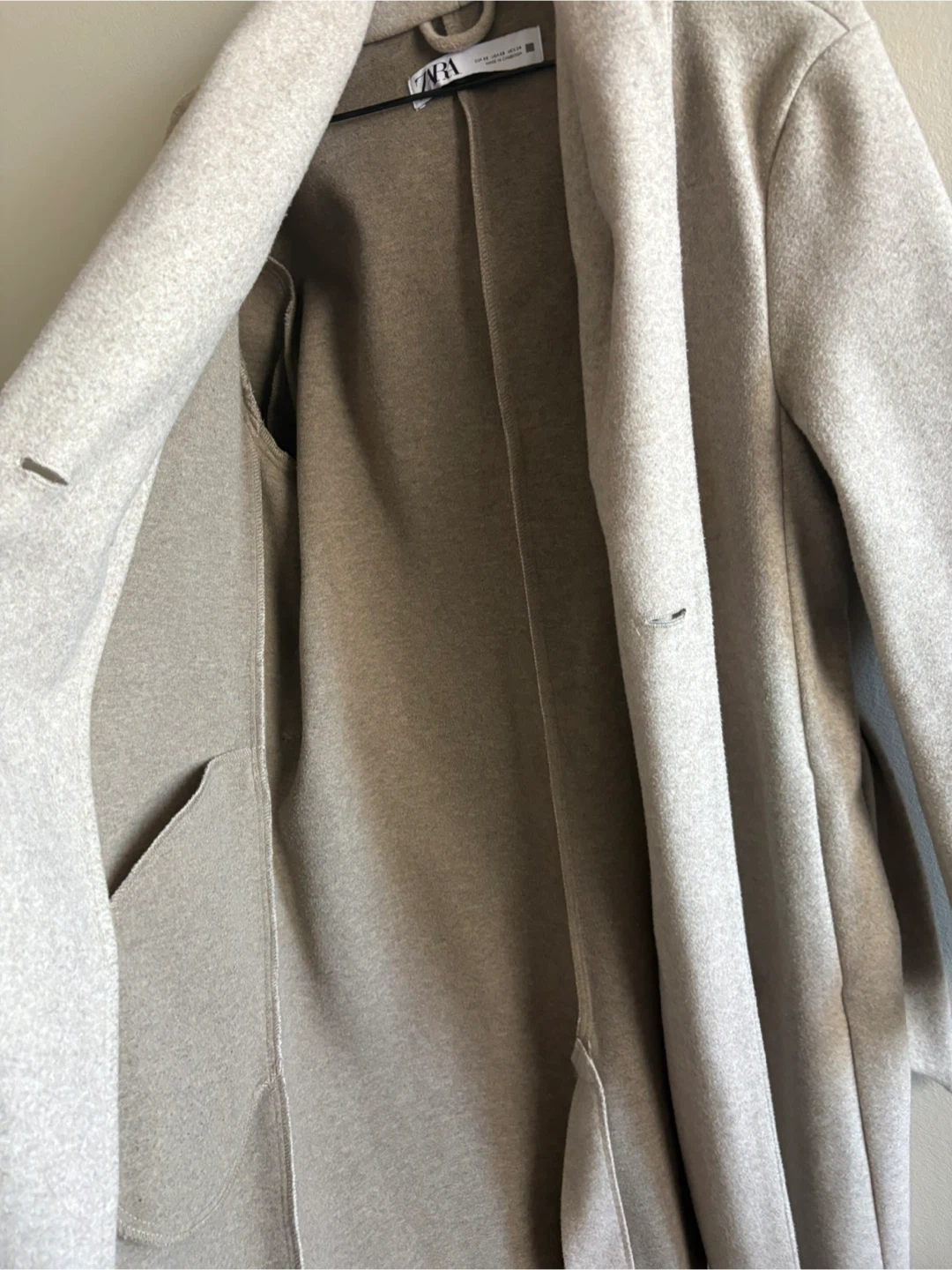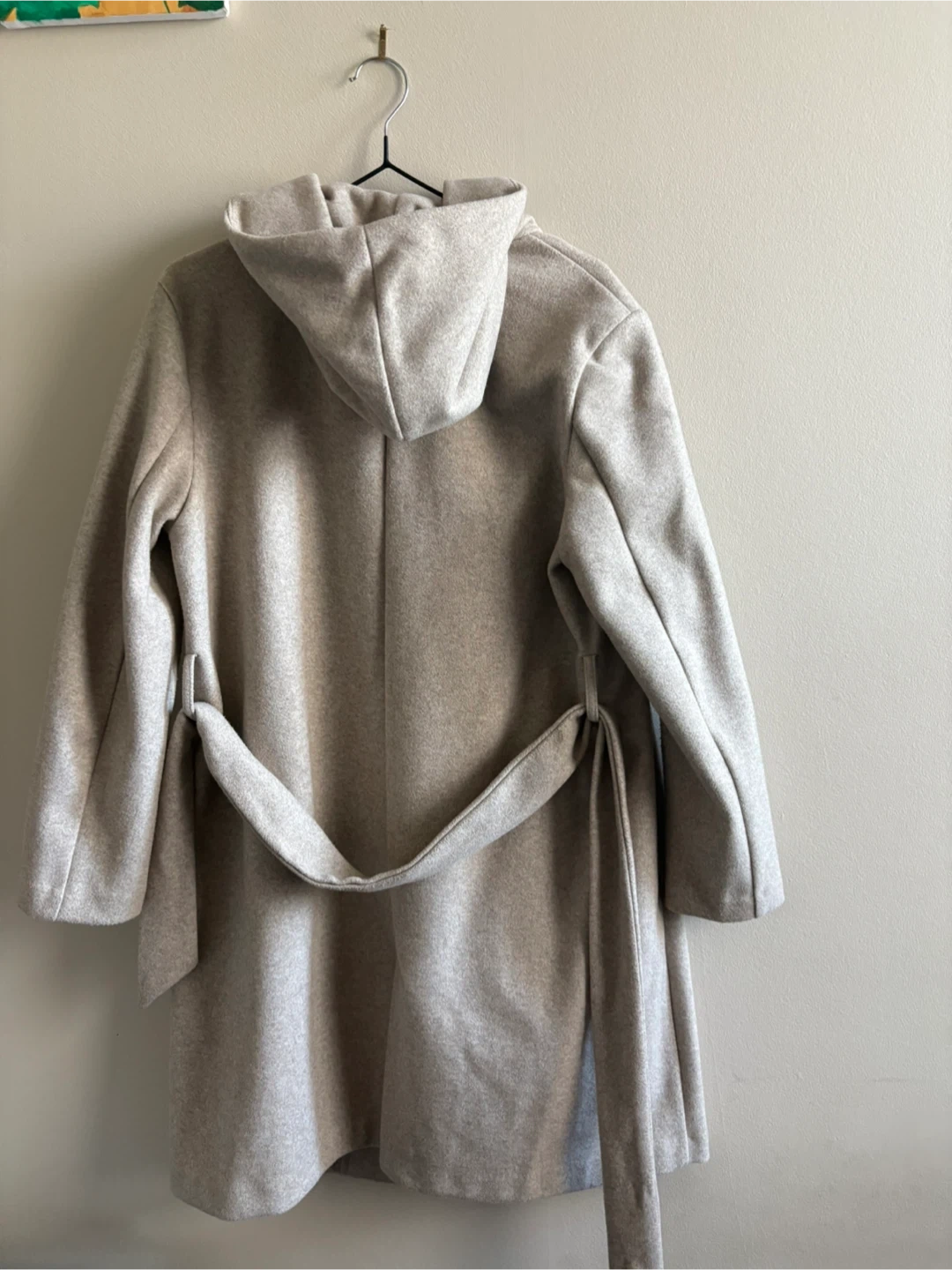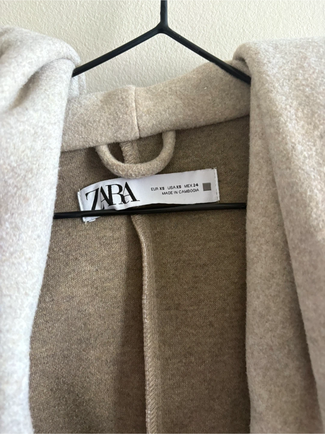33Cozy Zara hooded coat in a neutral beige colour. It's a size XS and features a stylish wool blend. Perfect for staying warm and fashionable this season! Condition: New