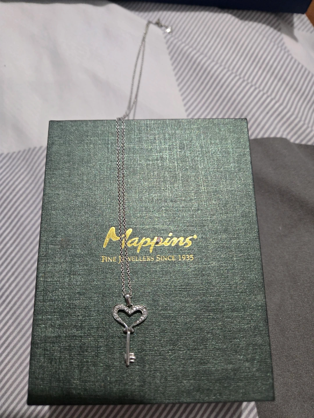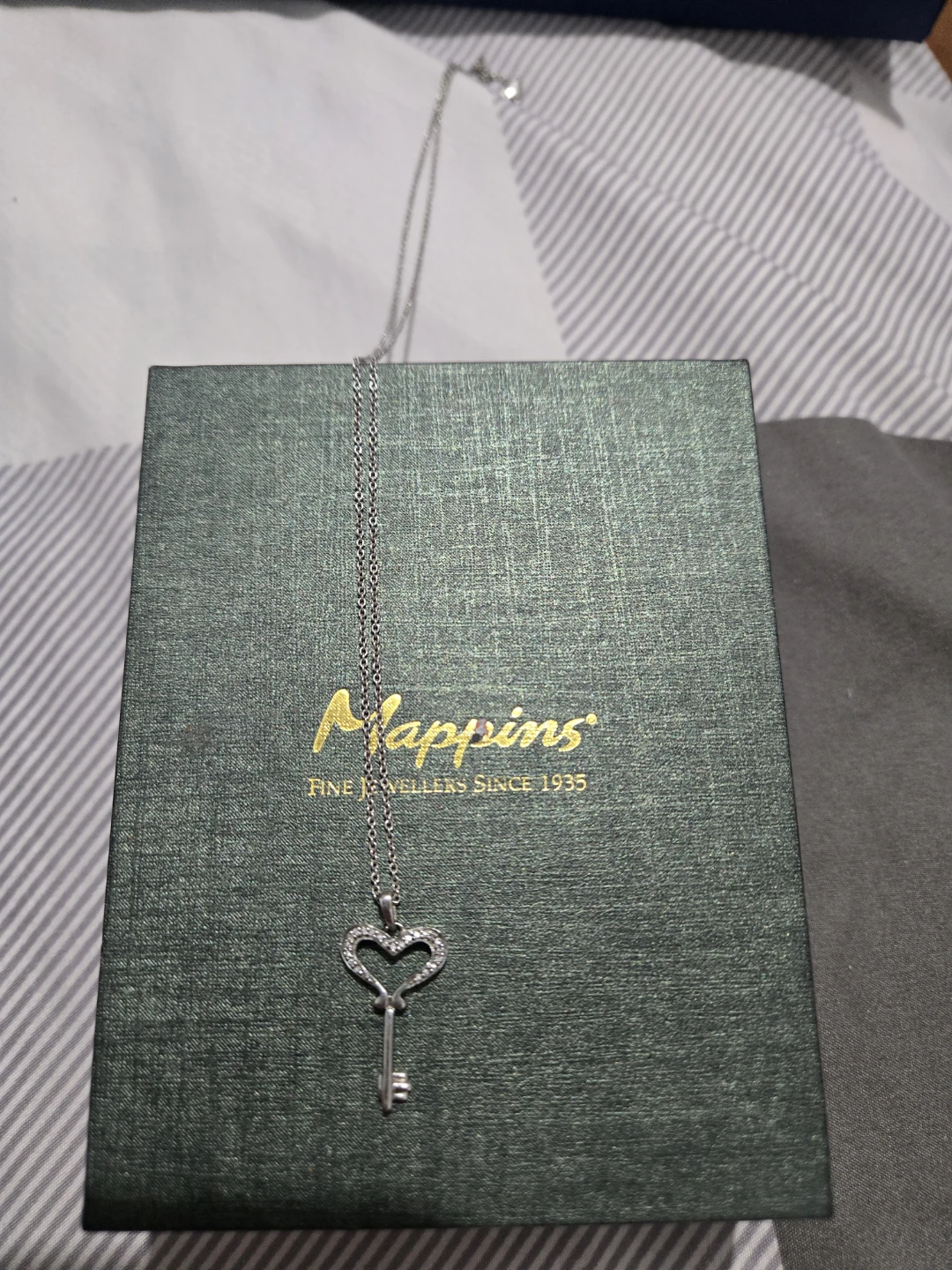 This Mappins necklace features a heart-shaped key pendant adorned with small crystals. It's a lovely piece from a fine jeweller established in 1935. The pendant hangs from a delicate silver-tone chain.
