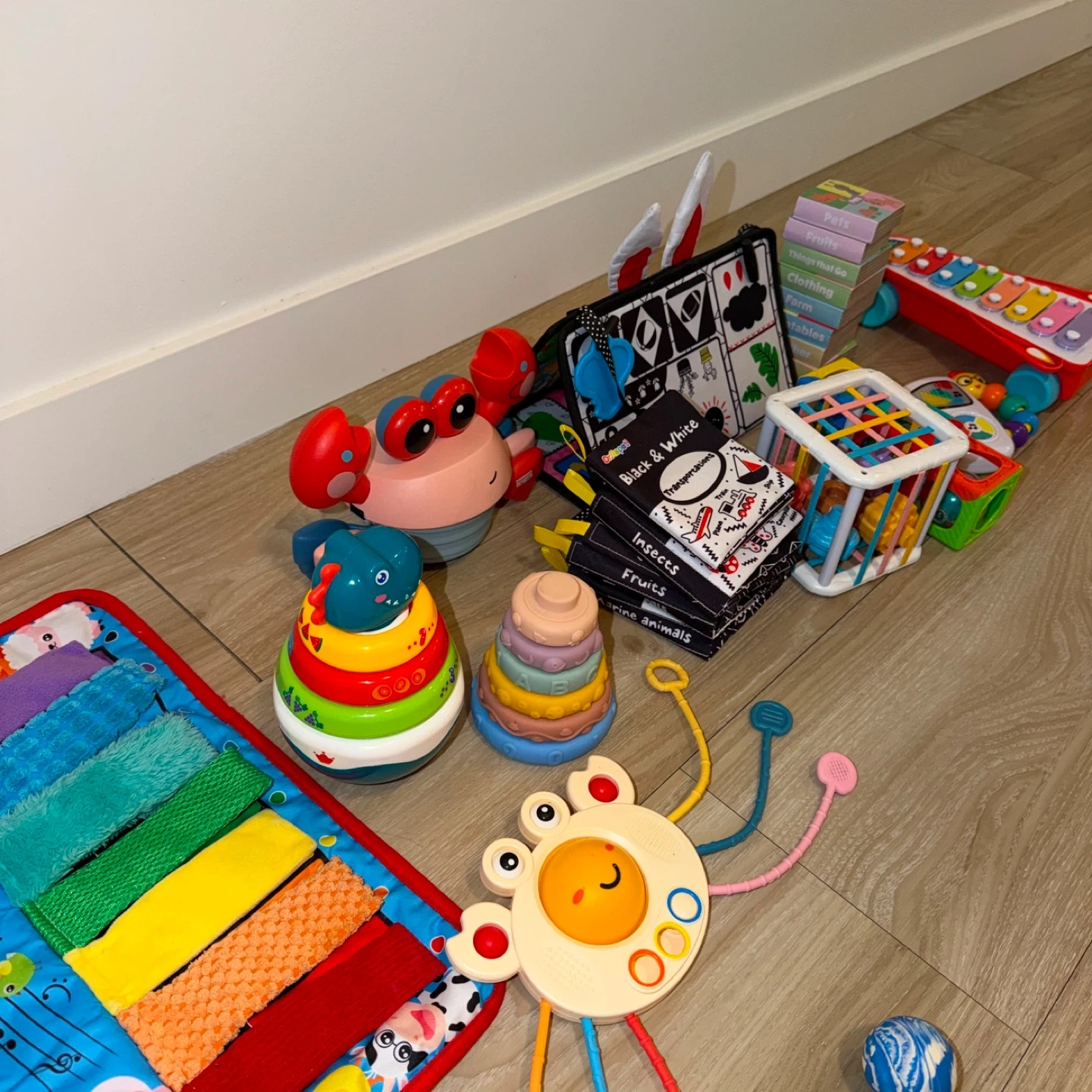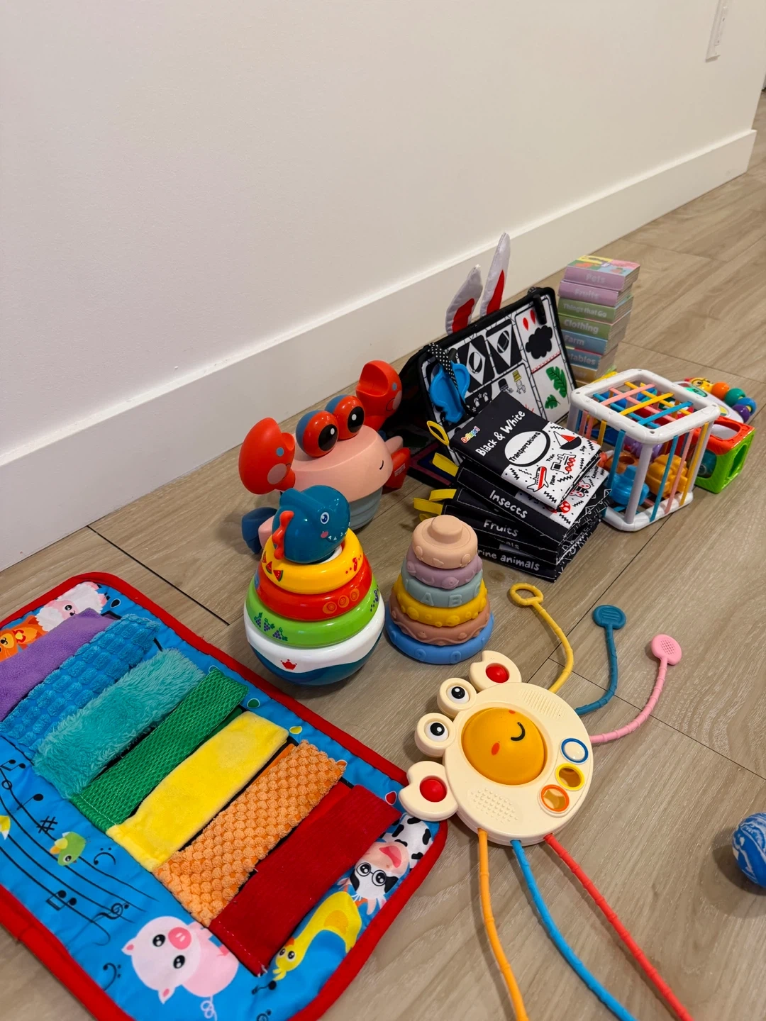 A collection of baby toys including stacking rings, a soft activity mat, a crabbie toy, and a fabric book. Features textures and high-contrast images for sensory development. Great for tummy time and early exploration!
