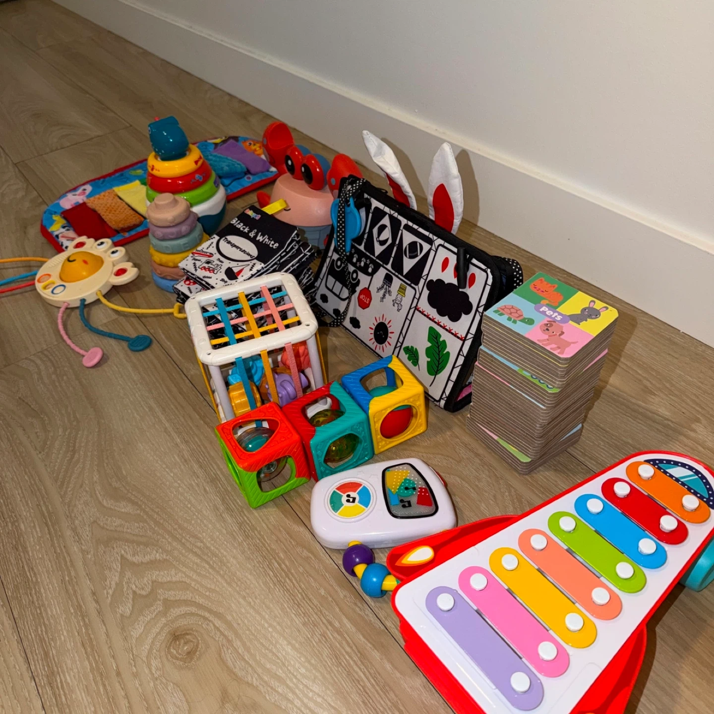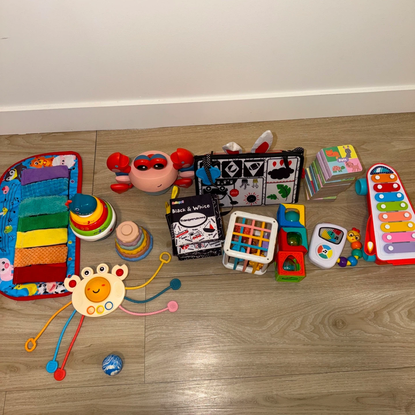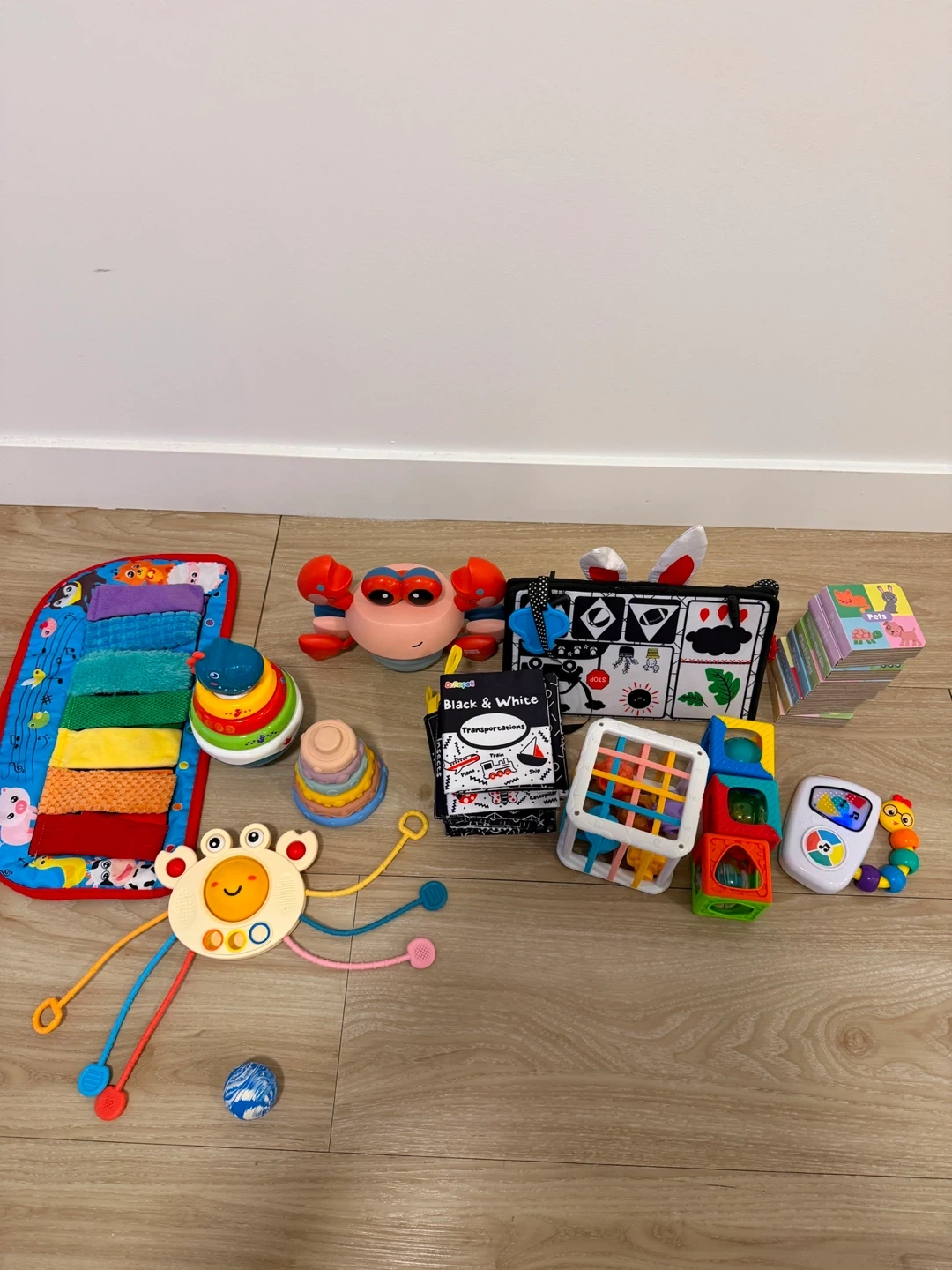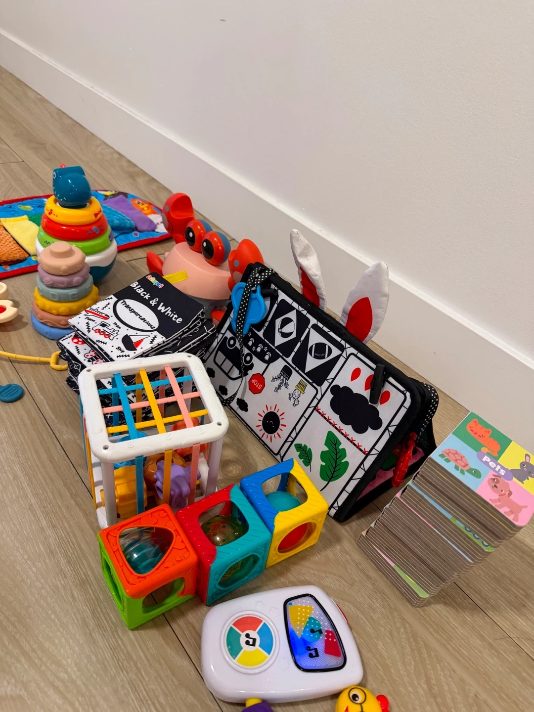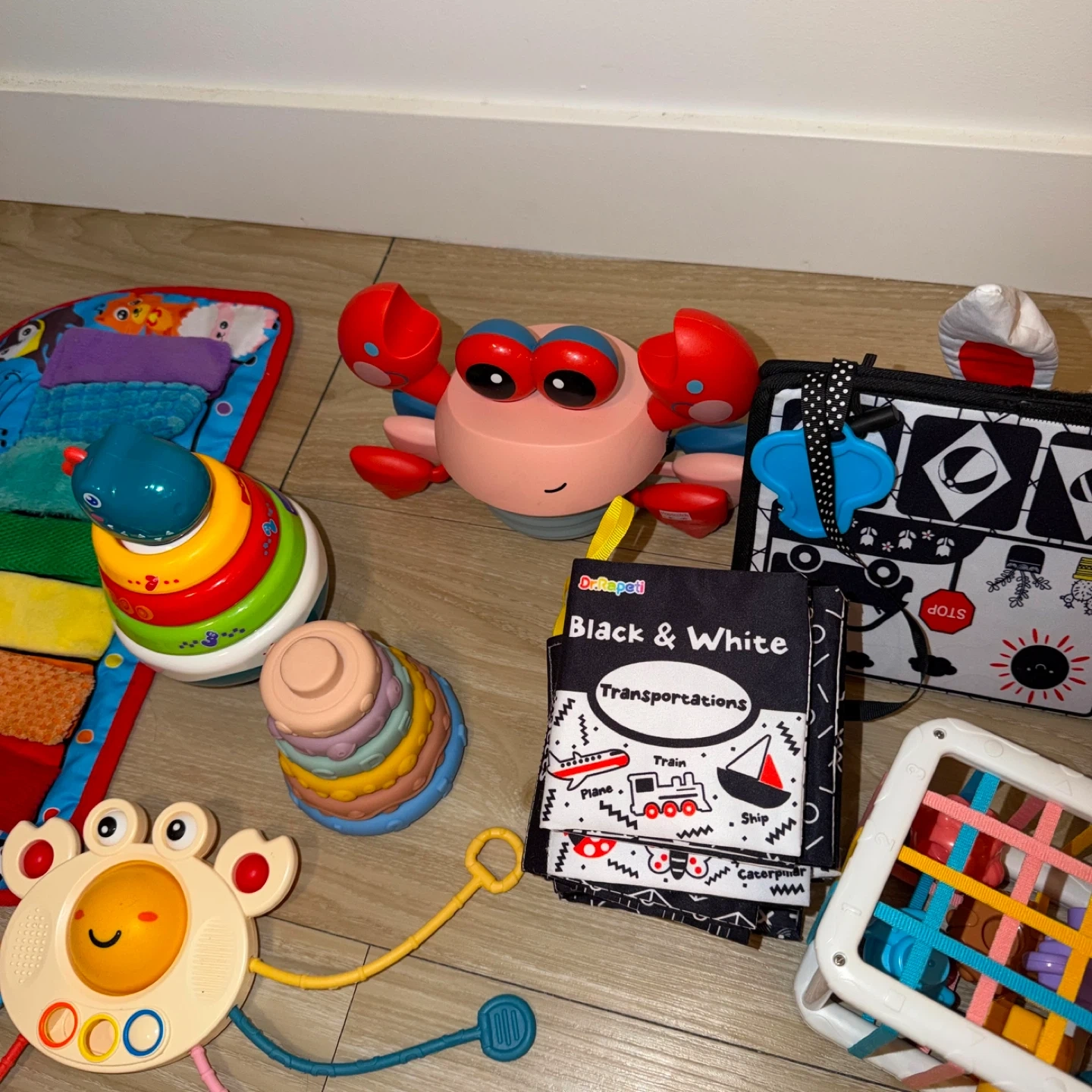 A collection of baby toys including stacking rings, a soft activity mat, a crabbie toy, and a fabric book. Features textures and high-contrast images for sensory development. Great for tummy time and early exploration!