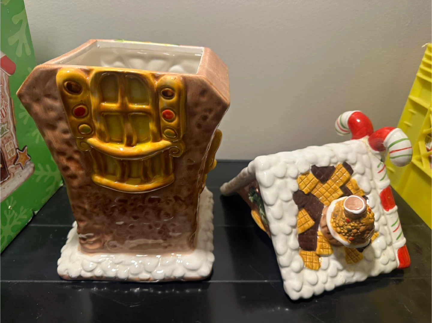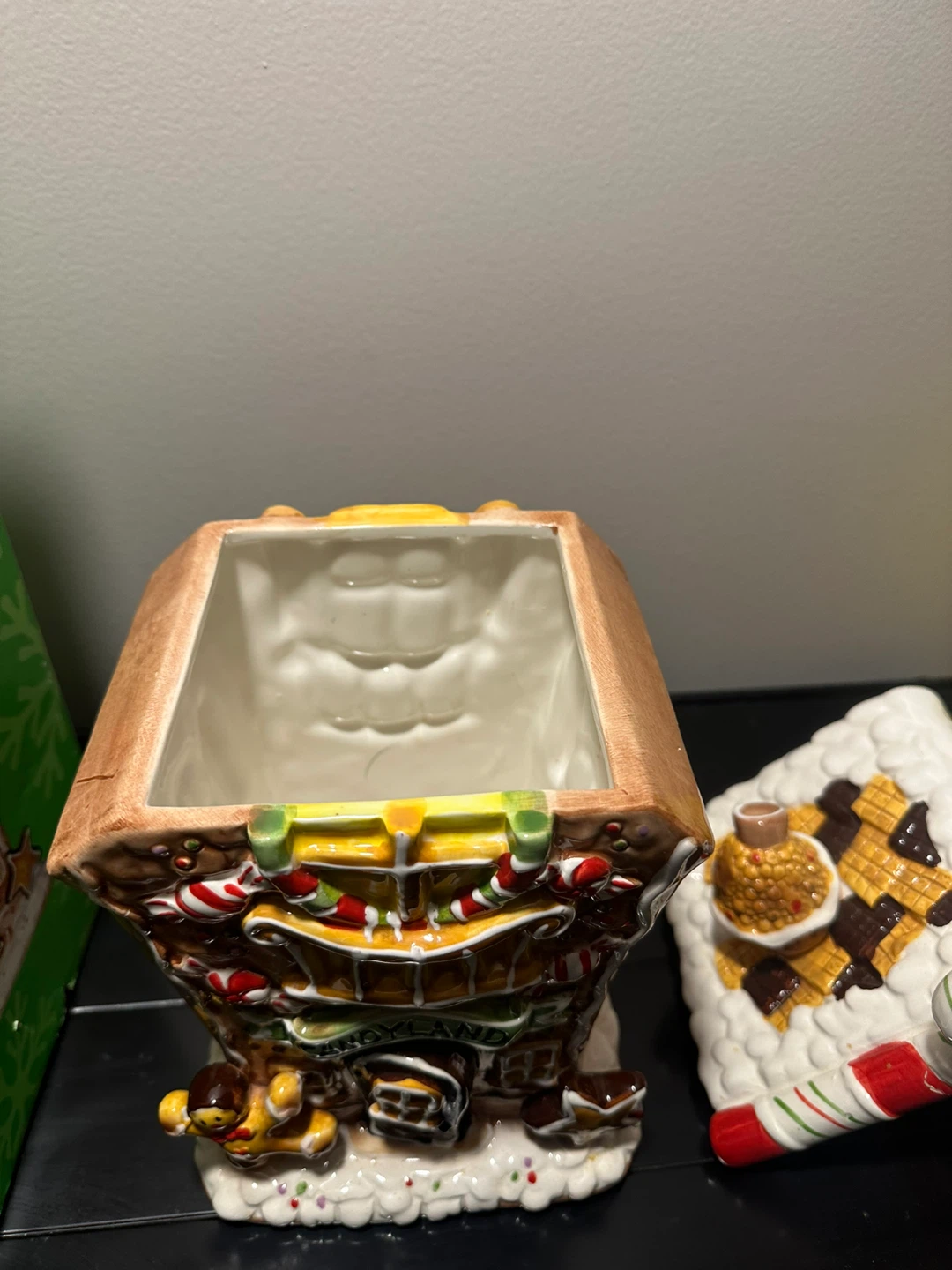 Selling a cute Candyland ceramic cookie jar! It's shaped like a gingerbread house with lots of fun details like candy canes and a gingerbread man. The lid is also decorated with a candy theme. Comes with the original box!