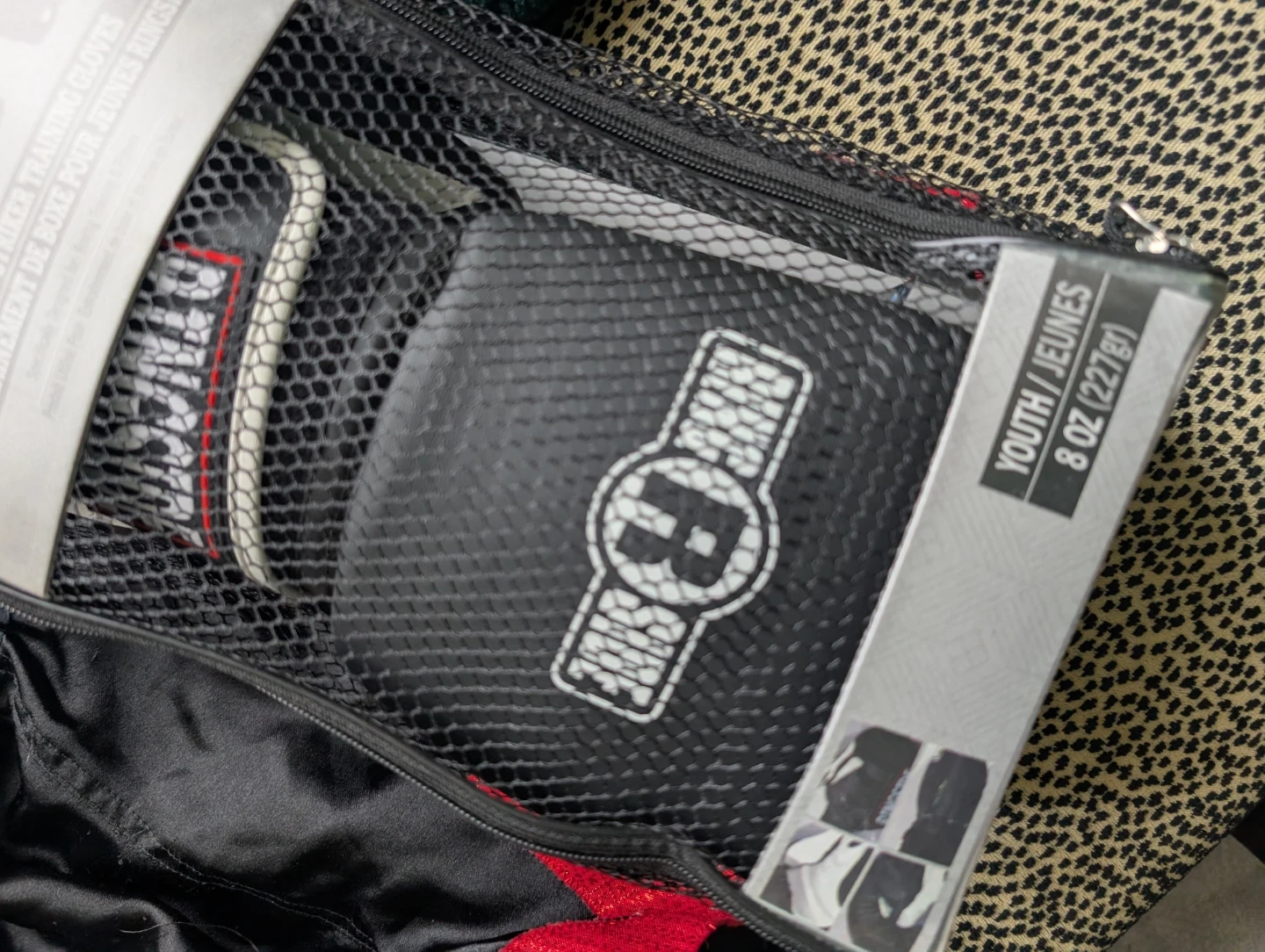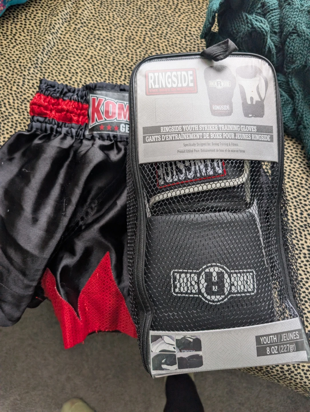 New never used Ringside Youth Striker training gloves. They're designed for boxing, training & sparring. The gloves are 8 oz and come in a mesh carrying bag. Training shorts in small size included