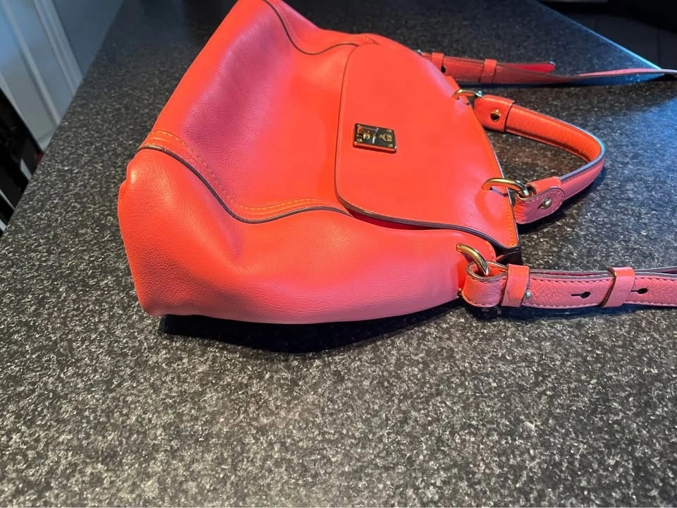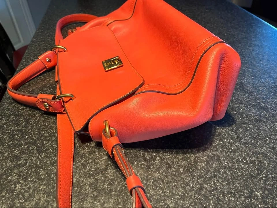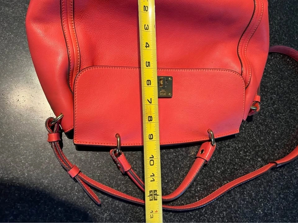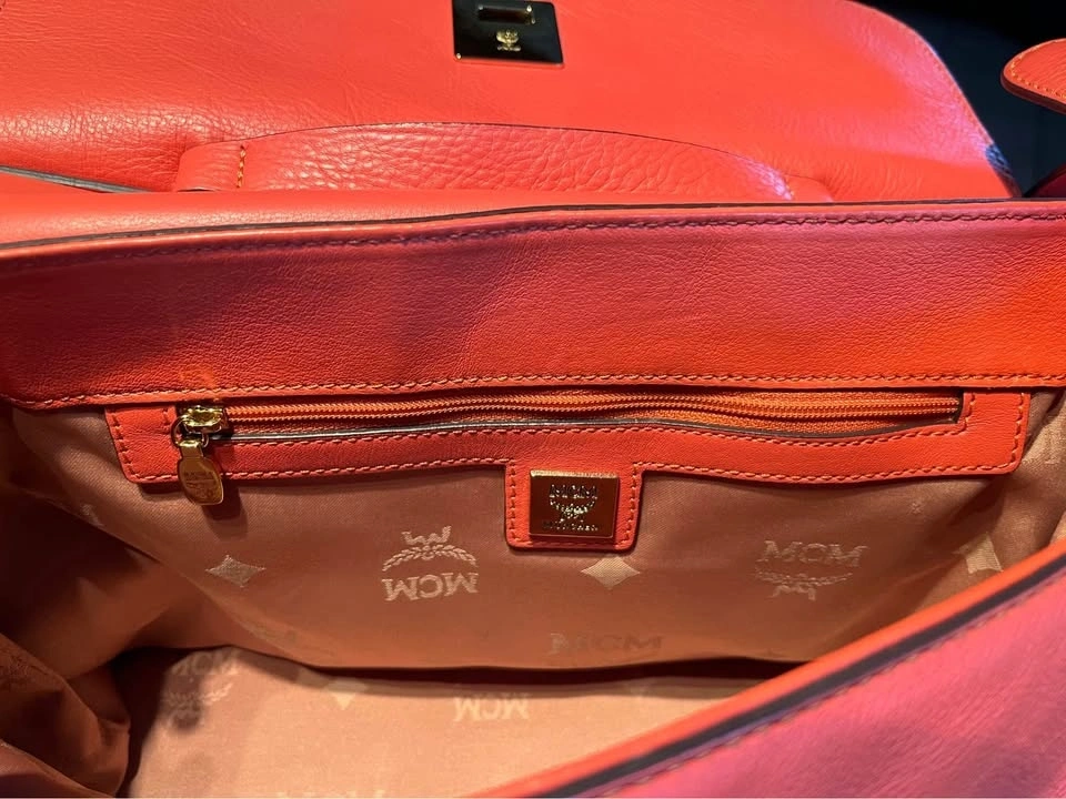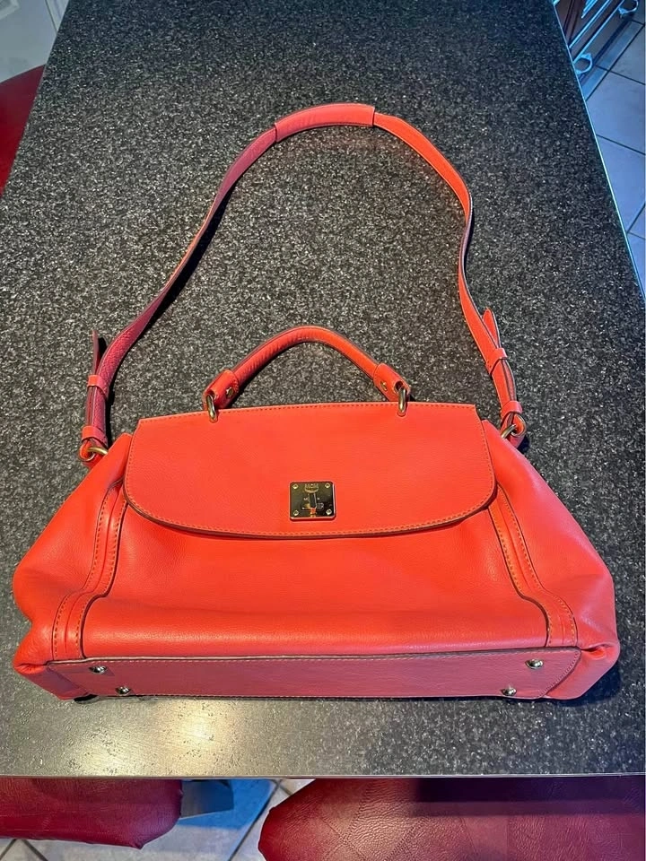 Beautiful MCM leather cross body bag that shows virtually no signs of use. Precise stitching, luxurious leather, elaborate plating, and an overall attention to detail are clearly evident in this bag. Lovely burnt orange colour for fall. Made in South Korea. Approximate dimensions are 14 inches wide by 10 inches tall. Serial number authenticates the bag. Original retail price approximately $1300. It is sitting in a closet so time for someone else to enjoy it. Smoke free home. Cash purchase. $125 O.B.O.