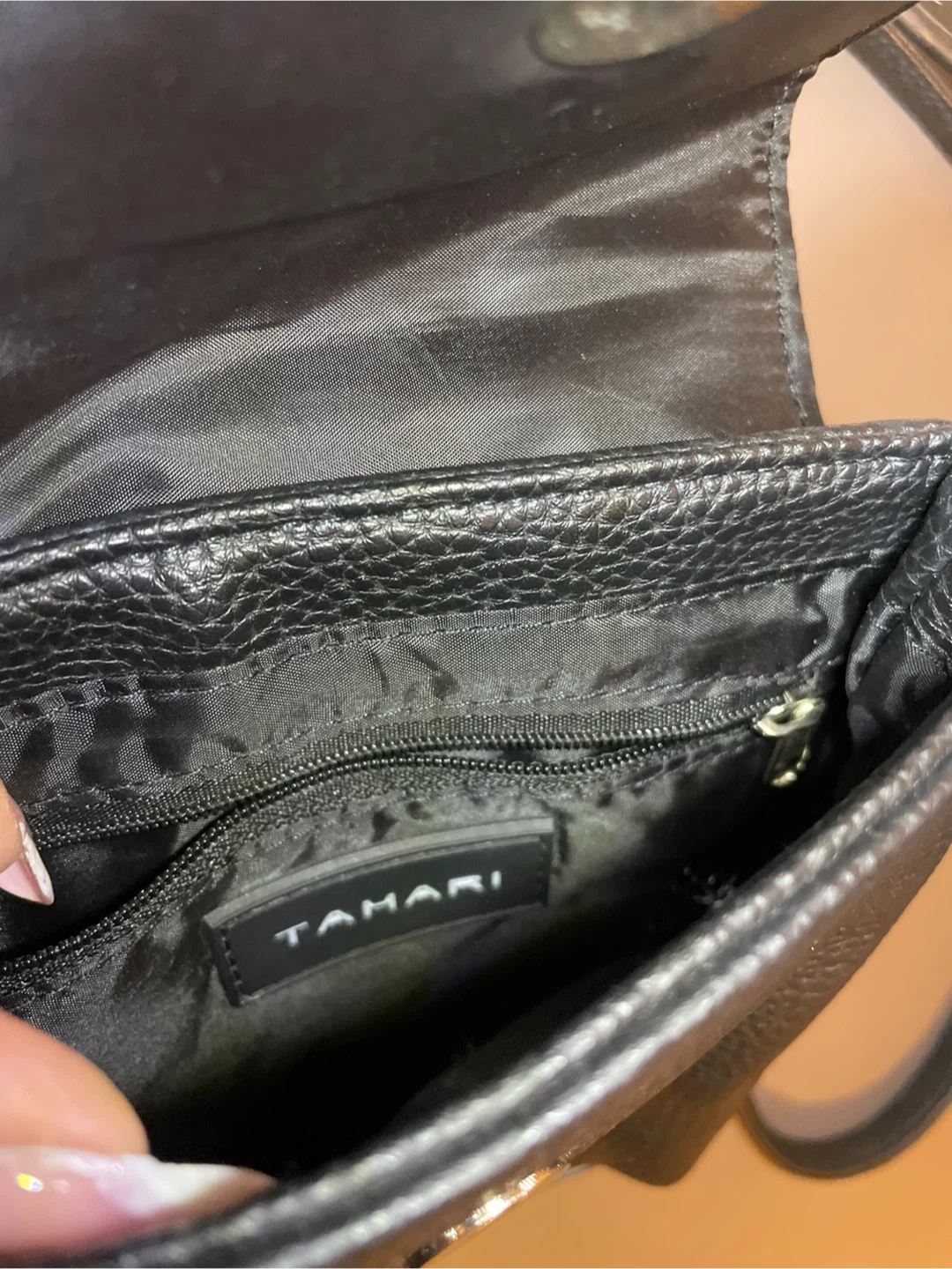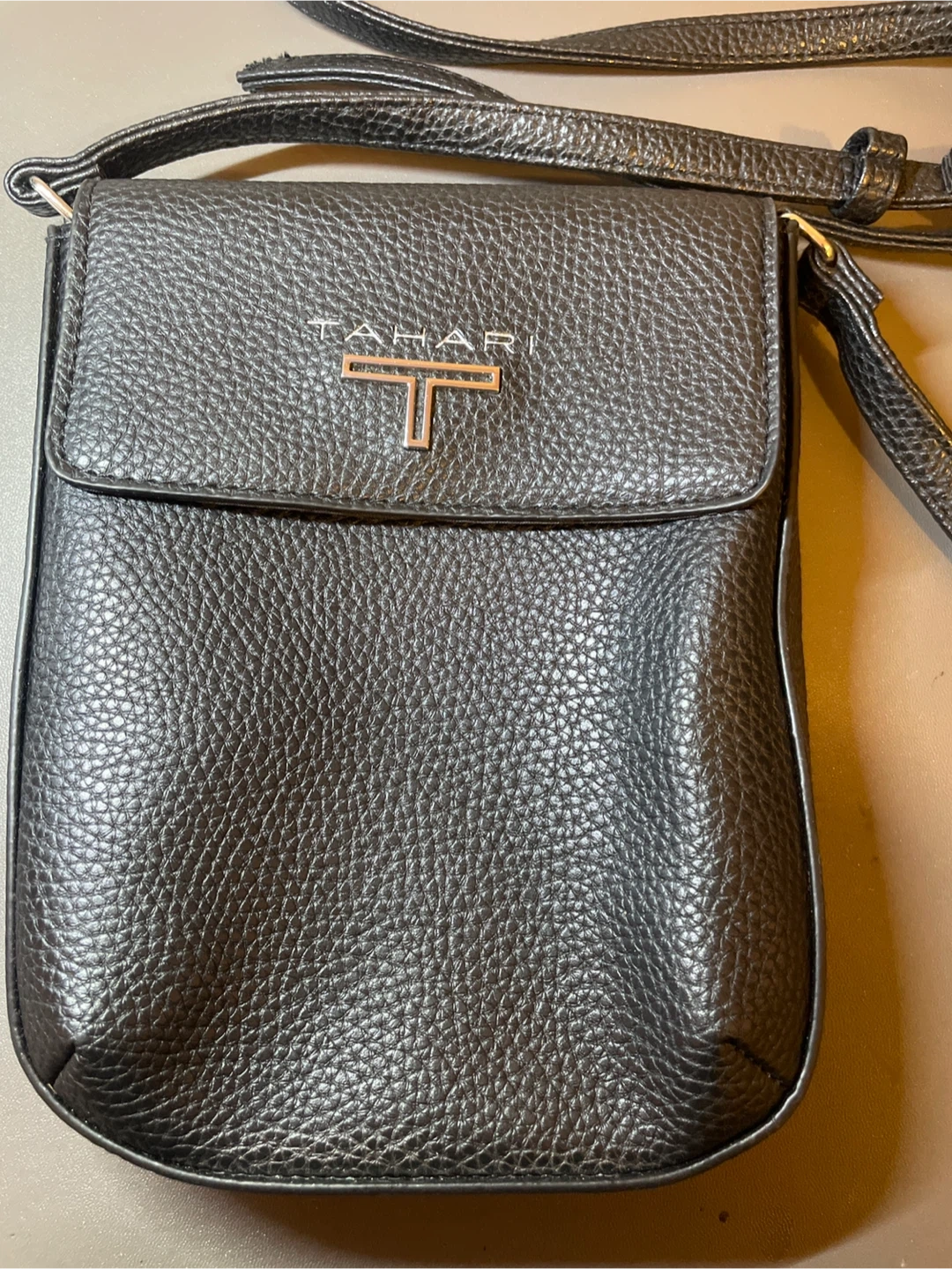 This Tahari crossbody bag is black with a textured leather finish. It features an adjustable strap for comfortable wear. A secure zip pocket is inside.