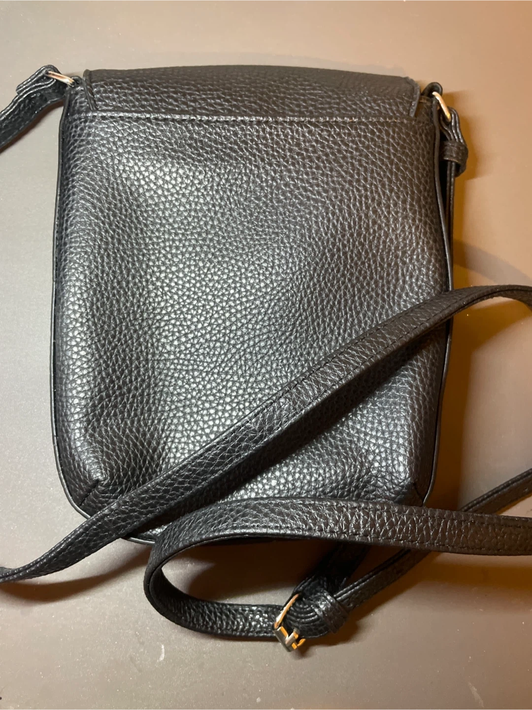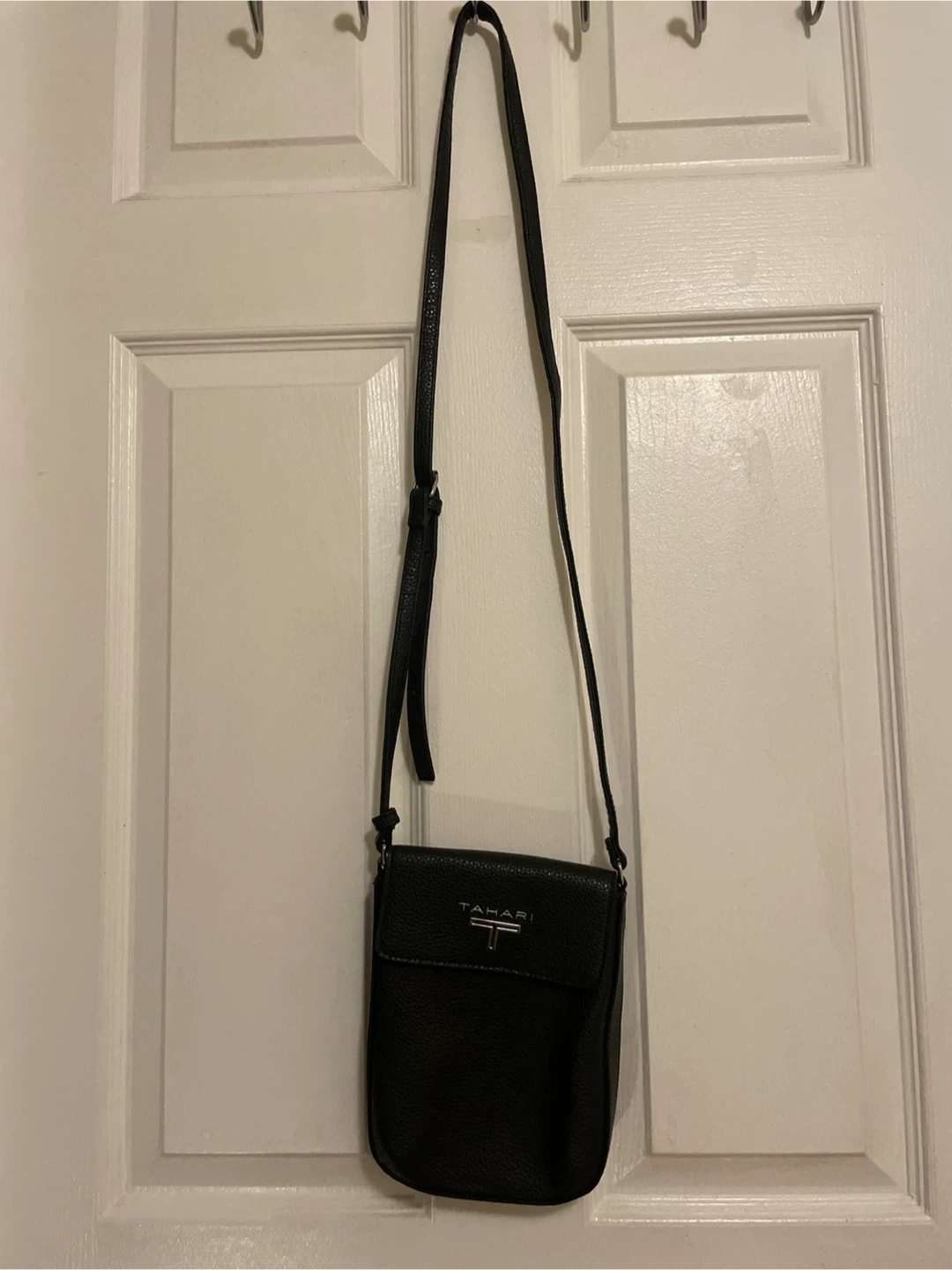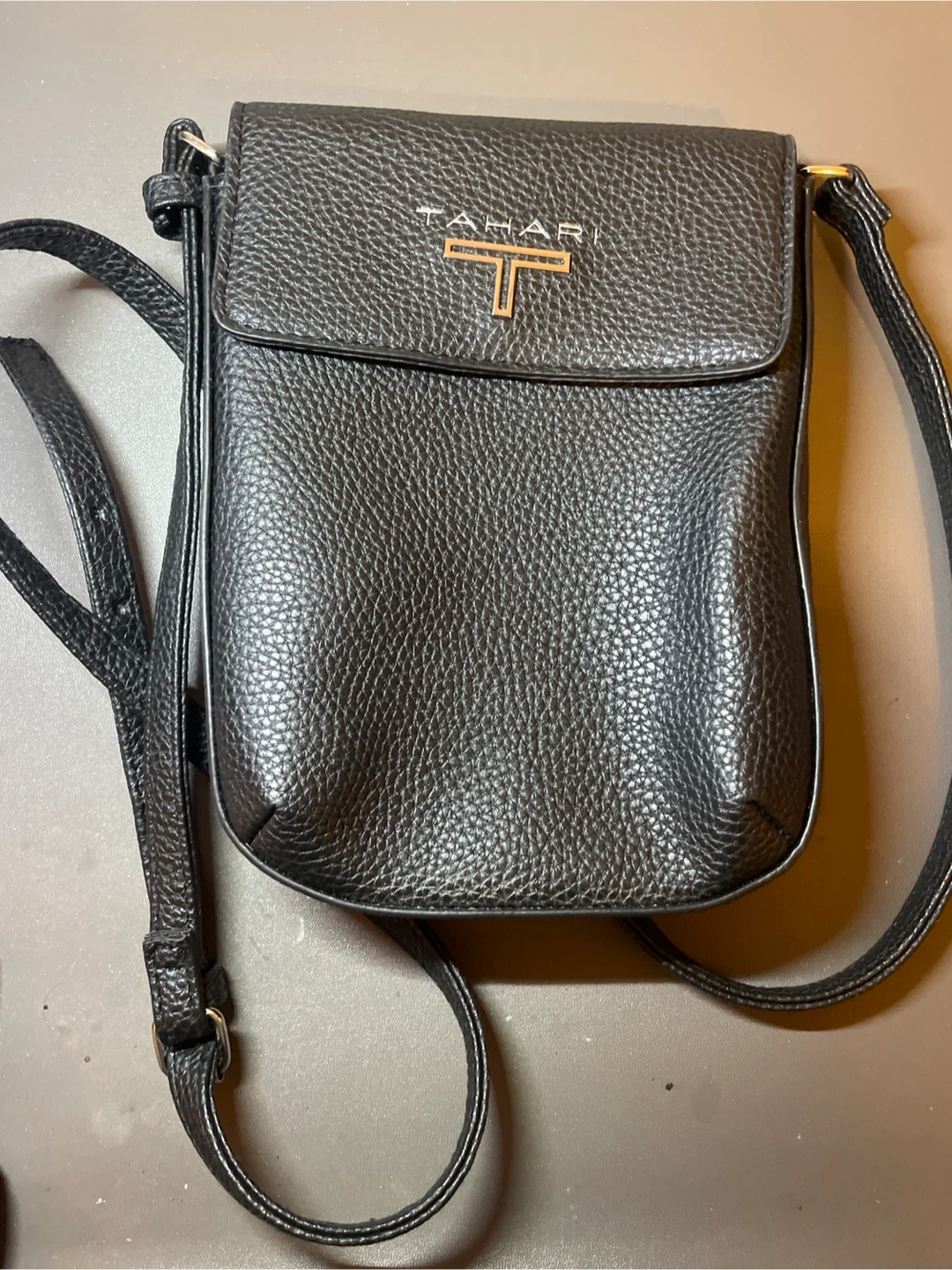 This Tahari crossbody bag is black with a textured leather finish. It features an adjustable strap for comfortable wear. A secure zip pocket is inside.