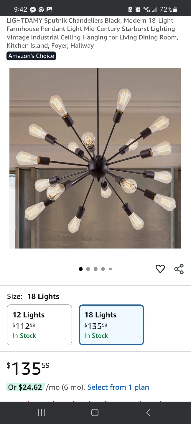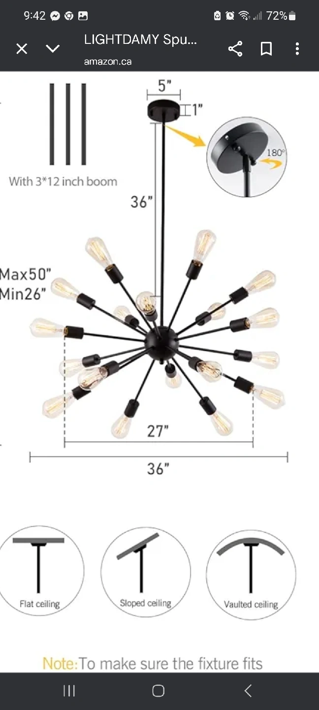 Looking to add a touch of mid-century modern to your home? This LIGHTDANY Sputnik chandelier is just the thing! It features 18 lights and a sleek black finish. Perfect for the living room, bedroom, dining room, kitchen, cafe, etc. Bulbs are E26 type. Originally bought for $135.59.
