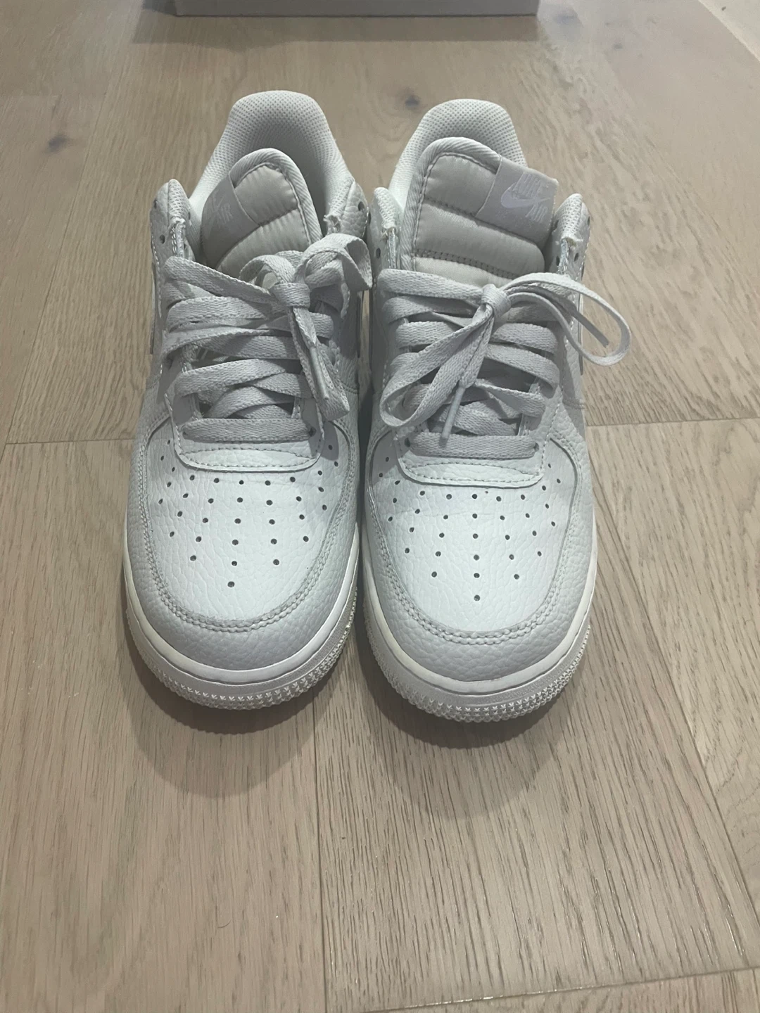 These Nike Air Force 1 Low sneakers are in a light smoke grey colourway. They feature a tumbled leather construction with perforations on the toe box and a classic rubber sole. The iconic Nike Air branding is visible on the heel and tongue. These are a staple for any sneaker collection! Barley used