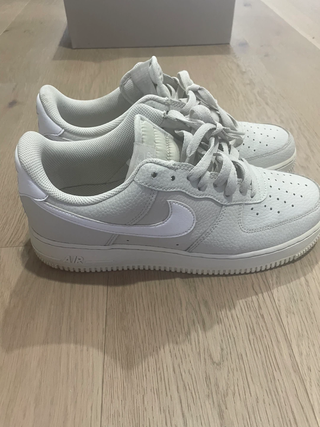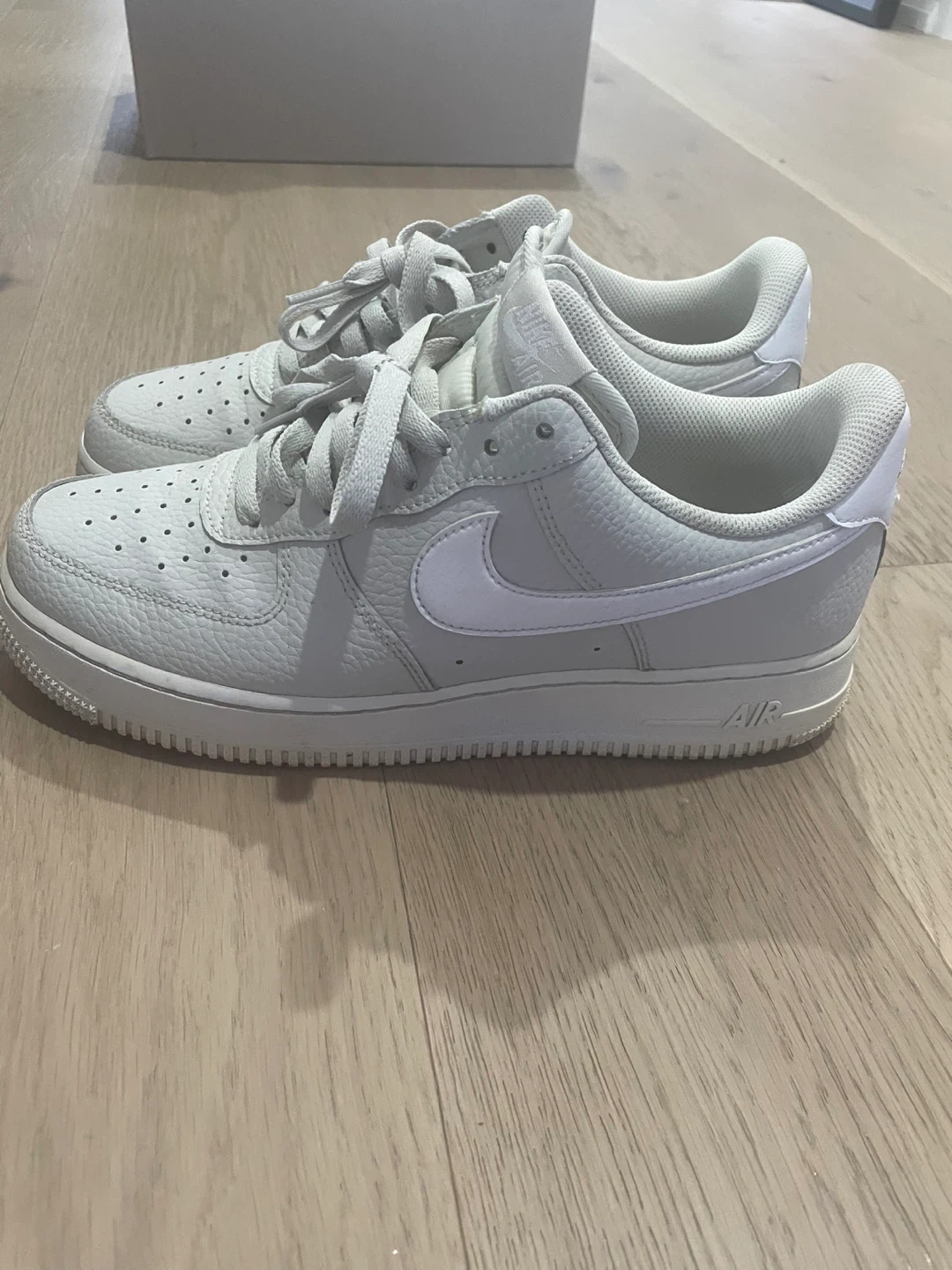 These Nike Air Force 1 Low sneakers are in a light smoke grey colourway. They feature a tumbled leather construction with perforations on the toe box and a classic rubber sole. The iconic Nike Air branding is visible on the heel and tongue. These are a staple for any sneaker collection! Barley used