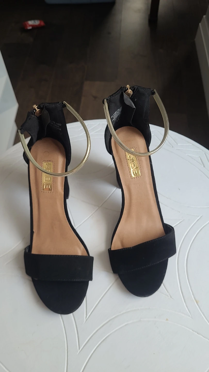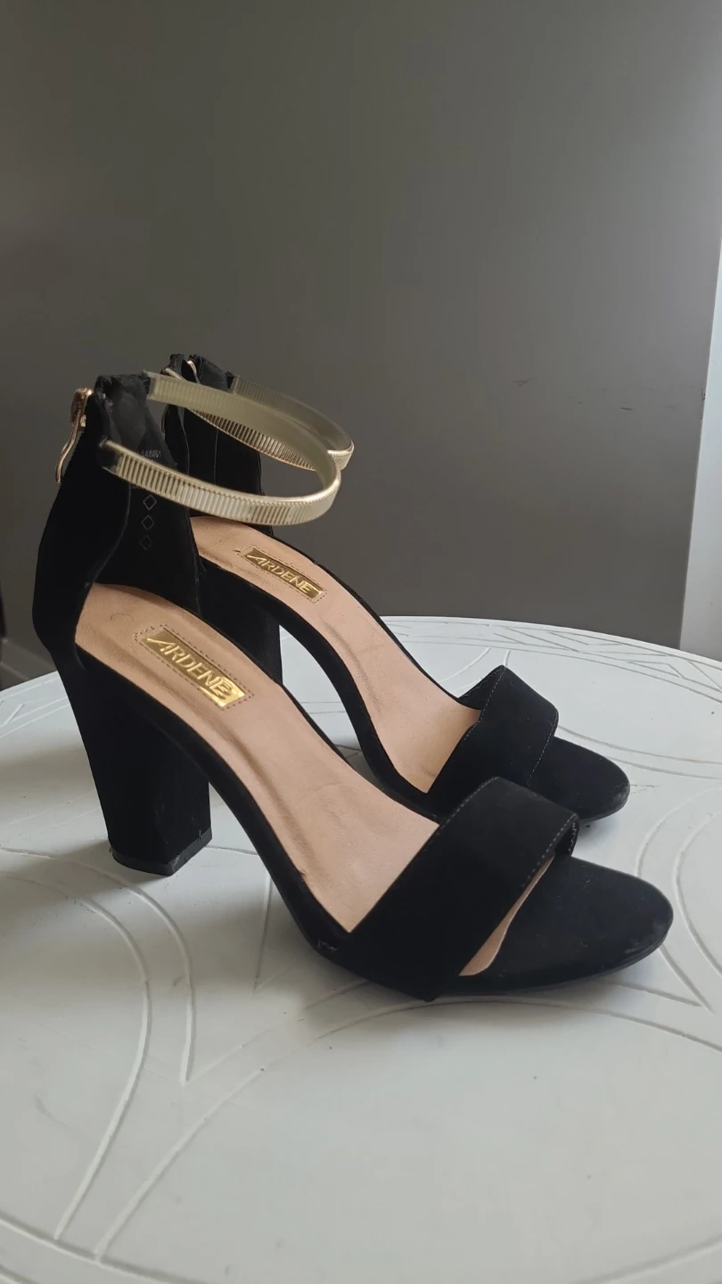 Never worn. These stylish black suede sandals from Ardene feature a comfortable block heel and a chic gold ankle strap. They have a zipper closure at the back for easy wear. These sandals are perfect for dressing up any outfit for a night out or a special occasion!