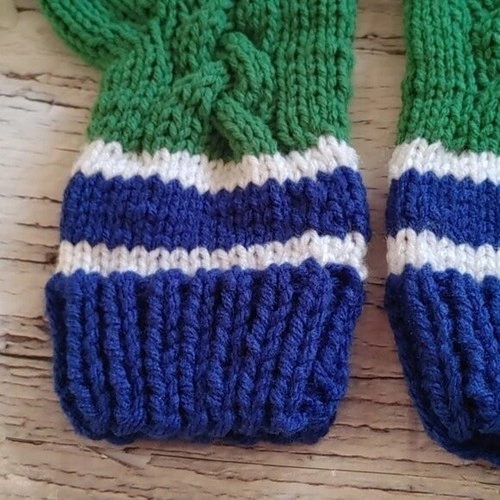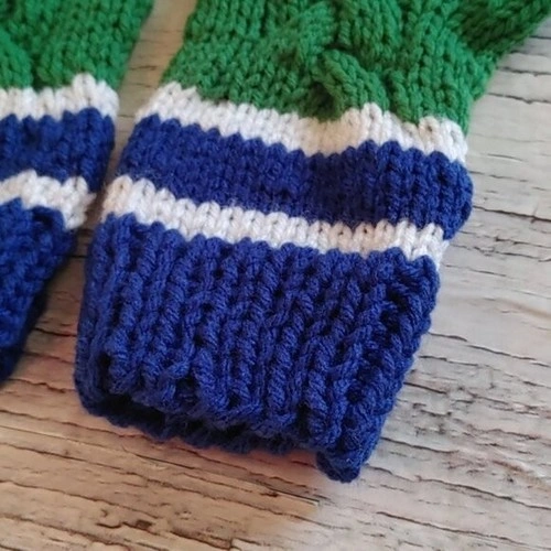 Cozy fingerless gloves with a cable knit design. Features blue, green, and white colors. Perfect for keeping warm while staying stylish.