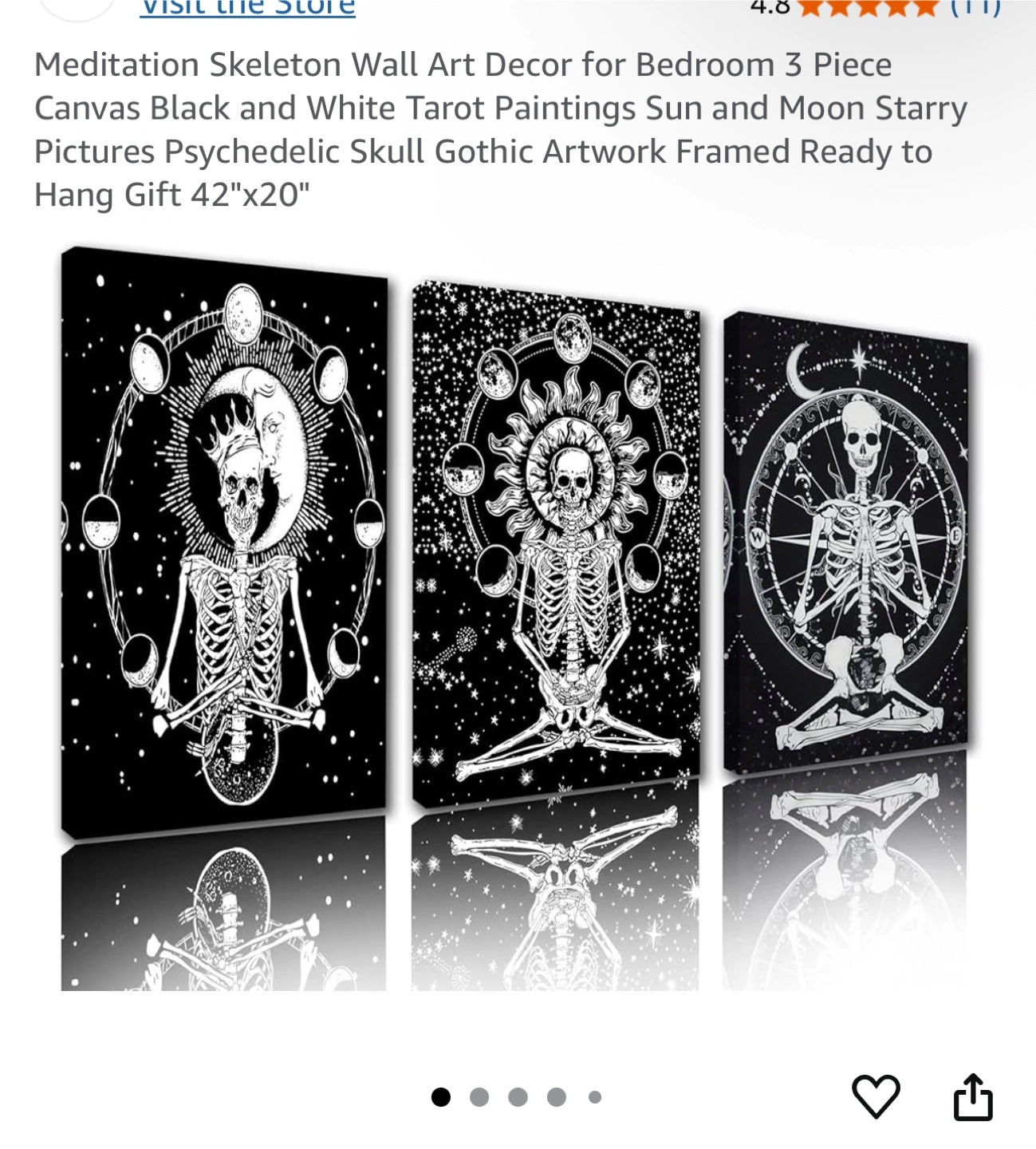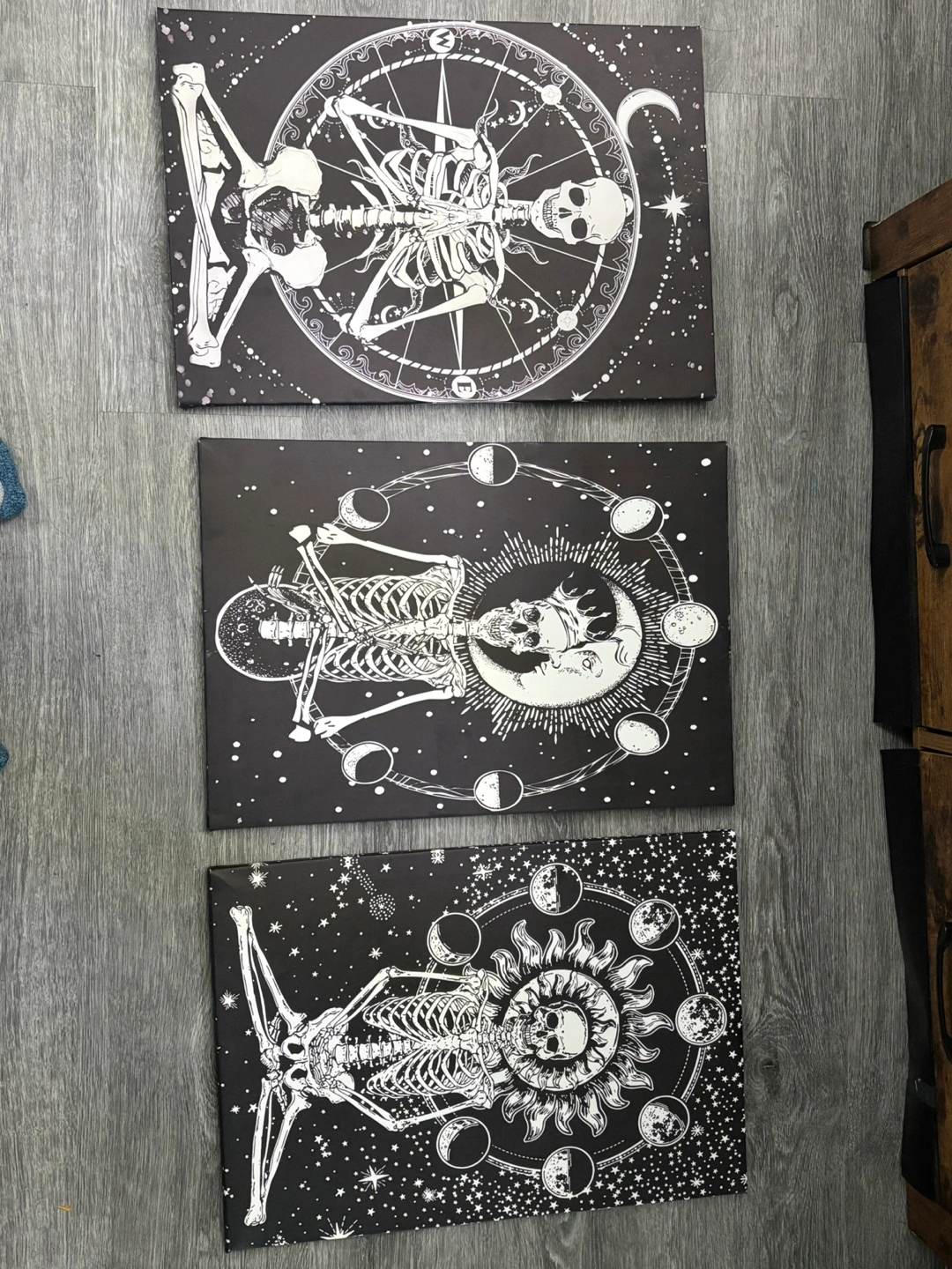 Selling a brand new, 3-piece set of meditation skeleton wall art! These canvas prints feature a black and white tarot paintings of the sun and moon with starry pictures, creating a psychedelic skull gothic artwork vibe. They're framed and ready to hang, sized at 42"x20". Originally bought for $80.81