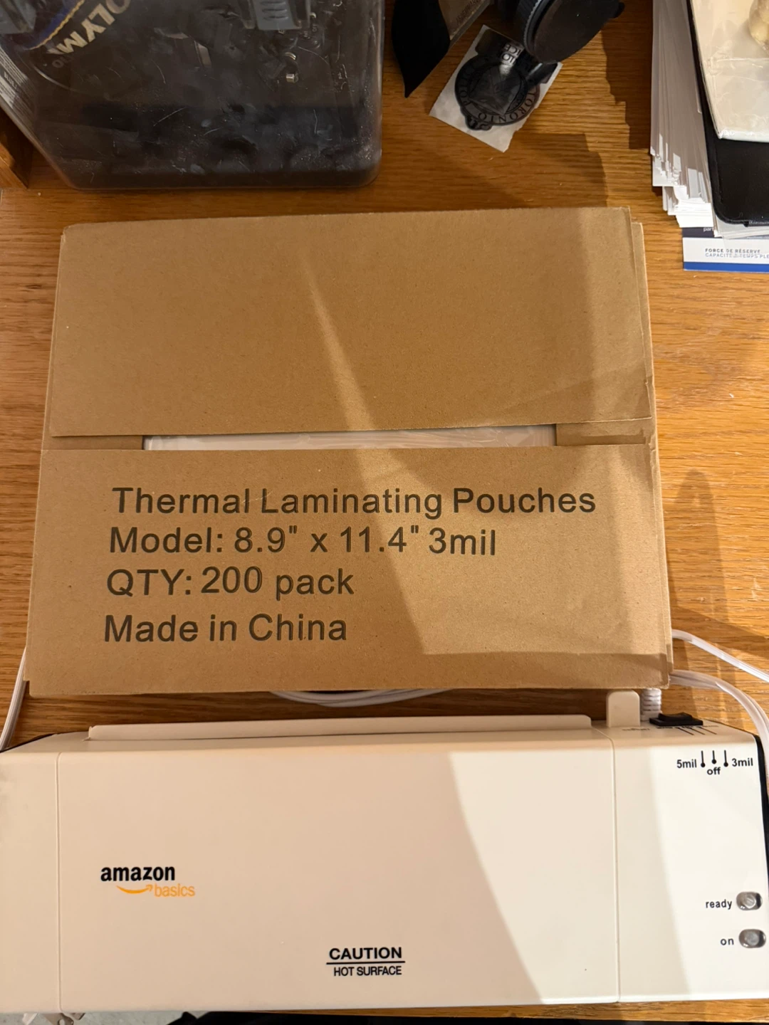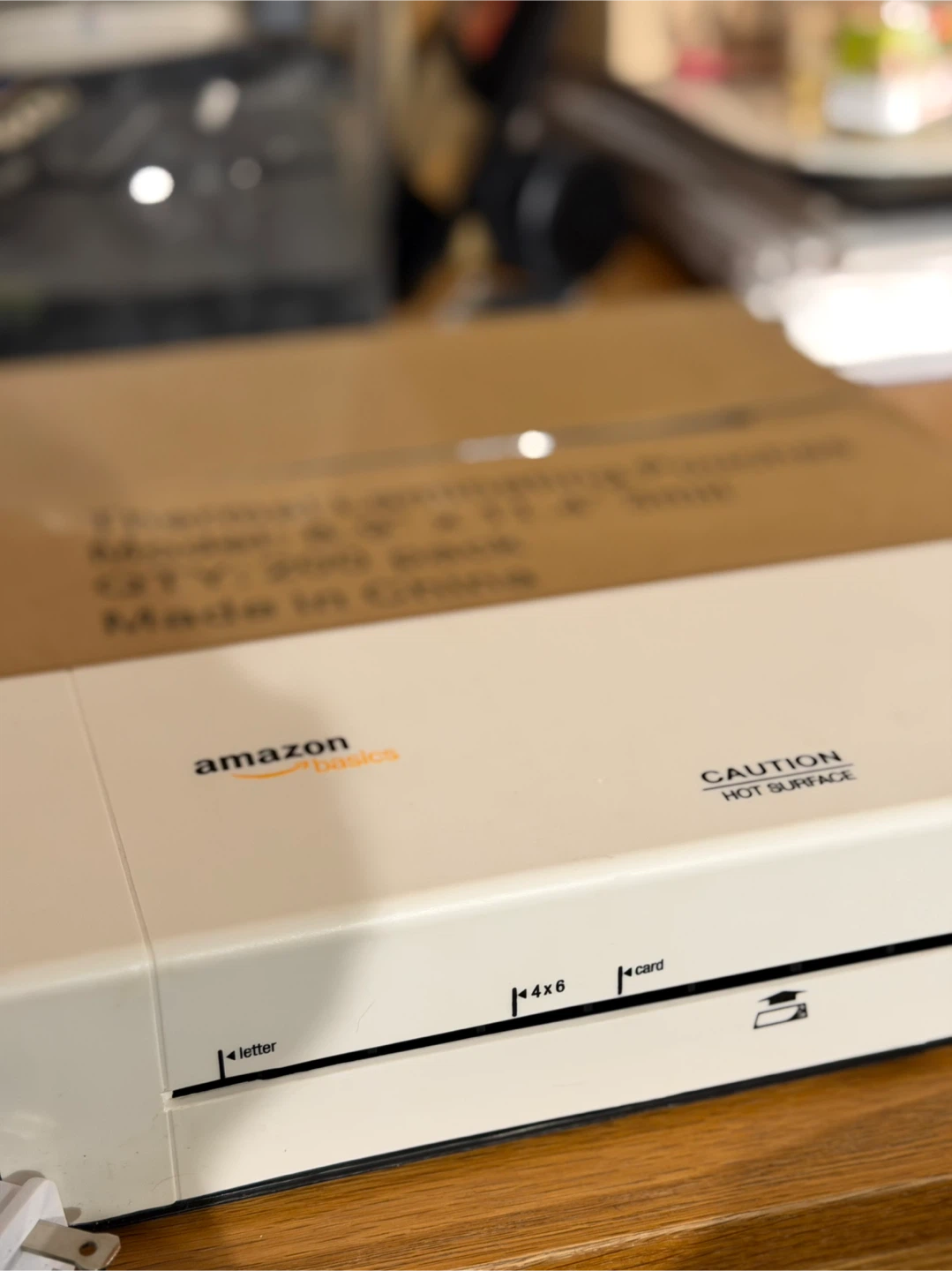 Selling an Amazon Basics thermal laminator! It's in great condition and ready to help you preserve your important documents and photos. It can handle letter size, 4x6 and card sizes. Also included is a box of thermal laminating pouches, 8.9" x 11.4" 3mil, with more than 150 pouches