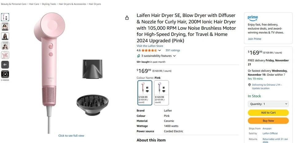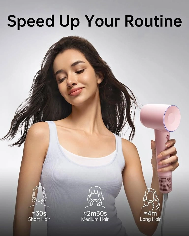 Laifen Hair Dryer SE, Blow Dryer with Diffuser & Nozzle for Curly Hair, 200M Ionic Hair Dryer with 105,000 RPM Low Noise Brushless Motor for High-Speed Drying, for Travel & Home 2024 Upgraded (Pink)