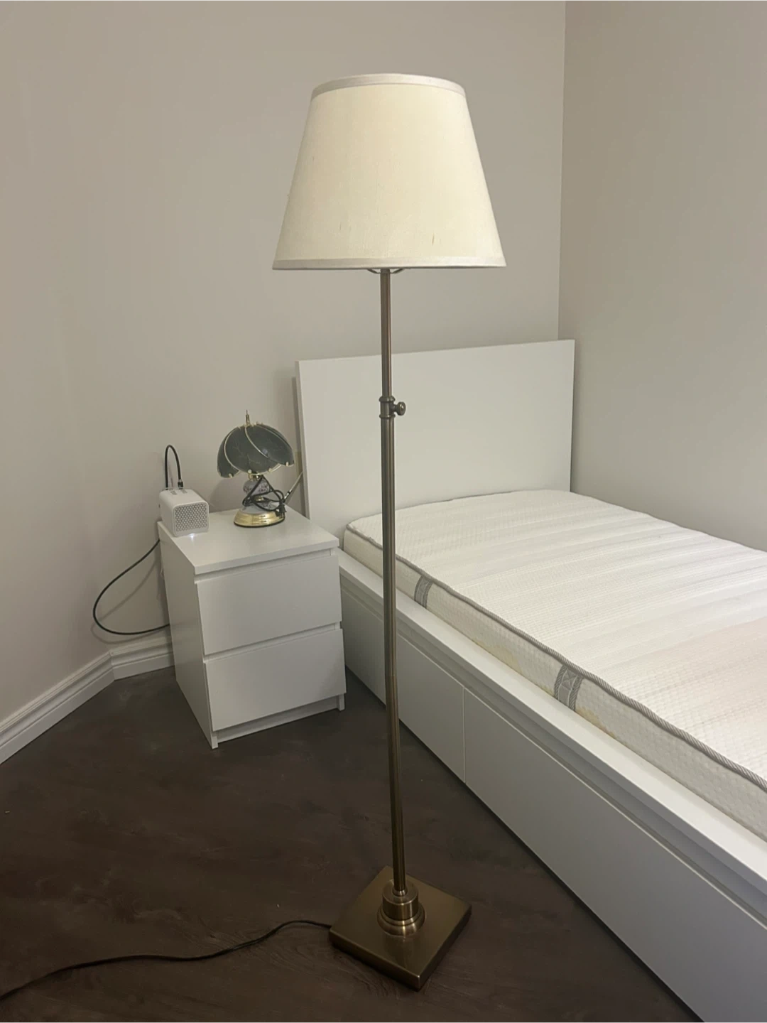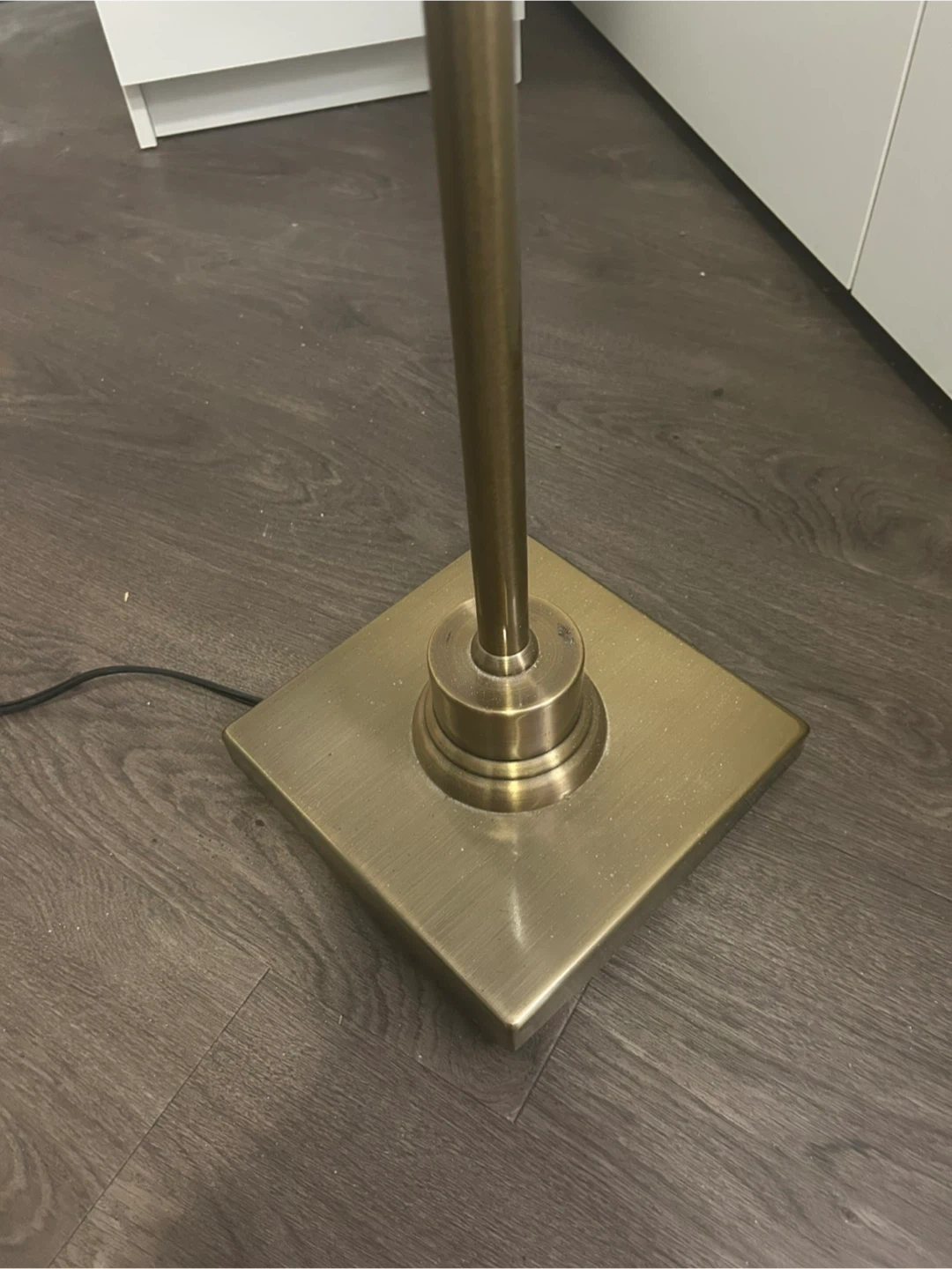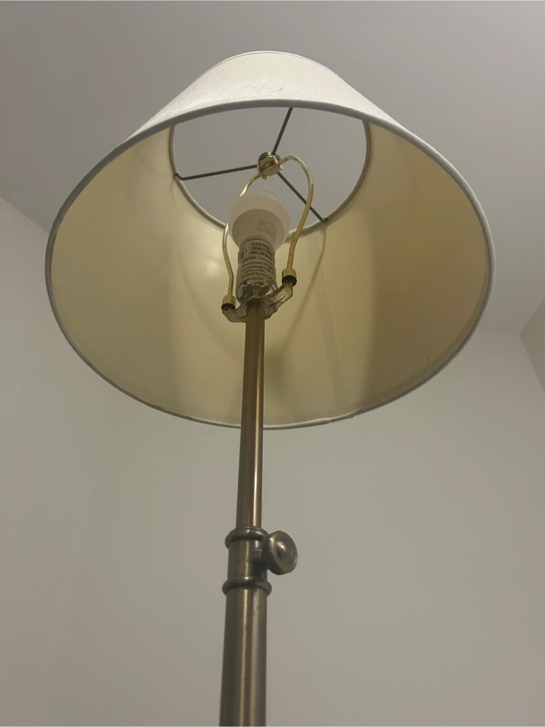 This adjustable floor lamp features a brass finish and a cream-coloured fabric shade. The height is adjustable via a knob on the pole. A nice addition to any living room or bedroom!