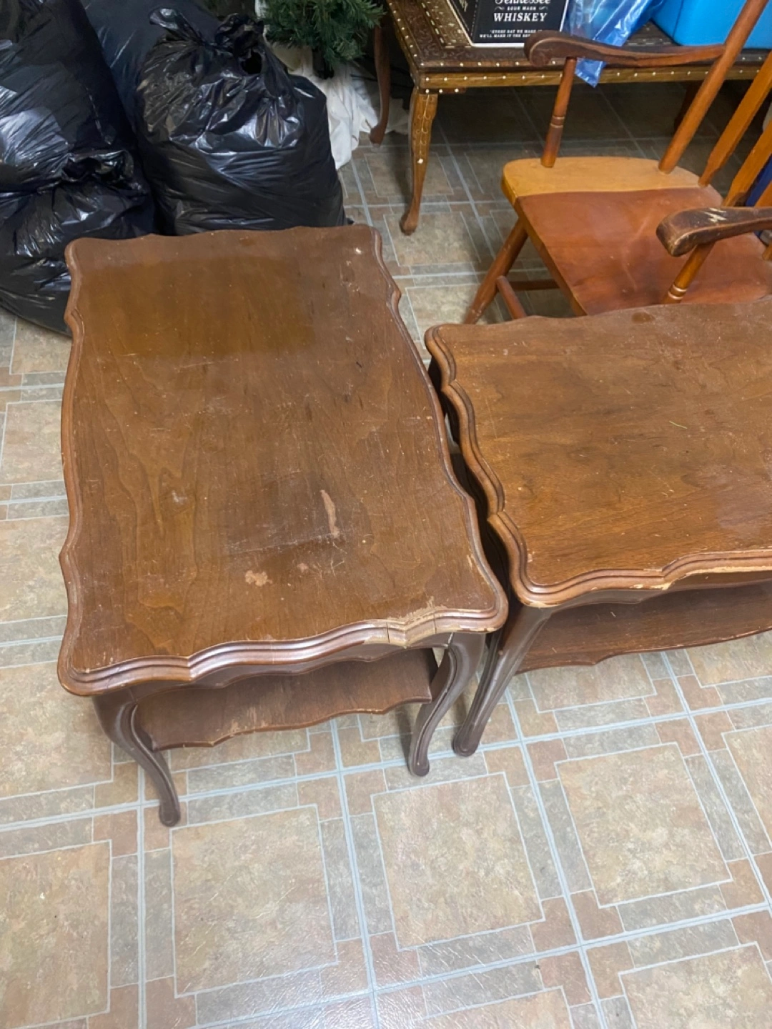 Matching pair of vintage end tables. Dark brown wood finish. Small lower shelf. Slight wear and tear.free pick up hwy 29 smiths falls