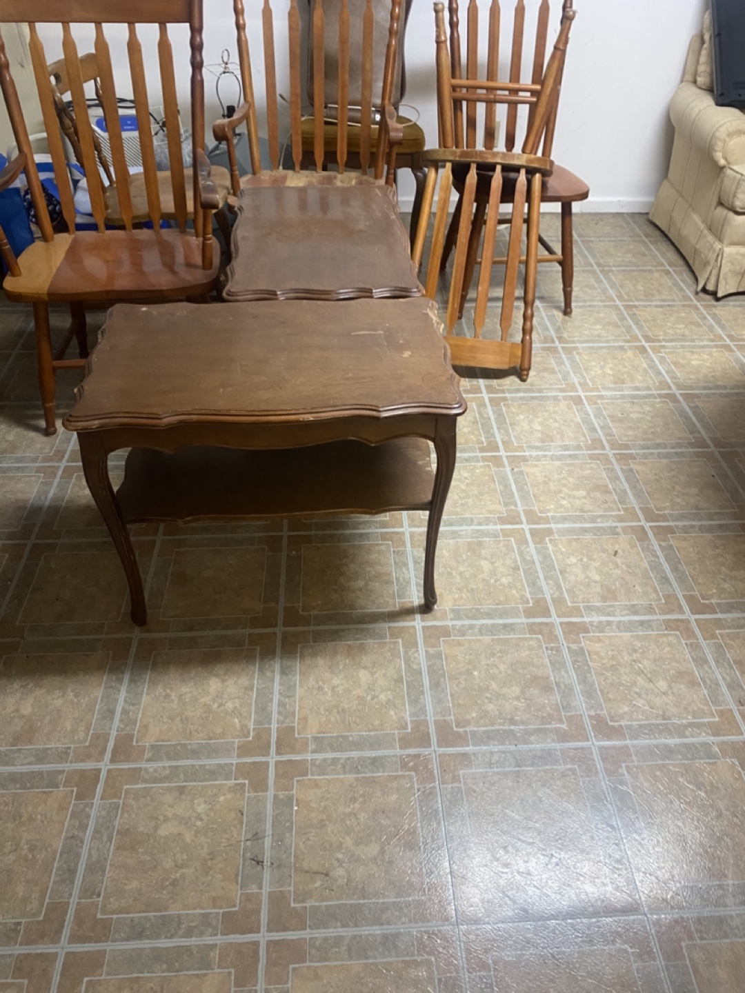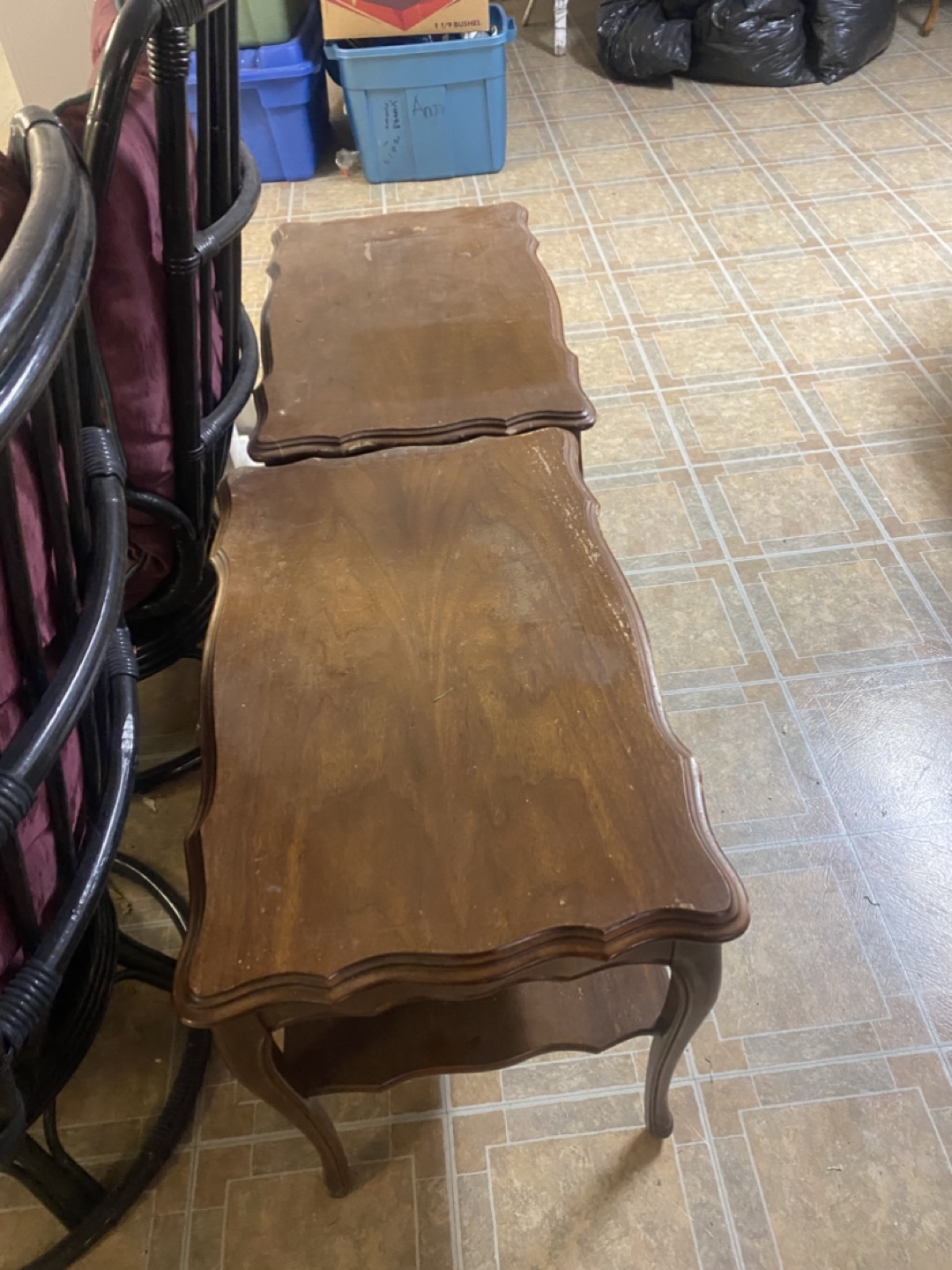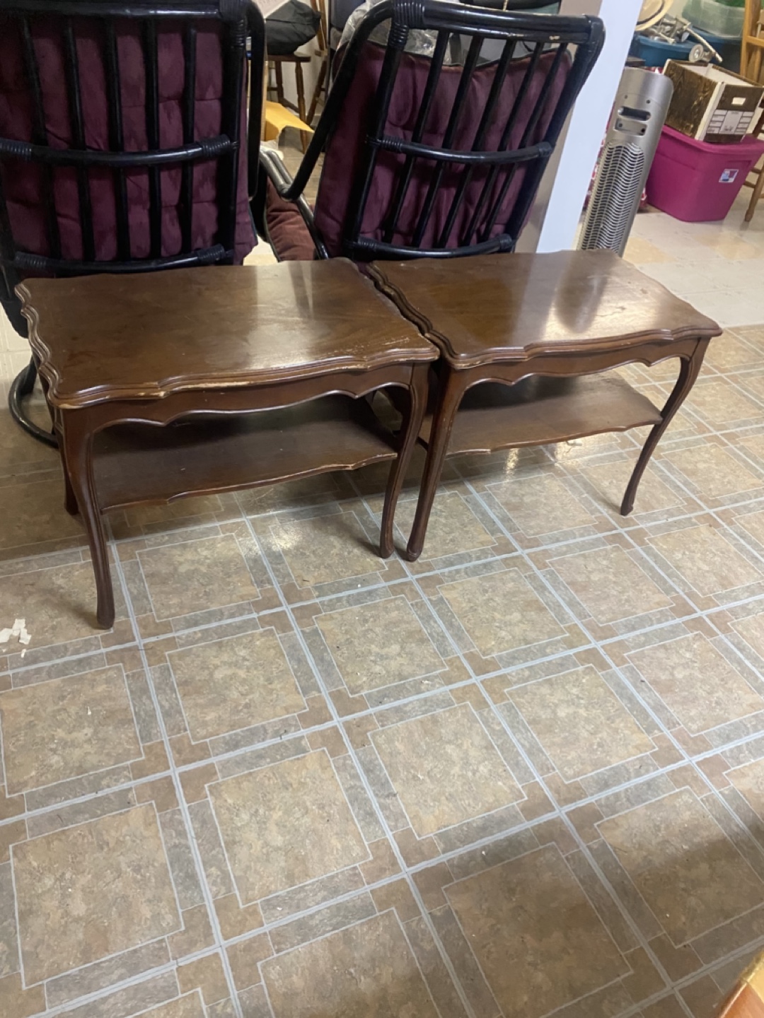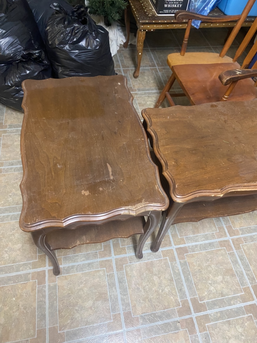 Matching pair of vintage end tables. Dark brown wood finish. Small lower shelf. Slight wear and tear.free pick up hwy 29 smiths falls