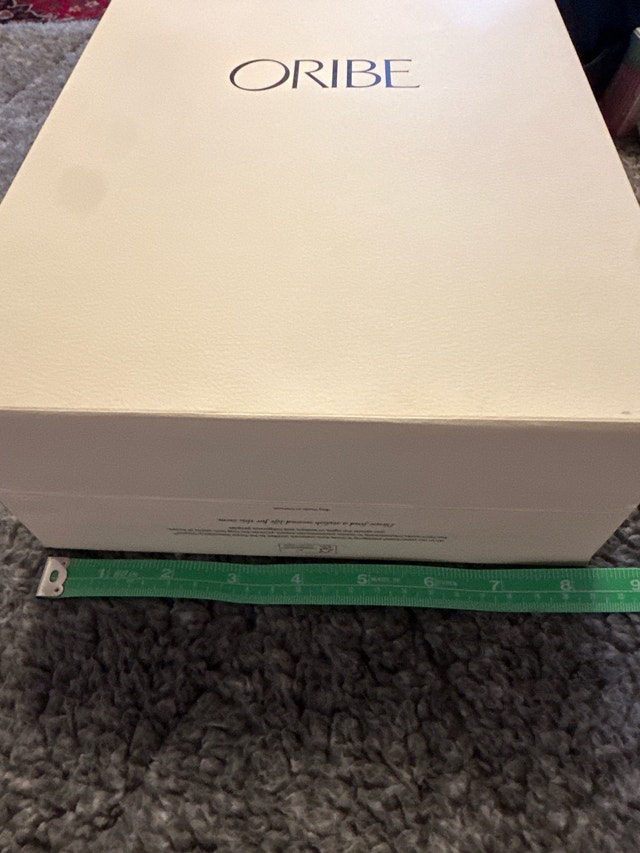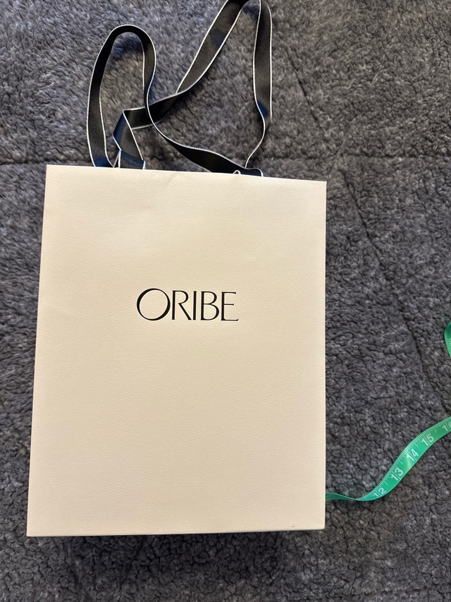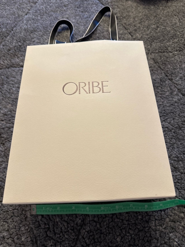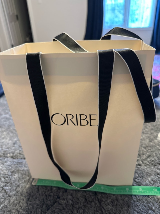 This Oribe shopping bag is perfect for anyone who loves the brand or needs a stylish way to carry items! It's in like-new condition. The bag measures approximately 9 inches wide and 11.5 inches tall. It's ideal for small gifts or organizing your favourite hair products. Please note this is a used item. Brand: Oribe. Dimensions: 9" W x 11.5" H. Colour: Cream with black accents. Material: High-quality, durable paper. I'm asking $10 for this lovely Oribe shopping bag. Prices for similar shopping bags range from $8-$15 on Kijiji. If you're seeing this ad, the bag is still available. Cash accepted.