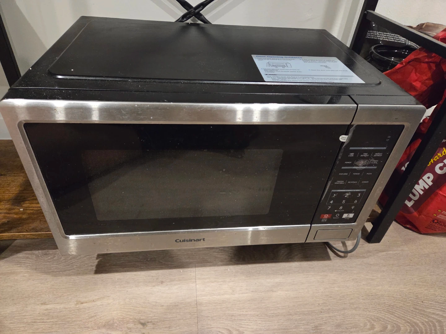 This Cuisinart microwave oven has a stainless steel exterior and multiple cooking presets. It includes a glass turntable and an interior light. It's a great addition for any kitchen!