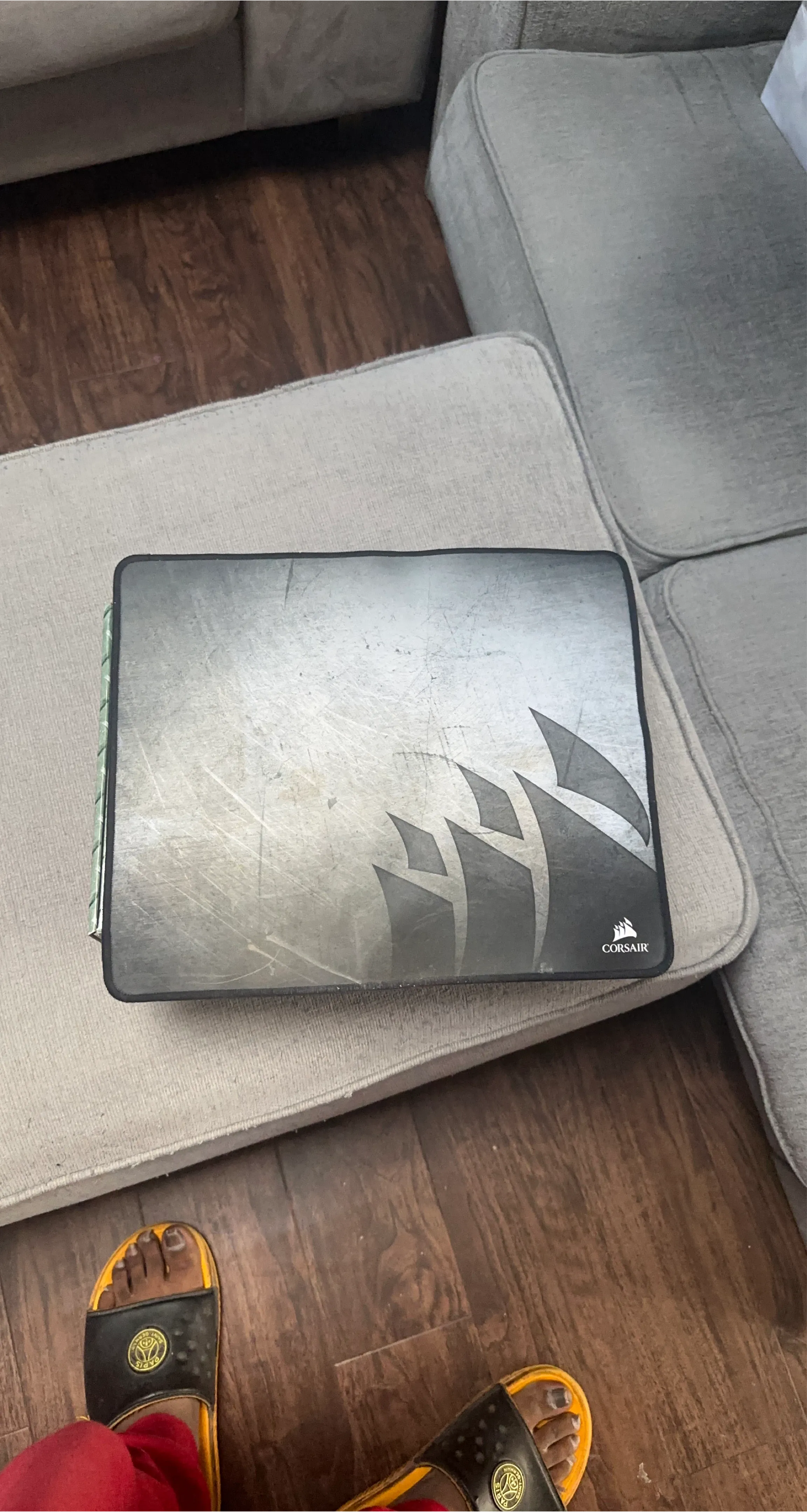 This is a Corsair gaming mouse pad. It's got a great surface for smooth mouse movements. Perfect for gamers who want precision and speed!